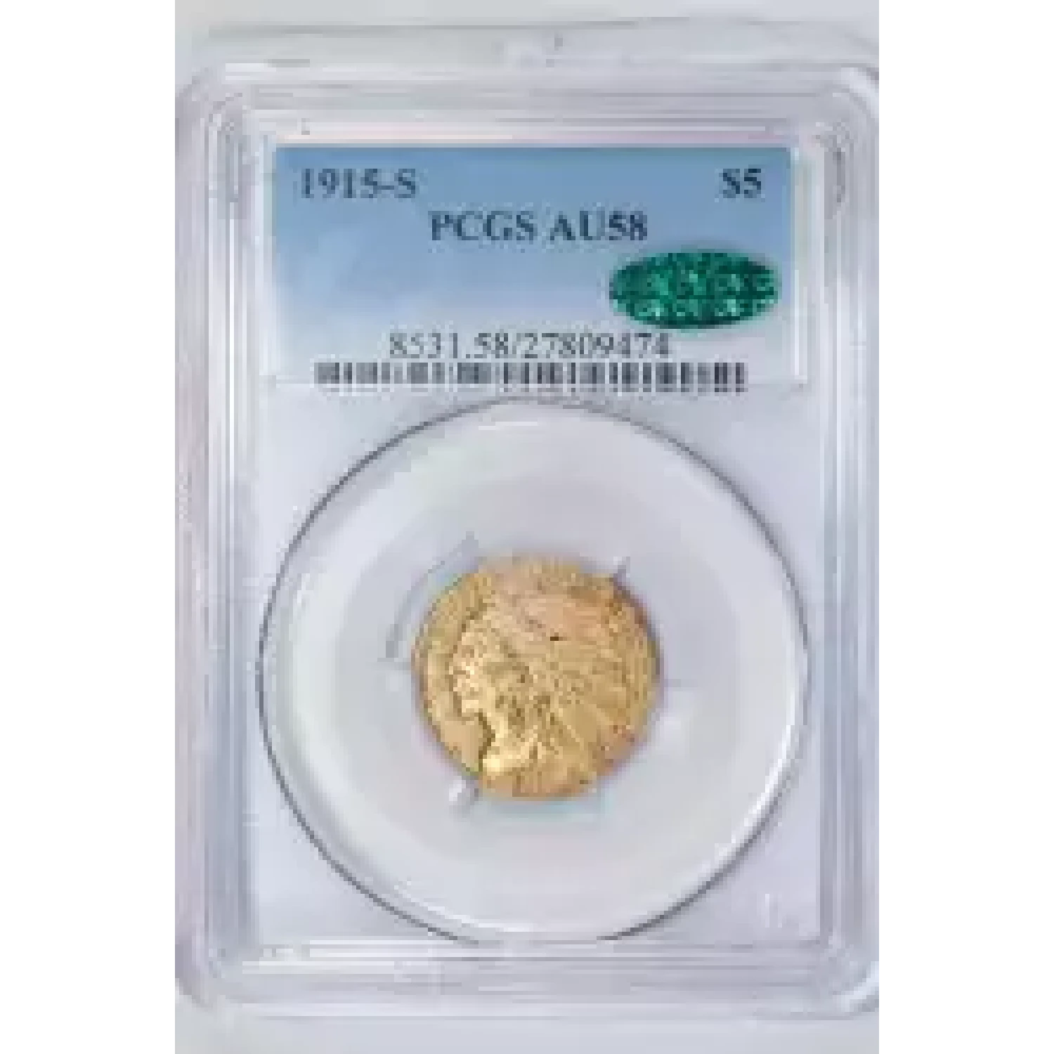 500866 | 1915-S Gold Half Eagles $5 Indian Head PCGS AU-58 CAC | PCGS | AU-58 | Sold: 10/08/2022 | $2,350 |