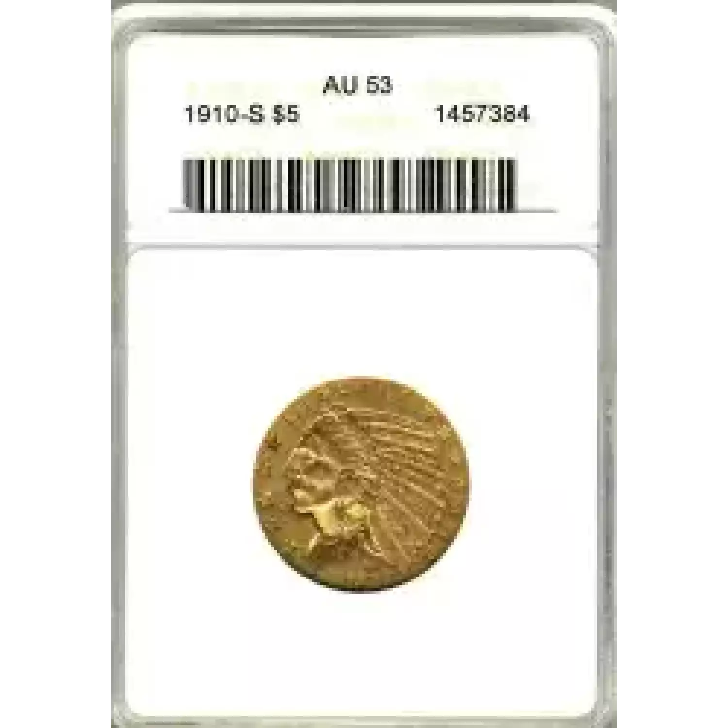503434 | 1910-AU-53 Gold Half Eagles $5 Indian Head ANACS AU-53 | ANACS | AU-53 | Sold: 07/04/2006 | $300 |