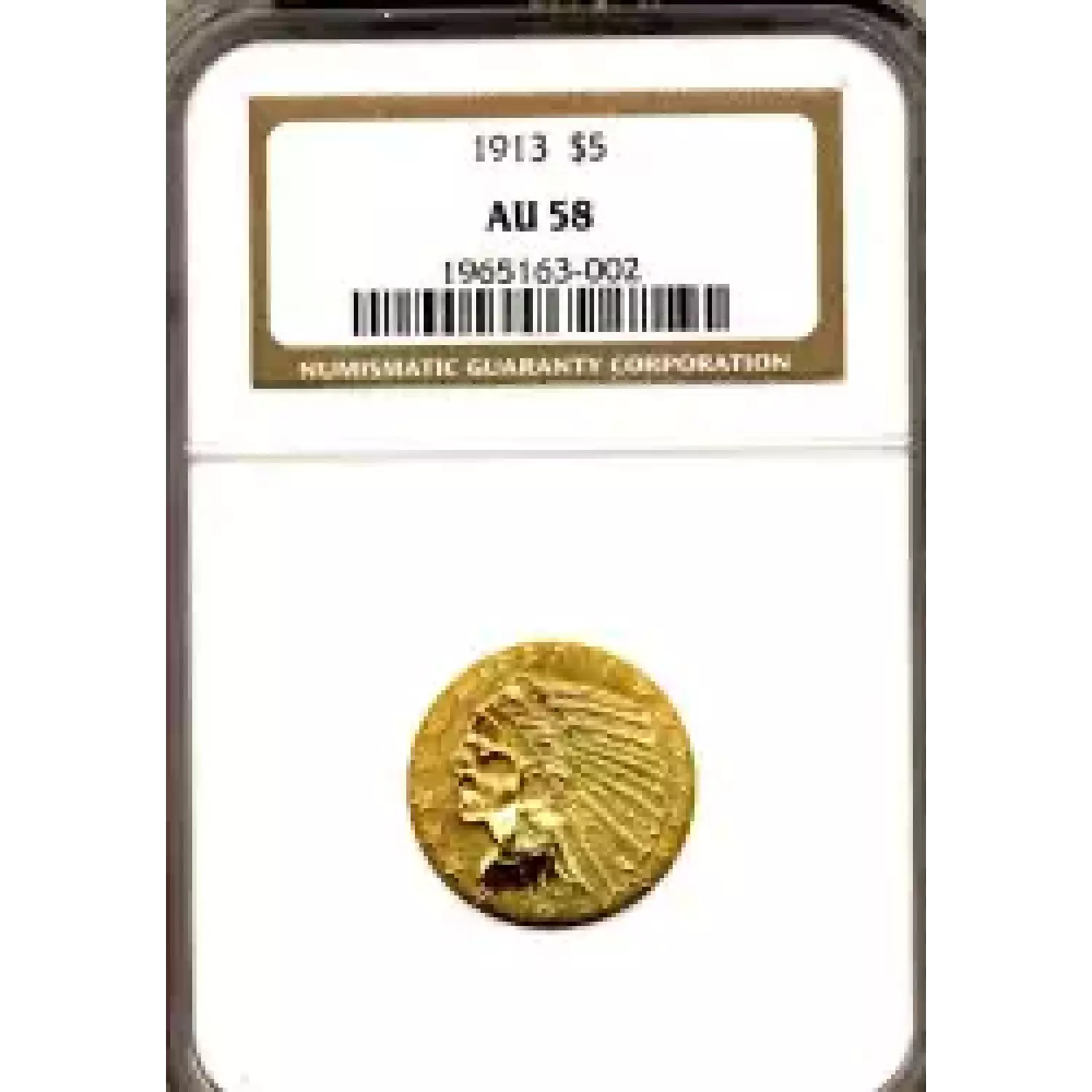 503605 | 1913-AU-58 Gold Half Eagles $5 Indian Head NGC AU-58 | NGC | AU-58 | Sold: 19/05/2007 | $350 |