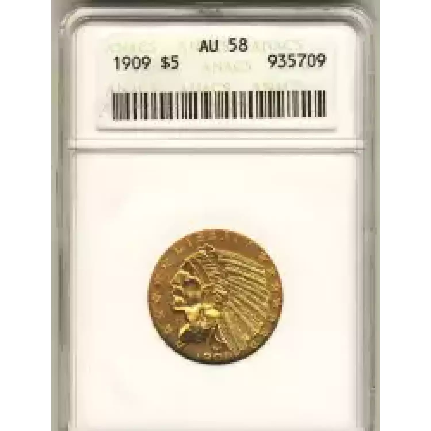 503972 | 1909-AU-58 Gold Half Eagles $5 Indian Head ANACS AU-58 | ANACS | AU-58 | Sold: 03/02/2007 | $330 |