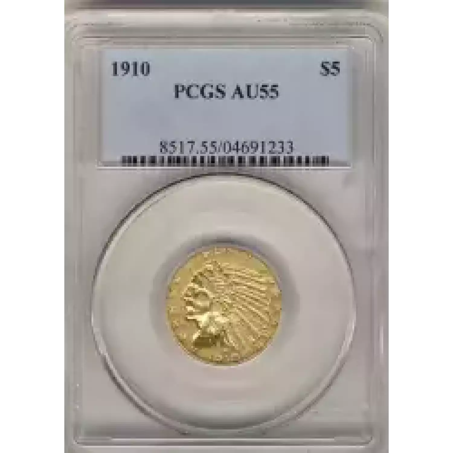 504168 | 1910-AU-55 Gold Half Eagles $5 Indian Head PCGS AU-55 | PCGS | AU-55 | Sold: 13/08/2007 | $359.50 |