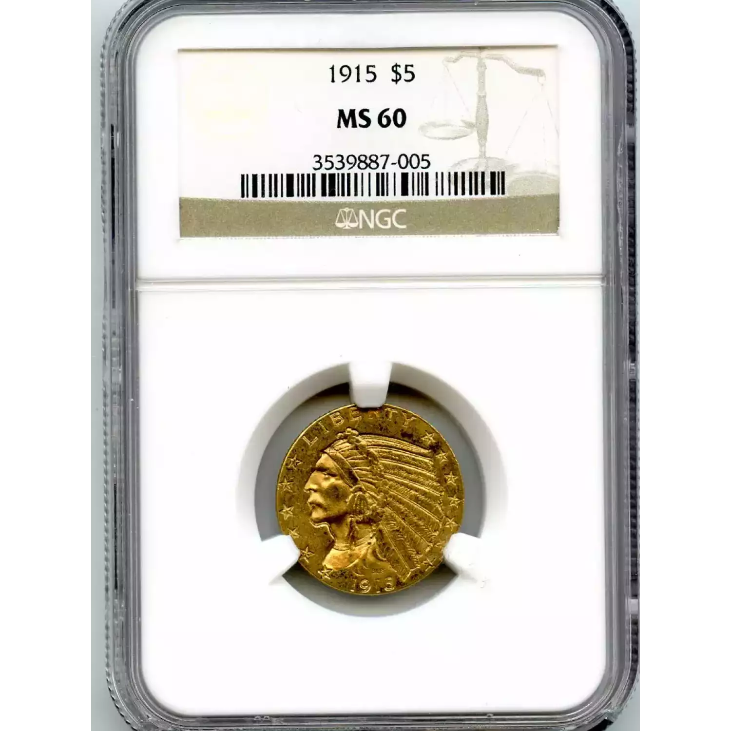 512153 | 1915-MS-60 Gold Half Eagles $5 Indian Head NGC MS-60 | NGC | MS-60 | Sold: 24/02/2019 | $450 |