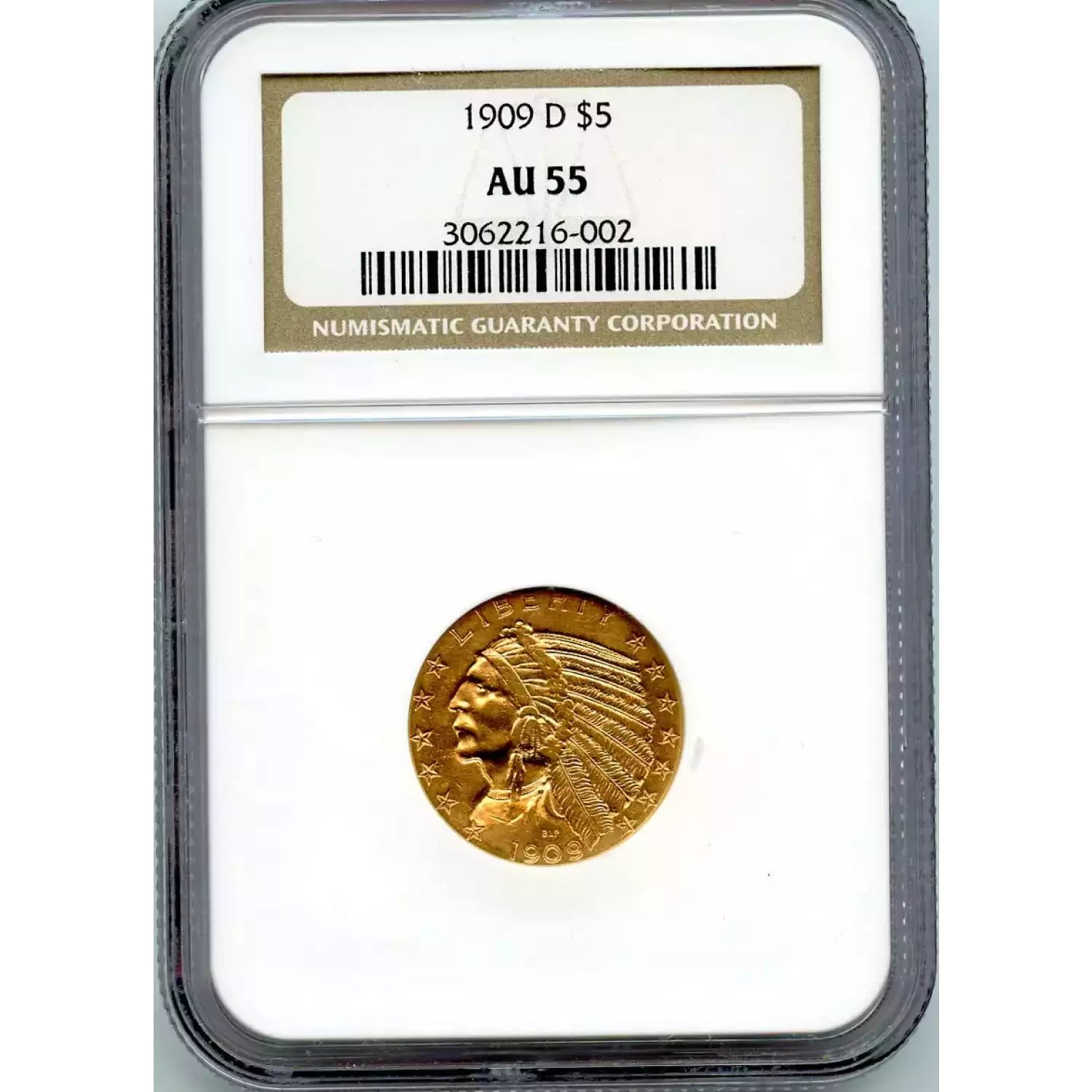 512256 | 1909-AU-55 Gold Half Eagles $5 Indian Head NGC AU-55 | NGC | AU-55 | Sold: 05/11/2018 | $390 |