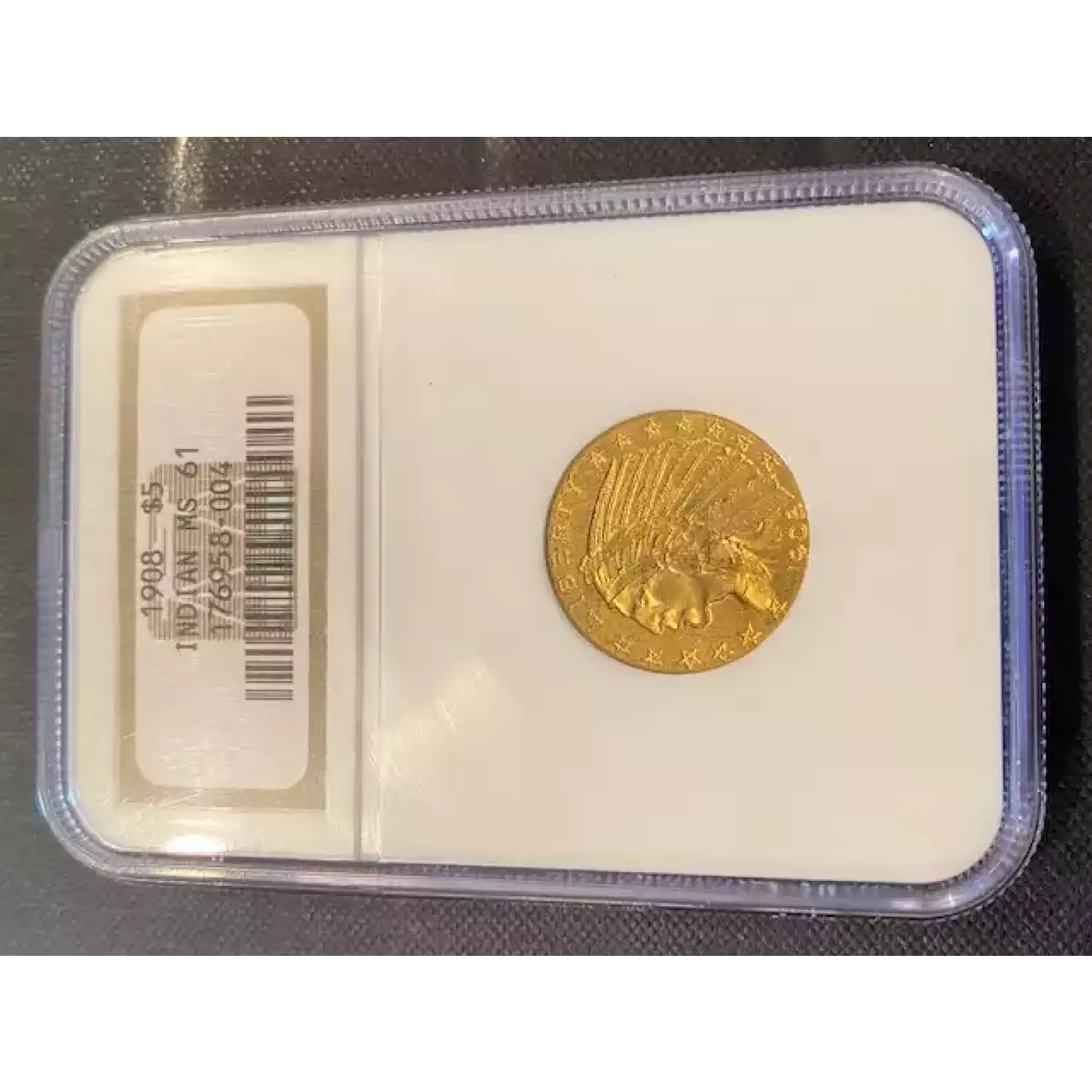 514281 | 1908-MS-61 Gold Half Eagles $5 Indian Head NGC MS-61 | NGC | MS-61 | Sold: 10/01/2021 | $750 |