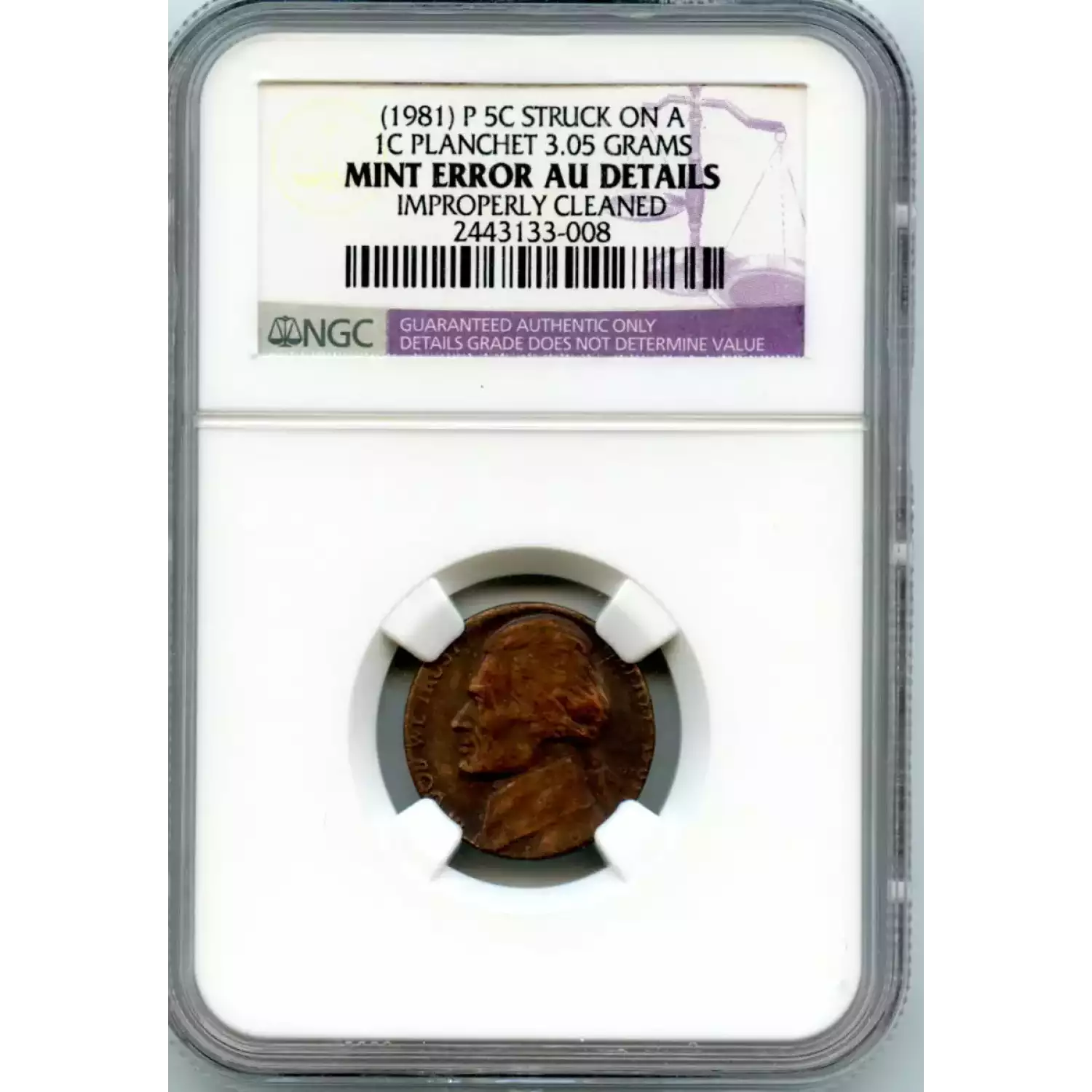506616 | 1981-AU Details Nickel Jefferson NGC AU Details | NGC | AU Details | Sold: 17/01/2016 | $81.05 |