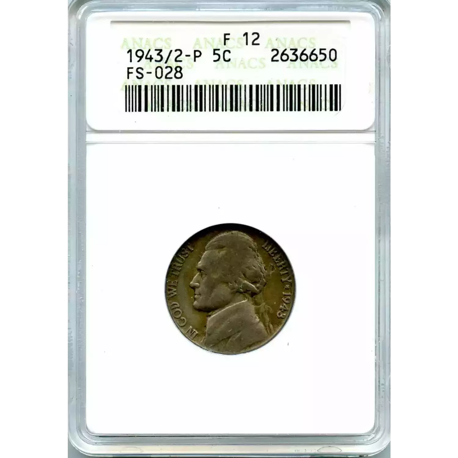 509007 | 1943/2-F-12 Nickel Jefferson ANACS F-12 | ANACS | F-12 | Sold: 12/01/2016 | $50 |