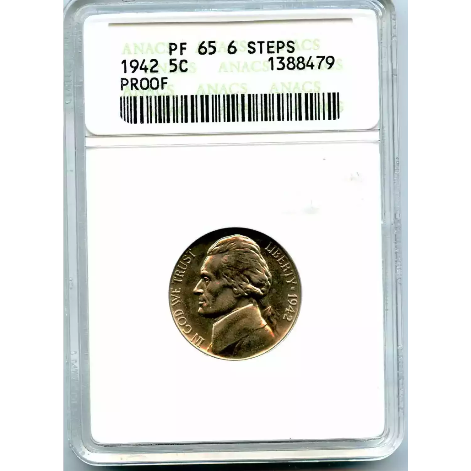 512142 | 1942-PR-65 Nickel Jefferson ANACS PR-65 | ANACS | PR-65 | Sold: 10/11/2018 | $66 |
