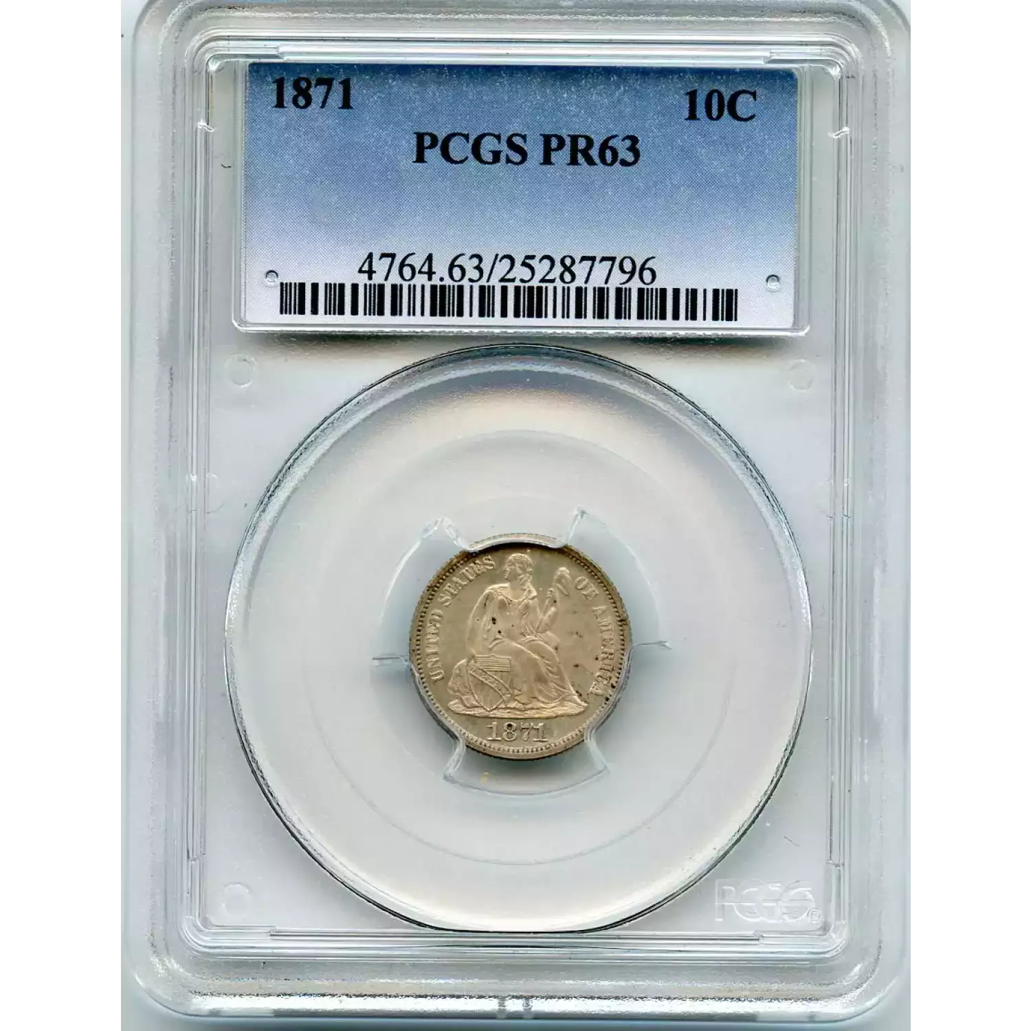 509547 | 1871-PR-63 Liberty Seated Dime PCGS PR-63 | PCGS | PR-63 | Sold: 01/03/2020 | $500 |