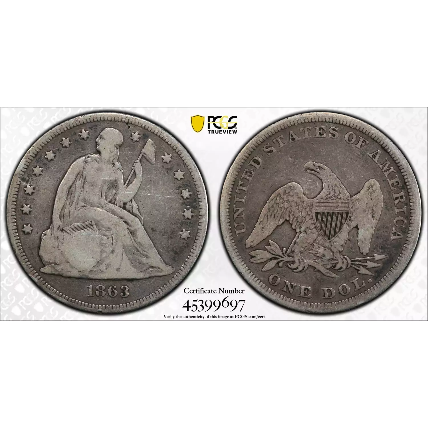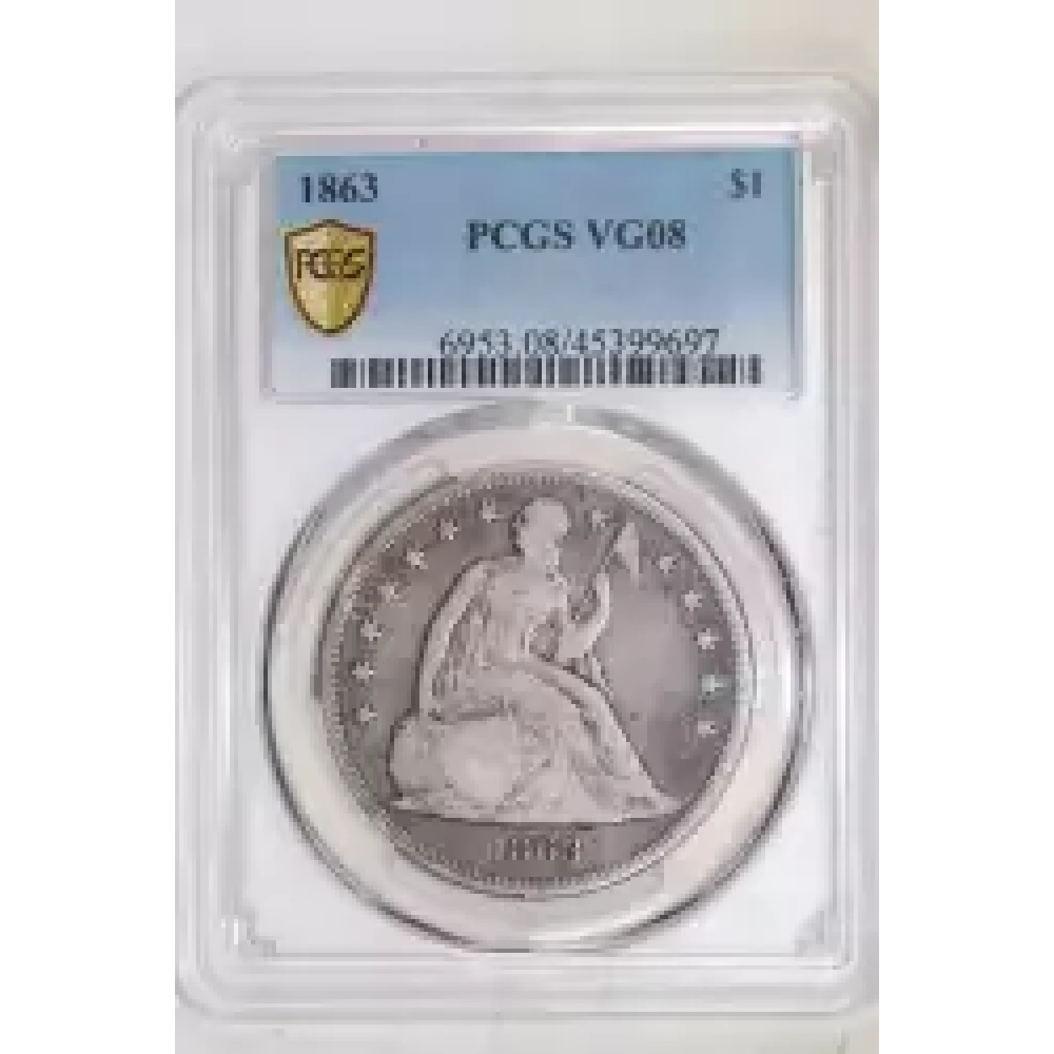 520030 | 1863 Liberty Seated Silver Dollars PCGS VG-8 | PCGS | VG-8 | Sold: 27/11/2023 | $1,895 |