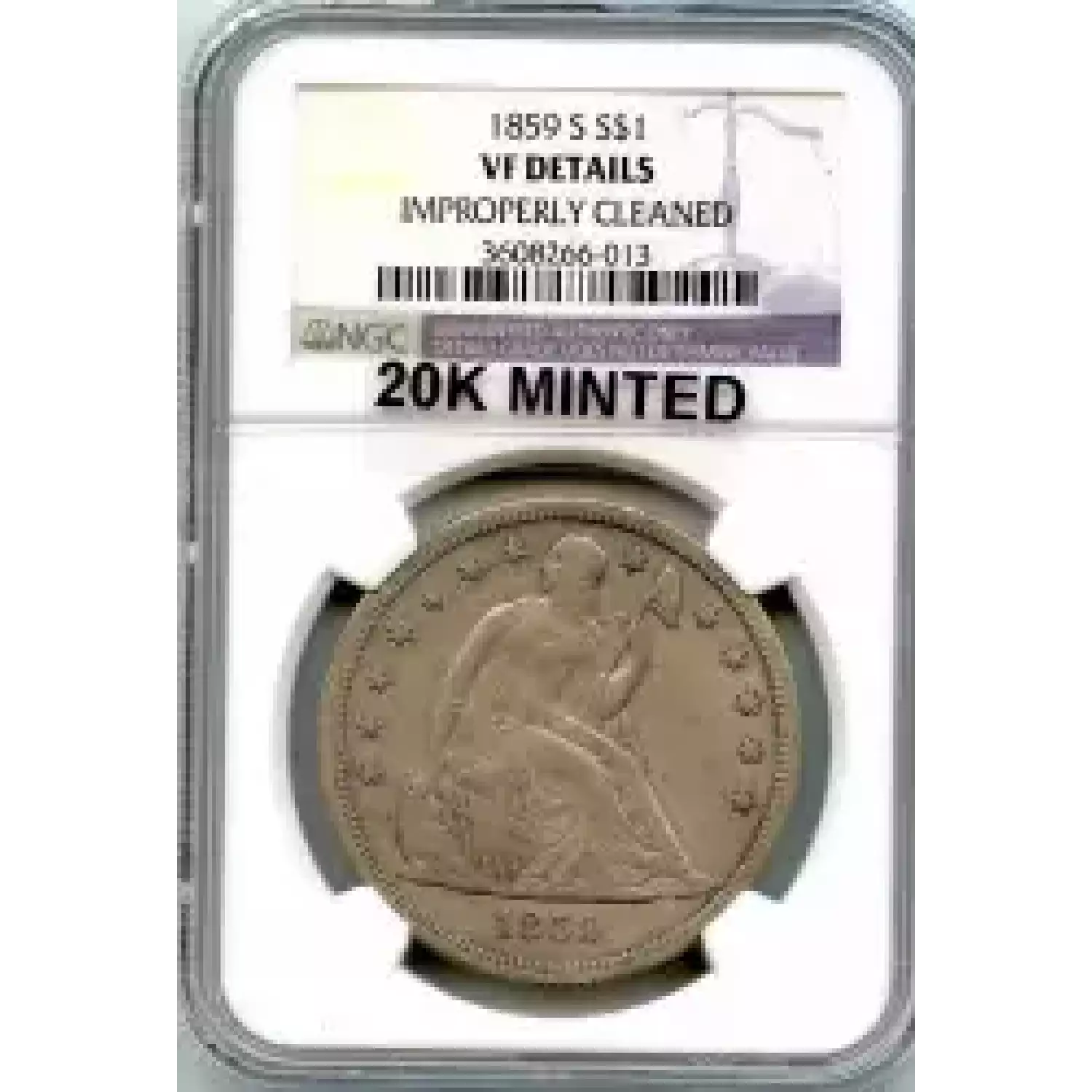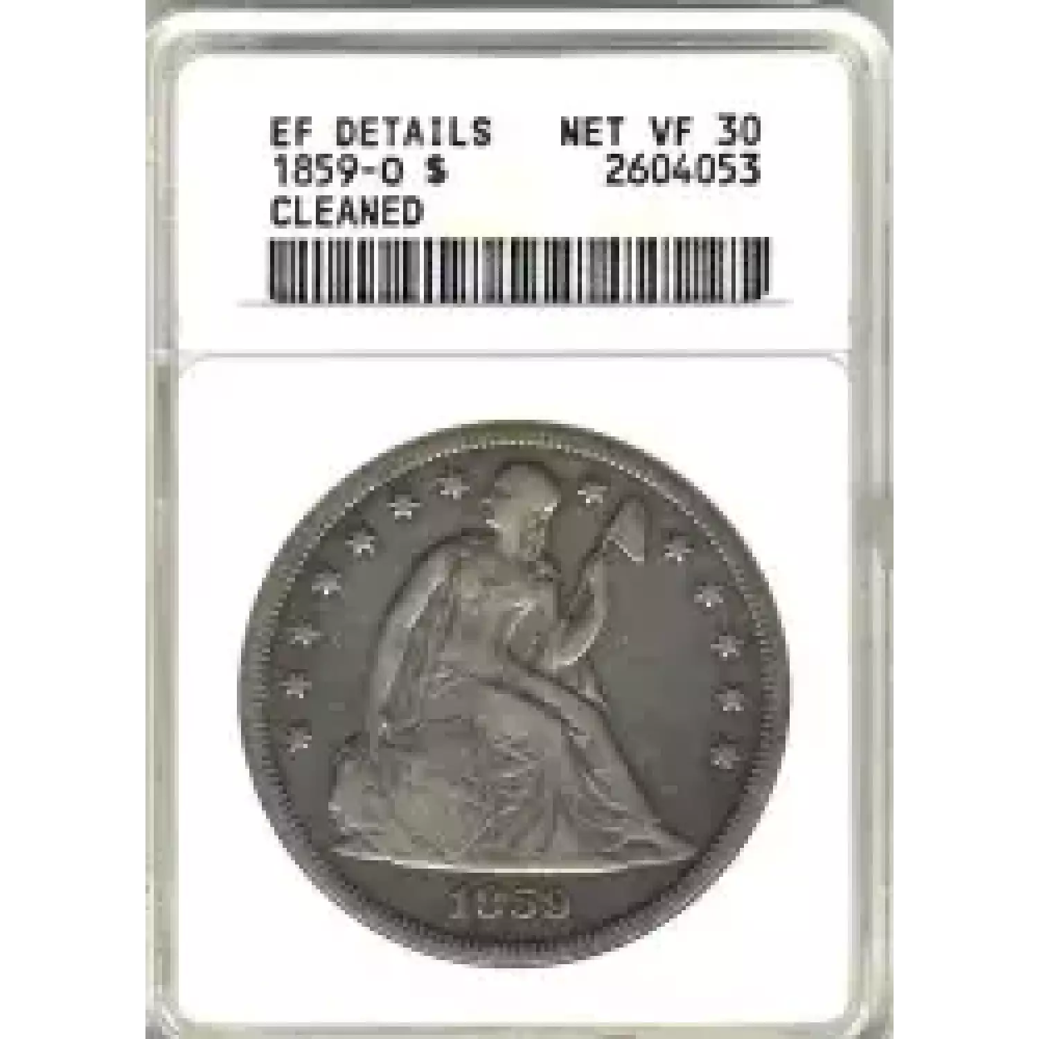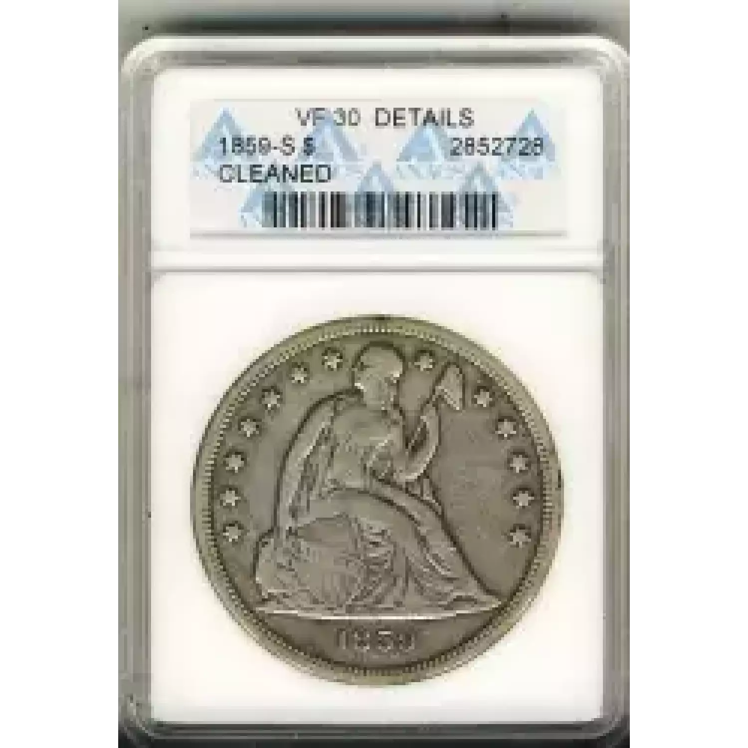 504433 | 1859-VF Details Liberty Seated Silver Dollars ANACS VF Details CLEANED | ANACS | VF Details | Sold: 15/11/2008 | $700 |