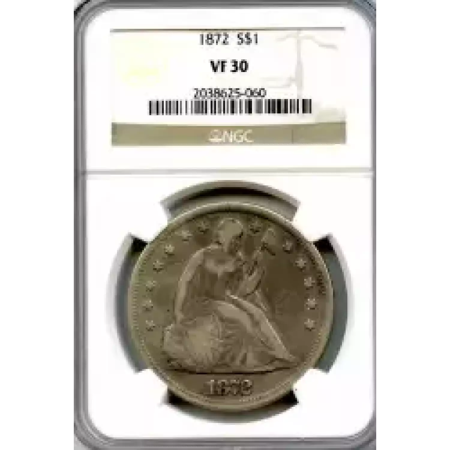 507100 | 1872-VF-30 Liberty Seated Silver Dollars NGC VF-30 | NGC | VF-30 | Sold: 29/04/2014 | $370 |