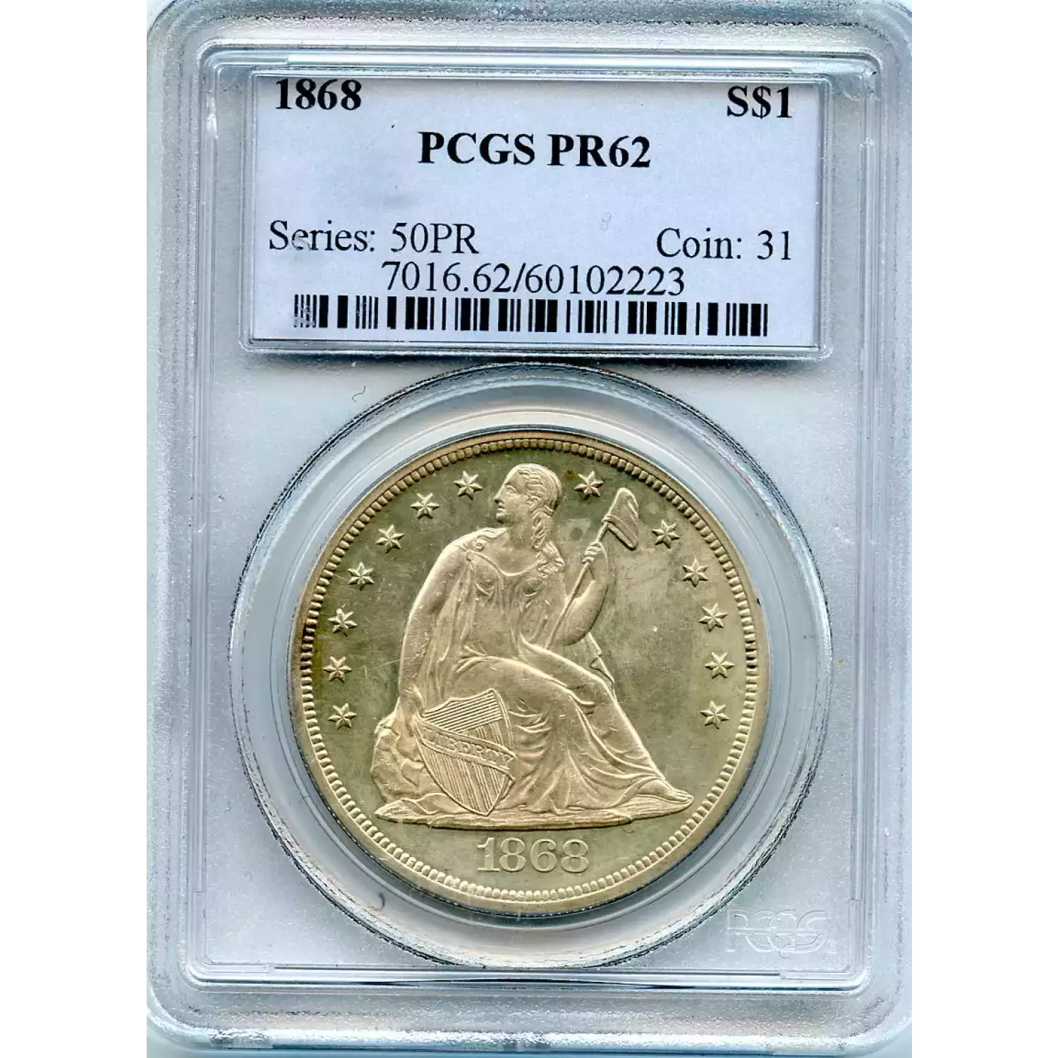 510420 | 1868-PR-62 Liberty Seated Silver Dollars PCGS PR-62 | PCGS | PR-62 | Sold: 09/08/2017 | $3,100 |