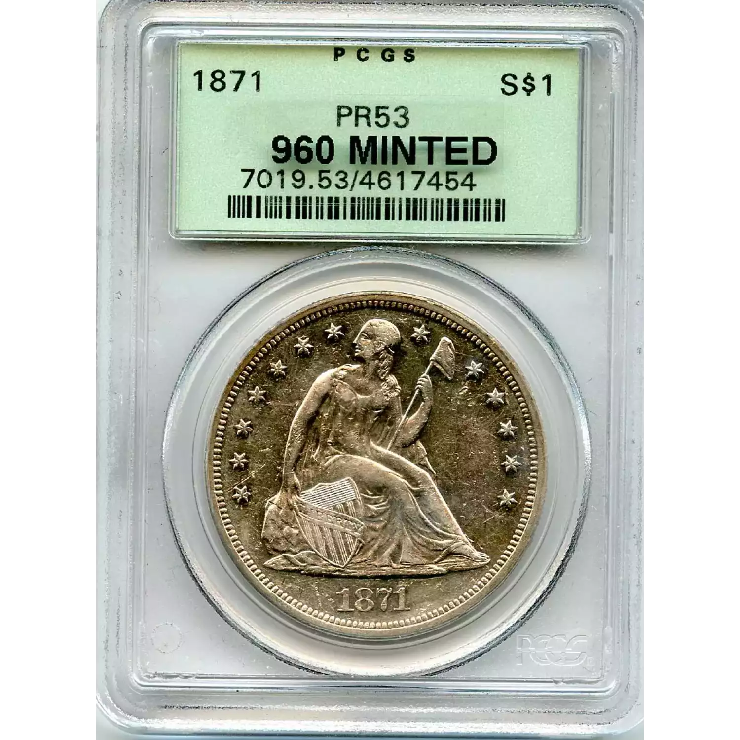 510499 | 1871-PR-53 Liberty Seated Silver Dollars PCGS PR-53 | PCGS | PR-53 | Sold: 04/06/2017 | $1,000 |