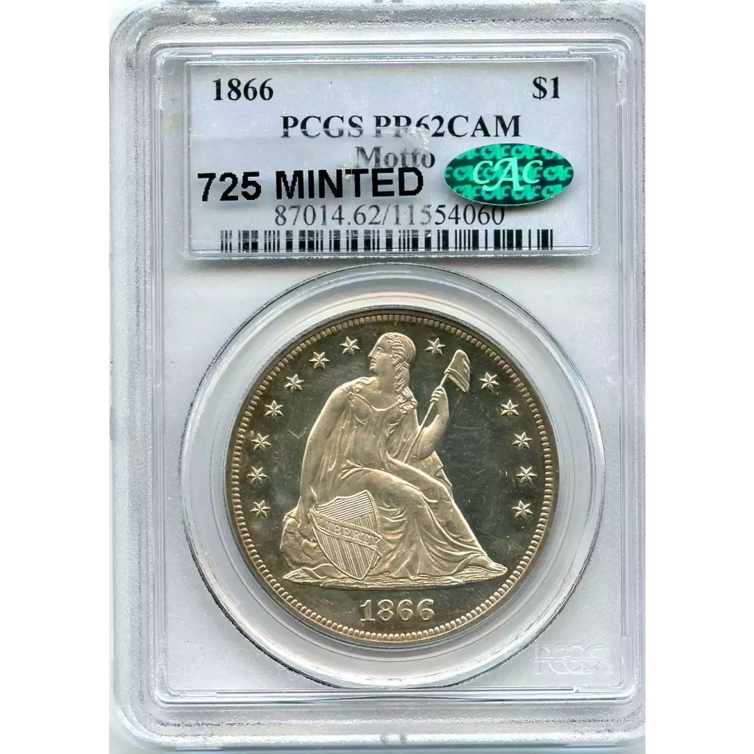 511912 | 1866-PR-62 Liberty Seated Silver Dollars PCGS PR-62 CAM CAC | PCGS | PR-62 | Sold: 15/08/2018 | $3,500 |