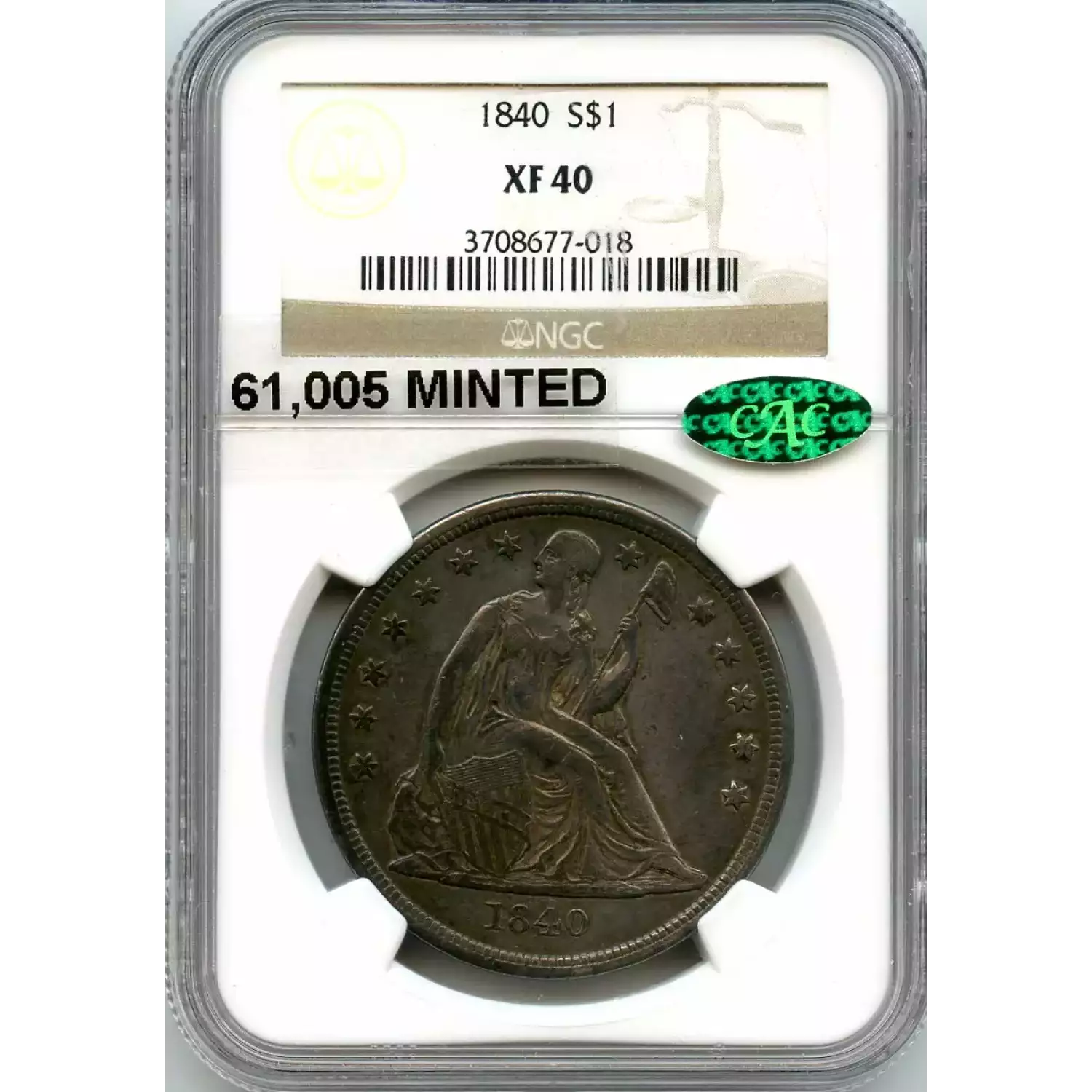 512859 | 1840-XF-40 Liberty Seated Silver Dollars NGC XF-40 CAC | NGC | XF-40 | Sold: 05/08/2019 | $830 |