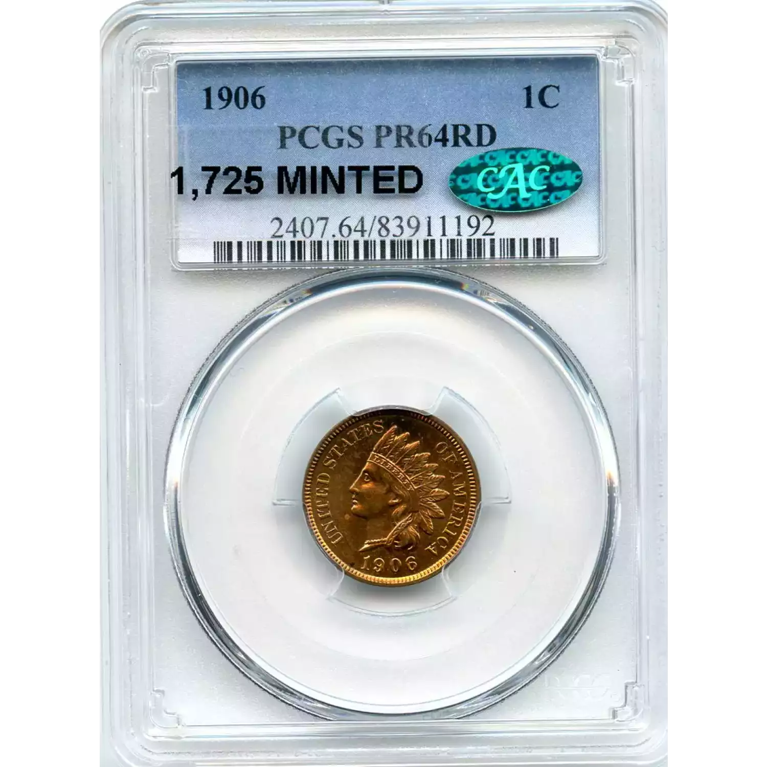 510907 | 1906-PR-64 Small Cents Lincoln, Memorial Reverse PCGS PR-64 RD CAC | PCGS | PR-64 | Sold: 04/05/2019 | $630 |