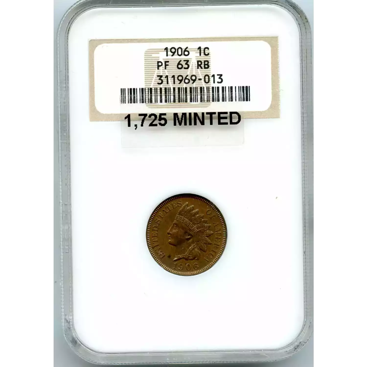 512317 | 1906-PR-63 Small Cents Lincoln, Memorial Reverse NGC PR-63 RB | NGC | PR-63 | Sold: 27/05/2019 | $325 |