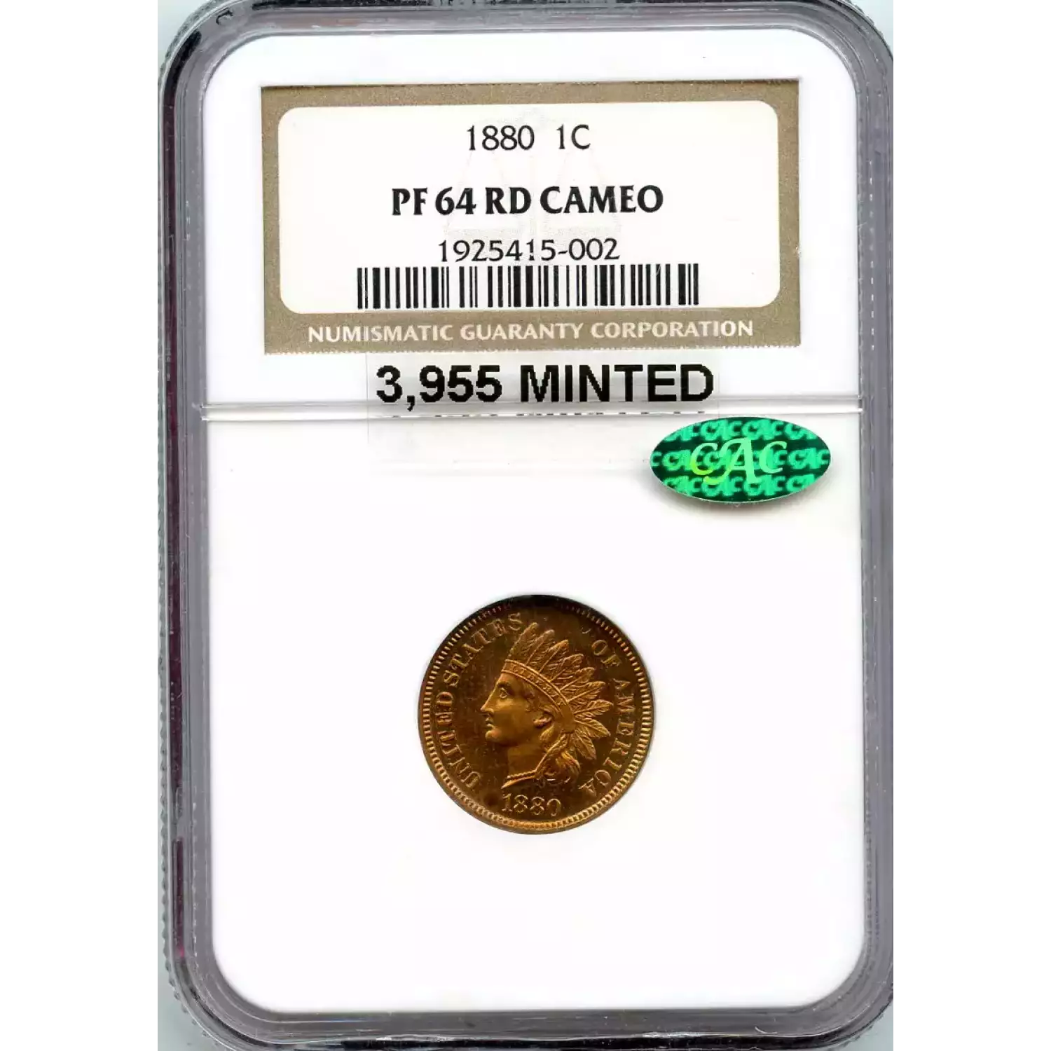512615 | 1880-PR-64 Small Cents Lincoln, Memorial Reverse NGC PR-64 RD CAMEO CAC | NGC | PR-64 | Sold: 07/04/2019 | $1,000 |