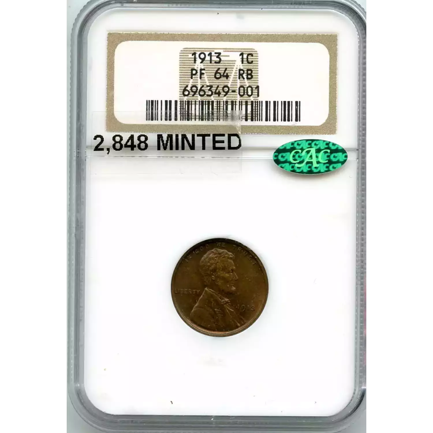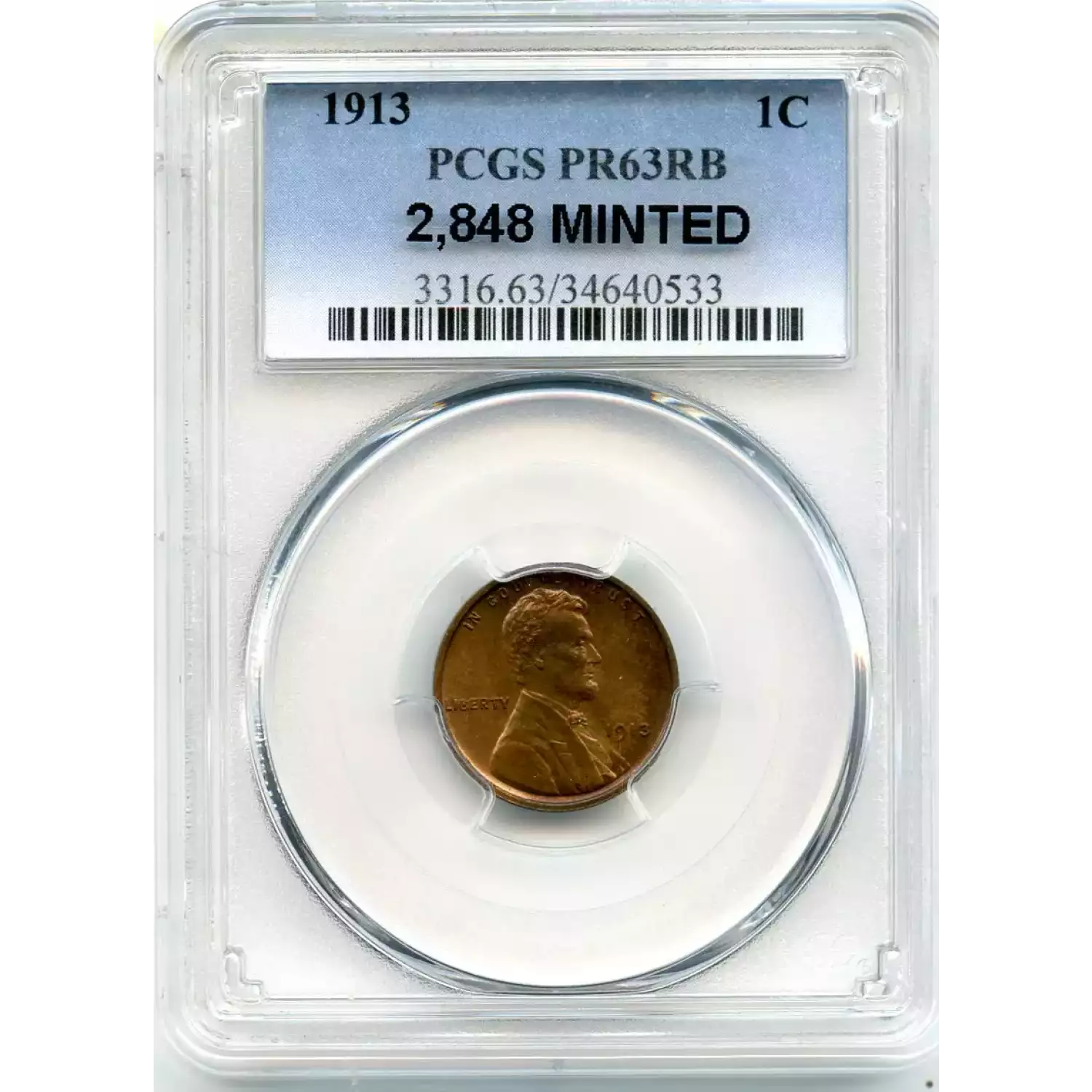512168 | 1913-PR-63 Small Cents Lincoln, Wheat Ears Reverse PCGS PR-63 RB | PCGS | PR-63 | Sold: 27/01/2019 | $550 |