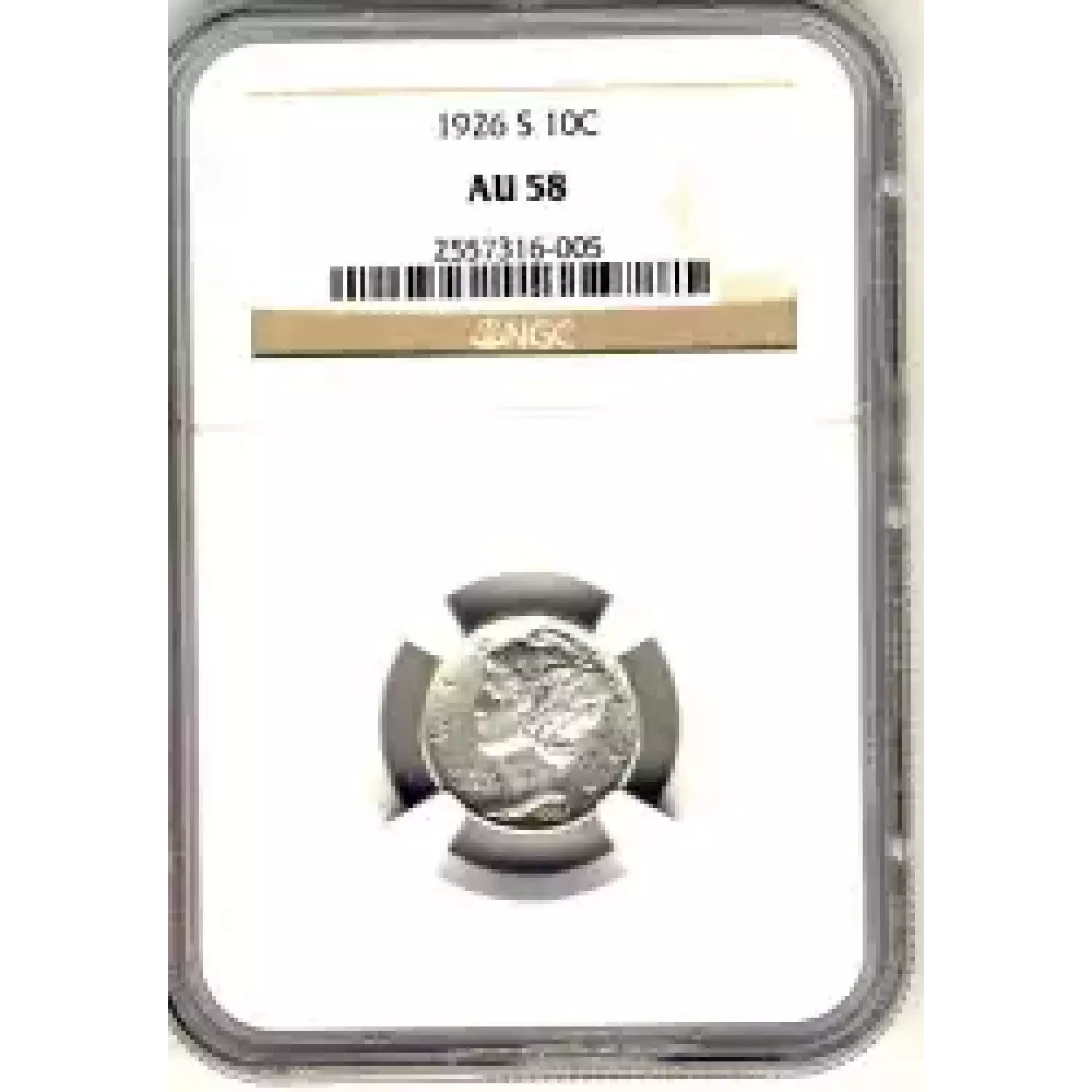 505614 | 1926-AU-58 Dimes Winged Liberty Head or Mercury NGC AU-58 | NGC | AU-58 | Sold: 17/08/2011 | $625 |