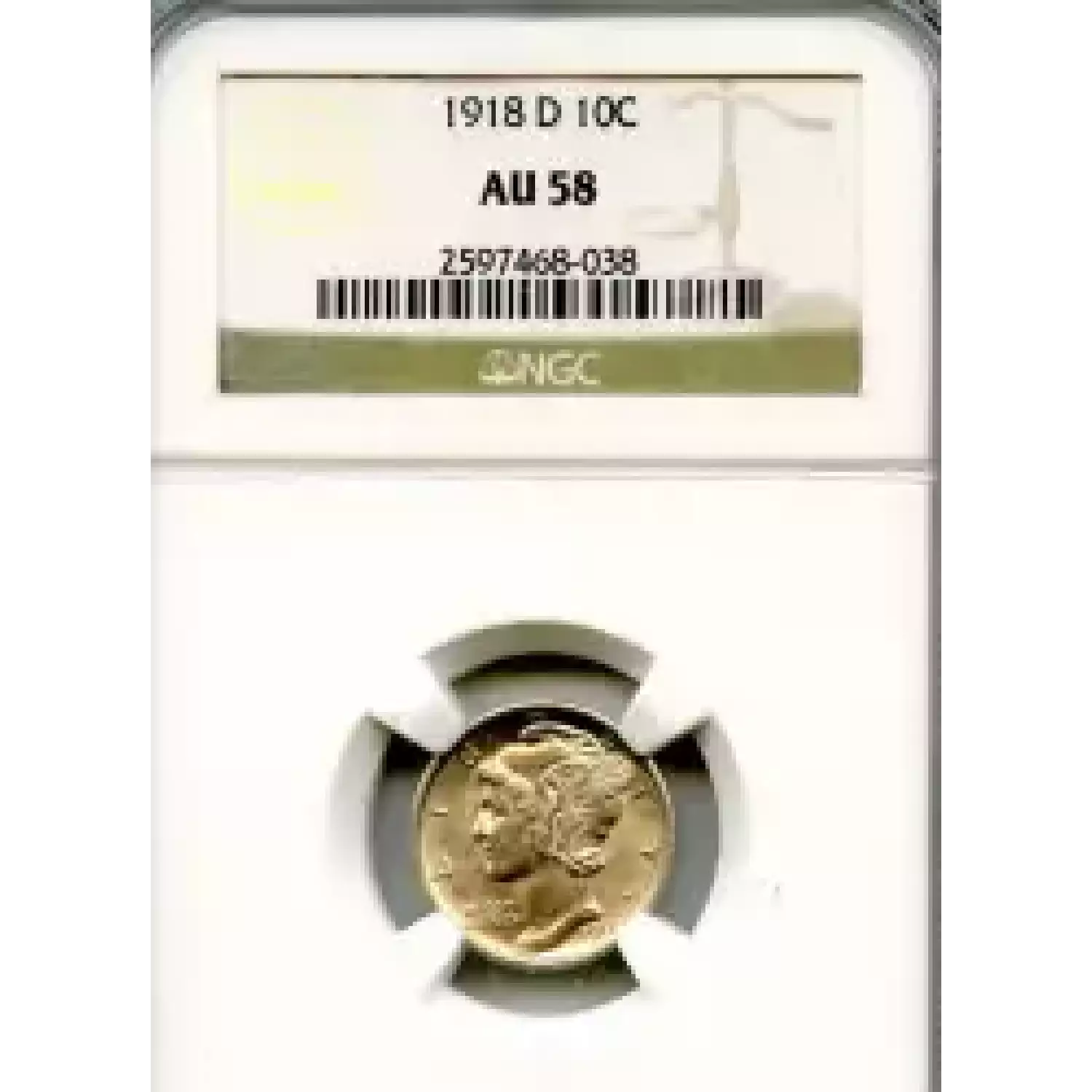 506473 | 1918-AU-58 Dimes Winged Liberty Head or Mercury NGC AU-58 | NGC | AU-58 | Sold: 03/05/2013 | $100 |