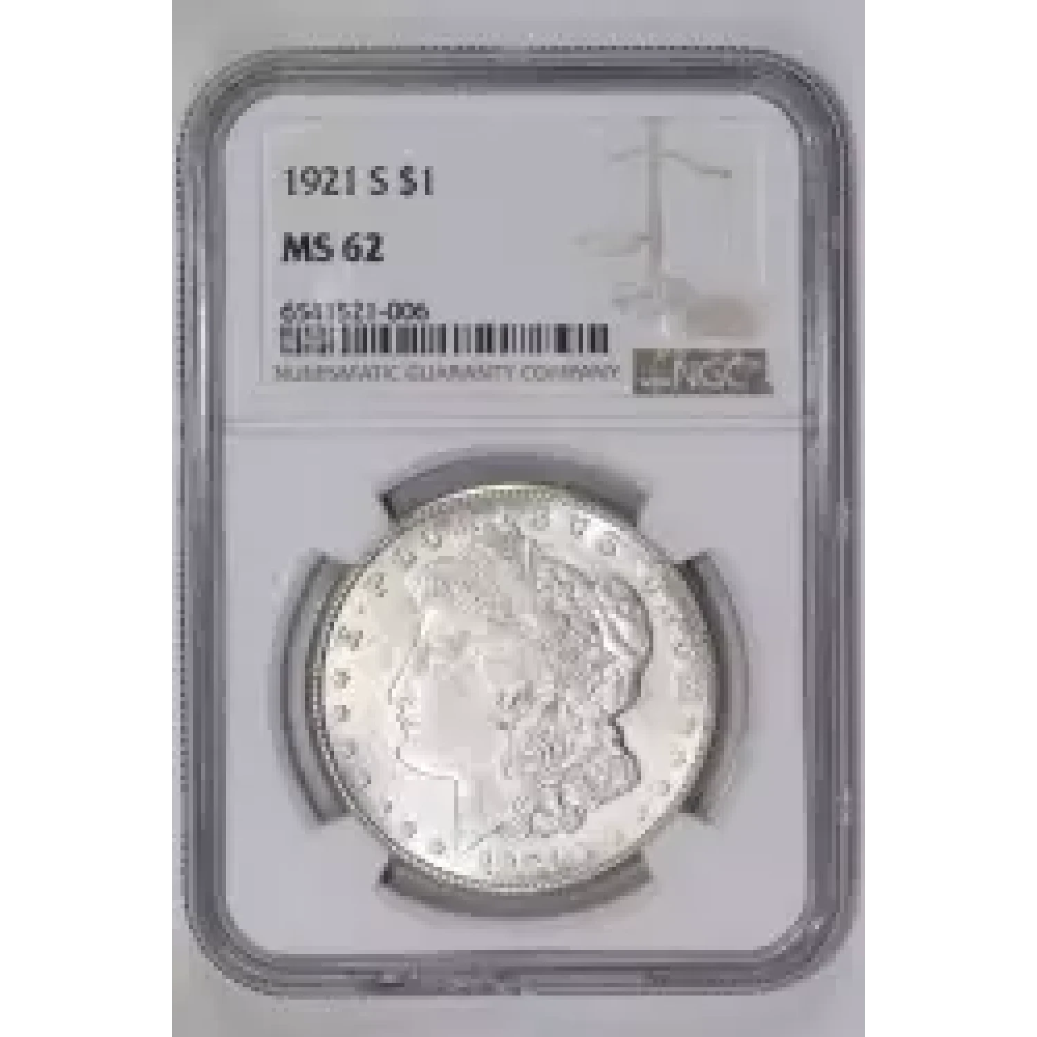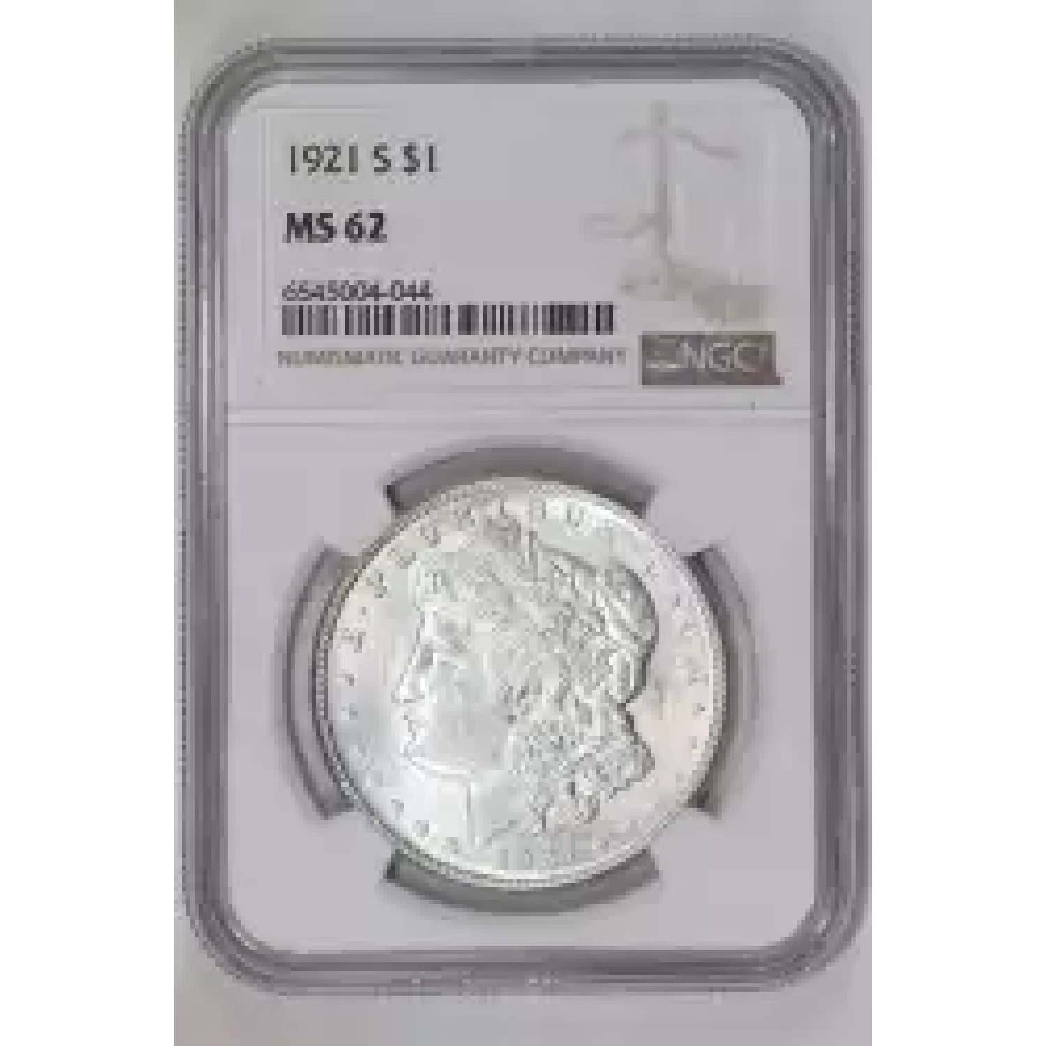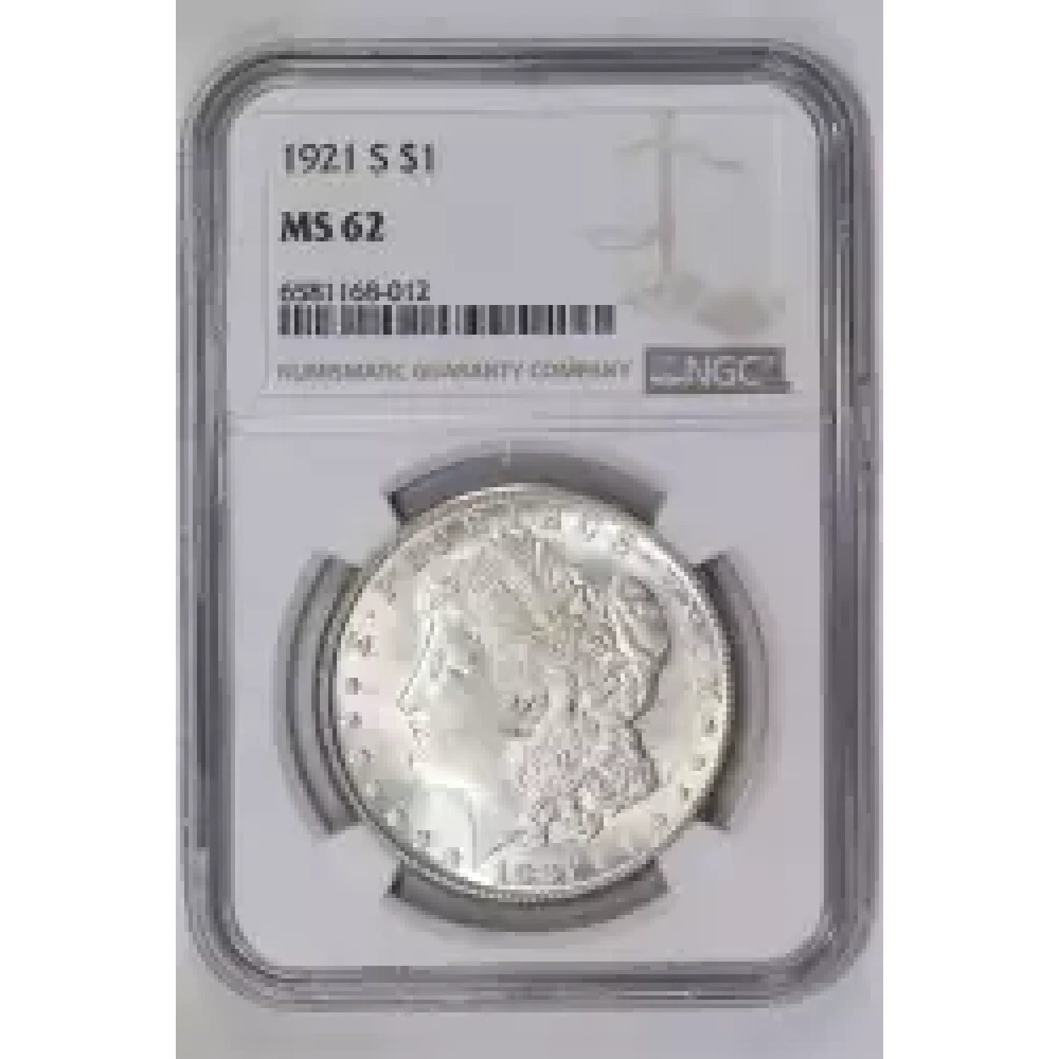 518010 | 1921-S Morgan Silver Dollar NGC MS-62 | NGC | MS-62 | Sold: 07/08/2023 | $90 |