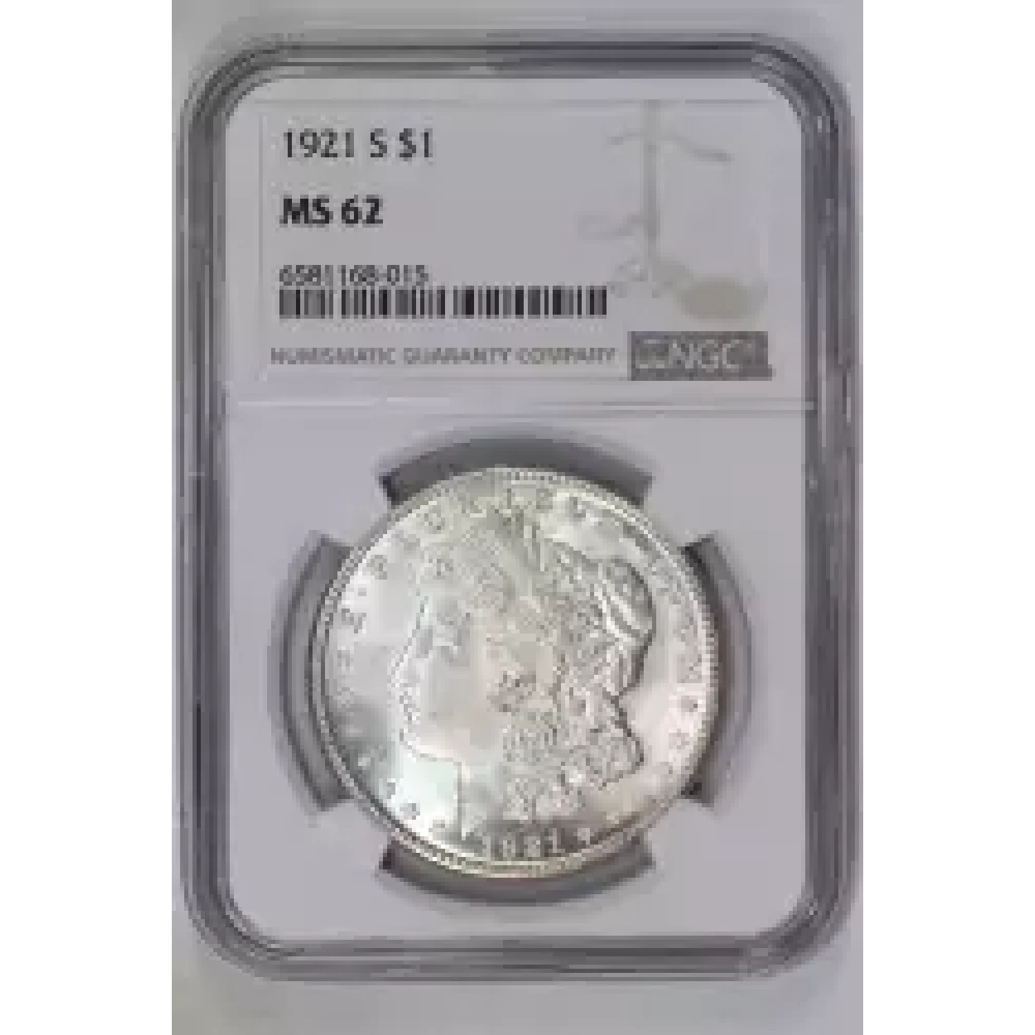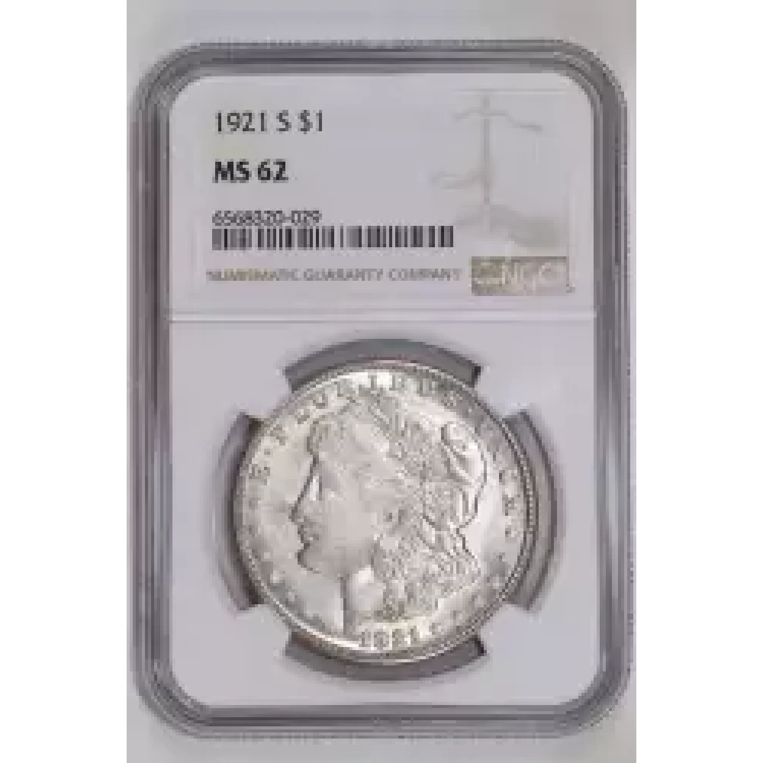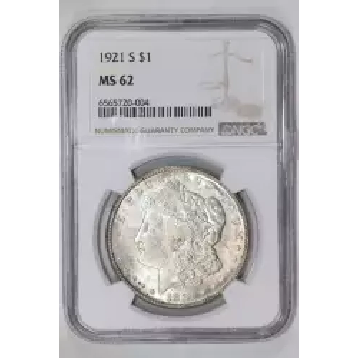 518010 | 1921-S Morgan Silver Dollar NGC MS-62 | NGC | MS-62 | Sold: 07/08/2023 | $90 |