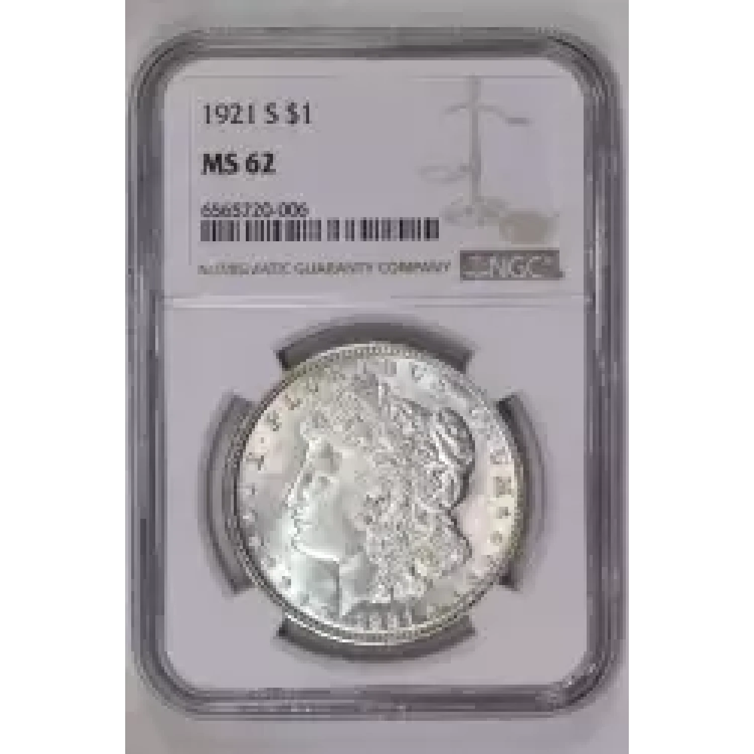 518006 | 1921-S Morgan Silver Dollar NGC MS-62 | NGC | MS-62 | Sold: 30/01/2024 | $90 |