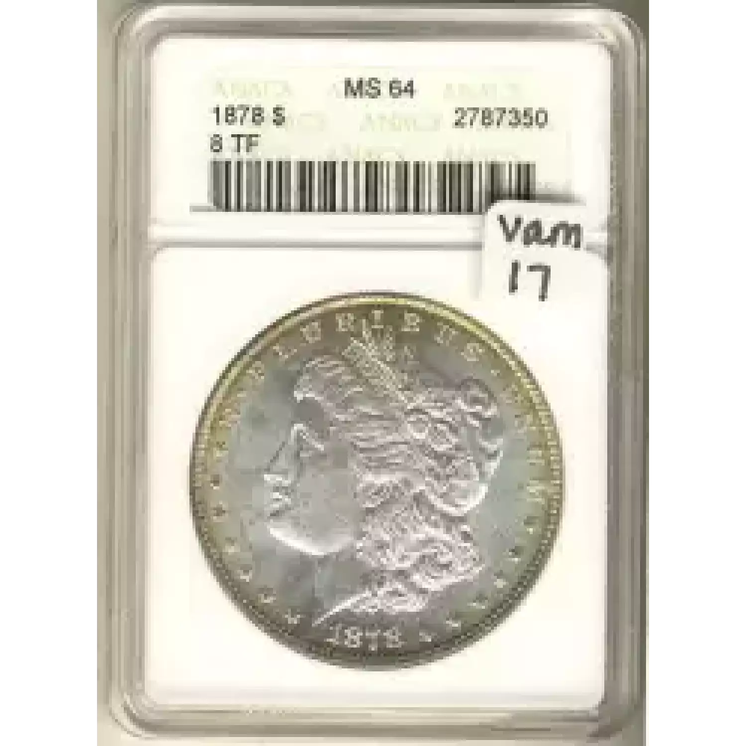 504840 | 1878-MS-64 Morgan Silver Dollar ANACS MS-64 | ANACS | MS-64 | Sold: 17/05/2009 | $330 |