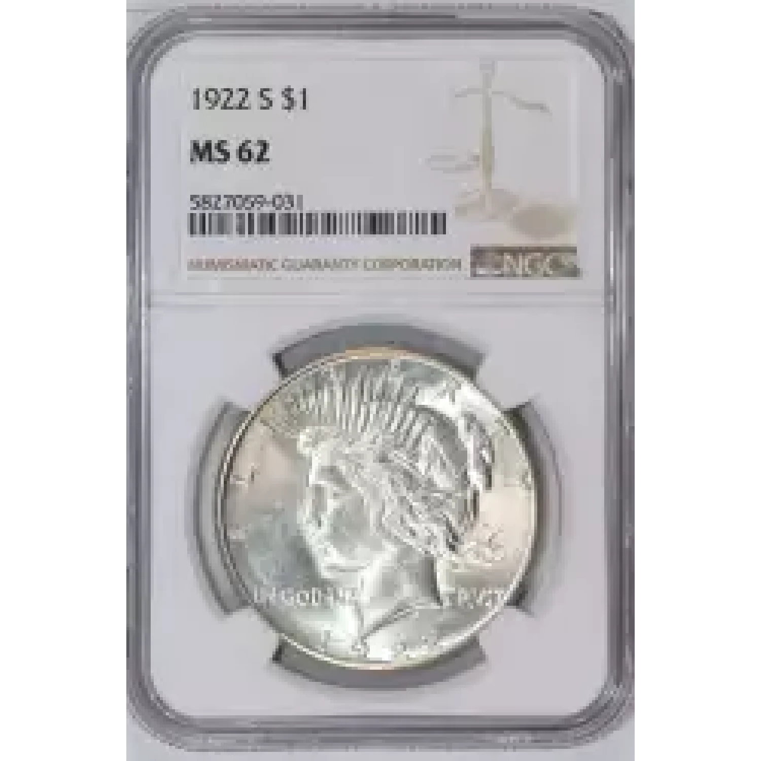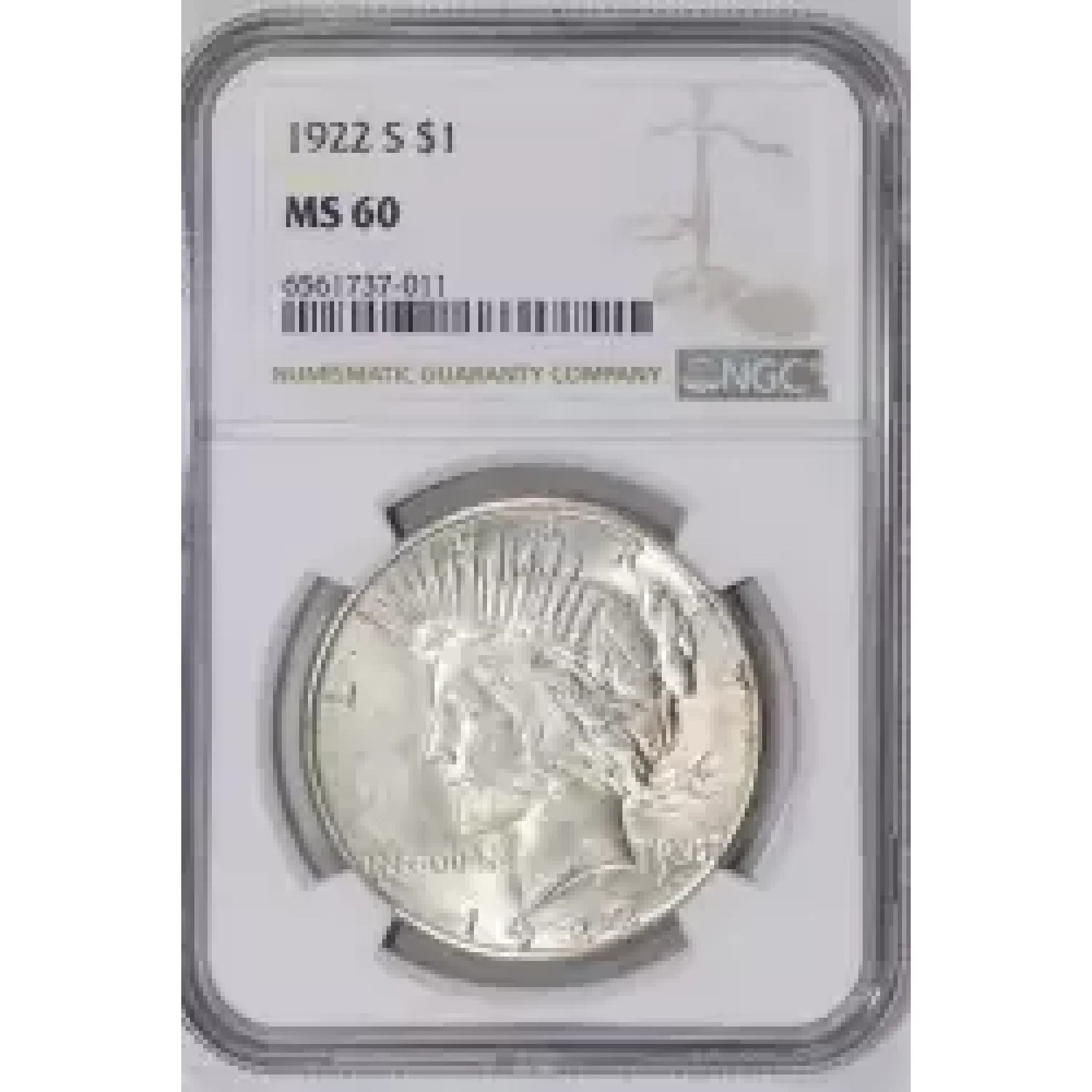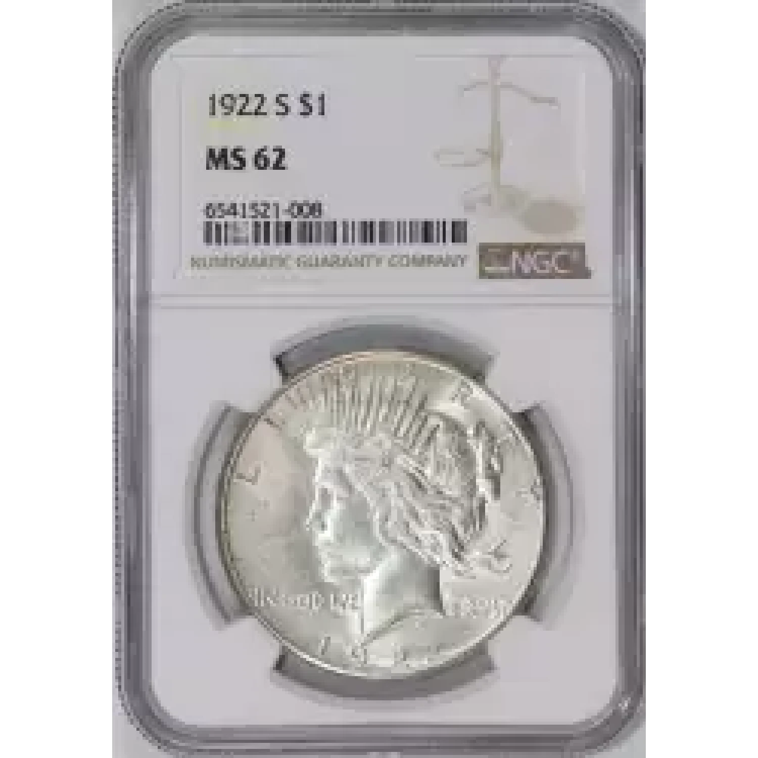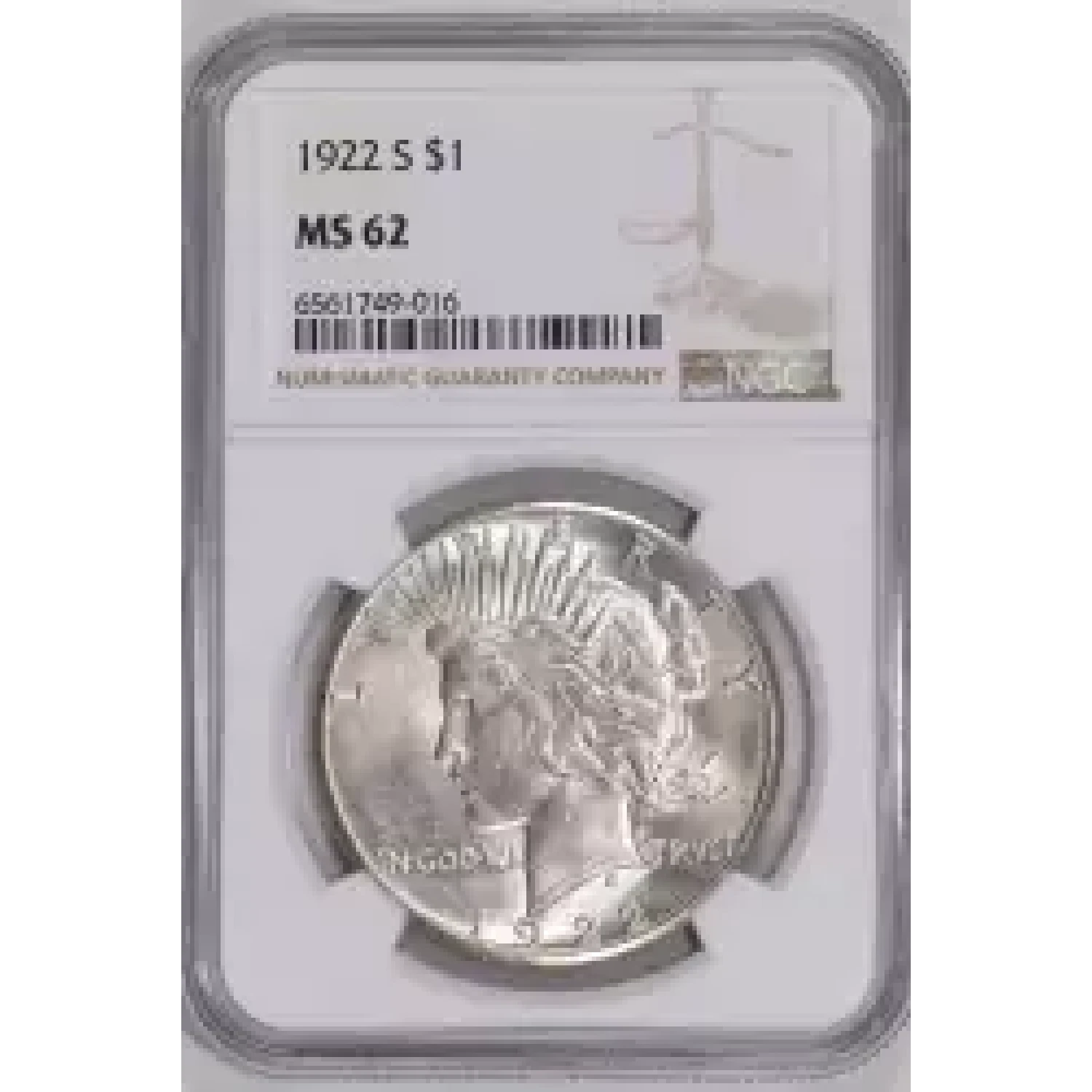 500743 | 1922-S Peace Silver Dollar NGC MS-62 | NGC | MS-62 | Sold: 01/03/2022 | $90 |