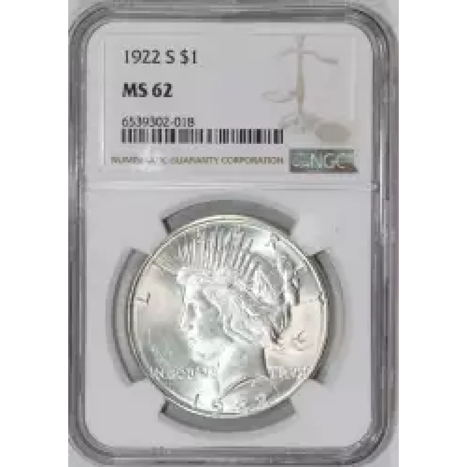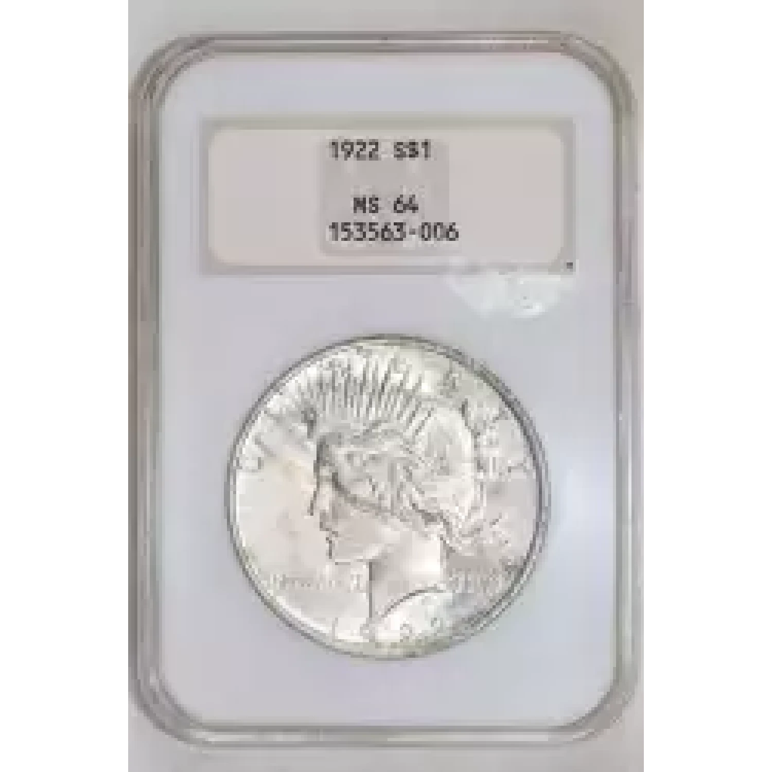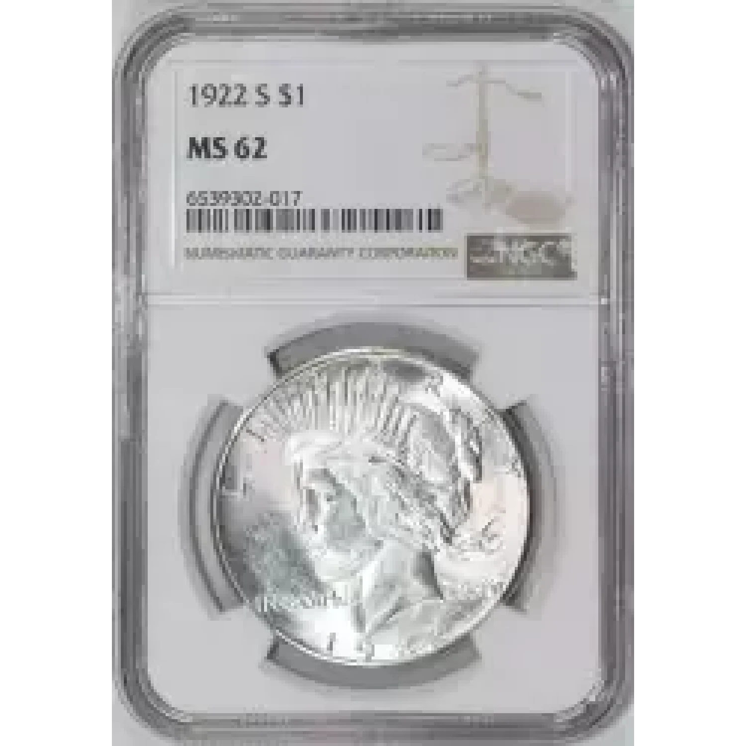500743 | 1922-S Peace Silver Dollar NGC MS-62 | NGC | MS-62 | Sold: 01/03/2022 | $90 |