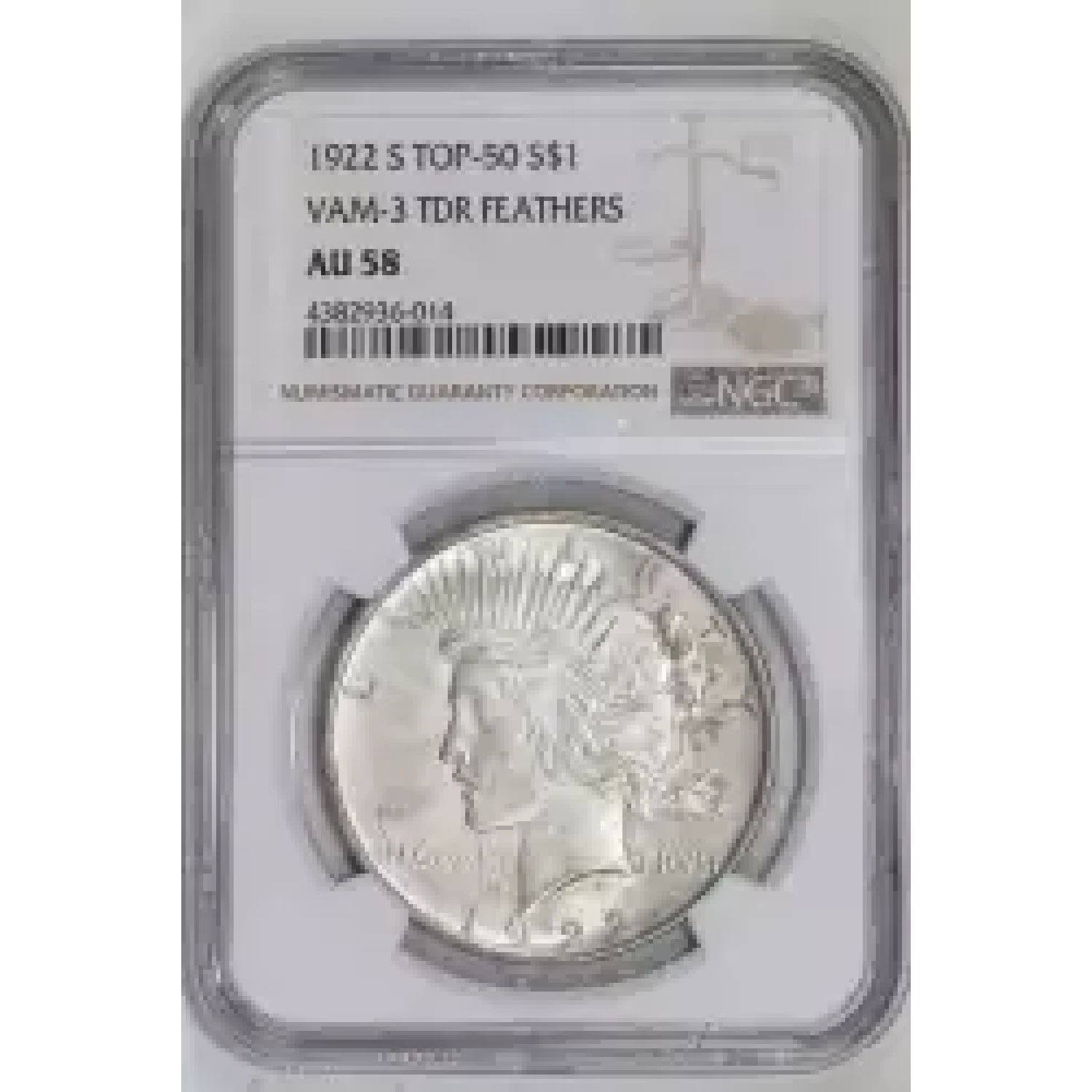 519593 | 1922-S Peace Silver Dollar NGC AU-58 S VAM-3 TDR FEATHERS | NGC | AU-58 | Sold: 21/09/2023 | $1,000 |