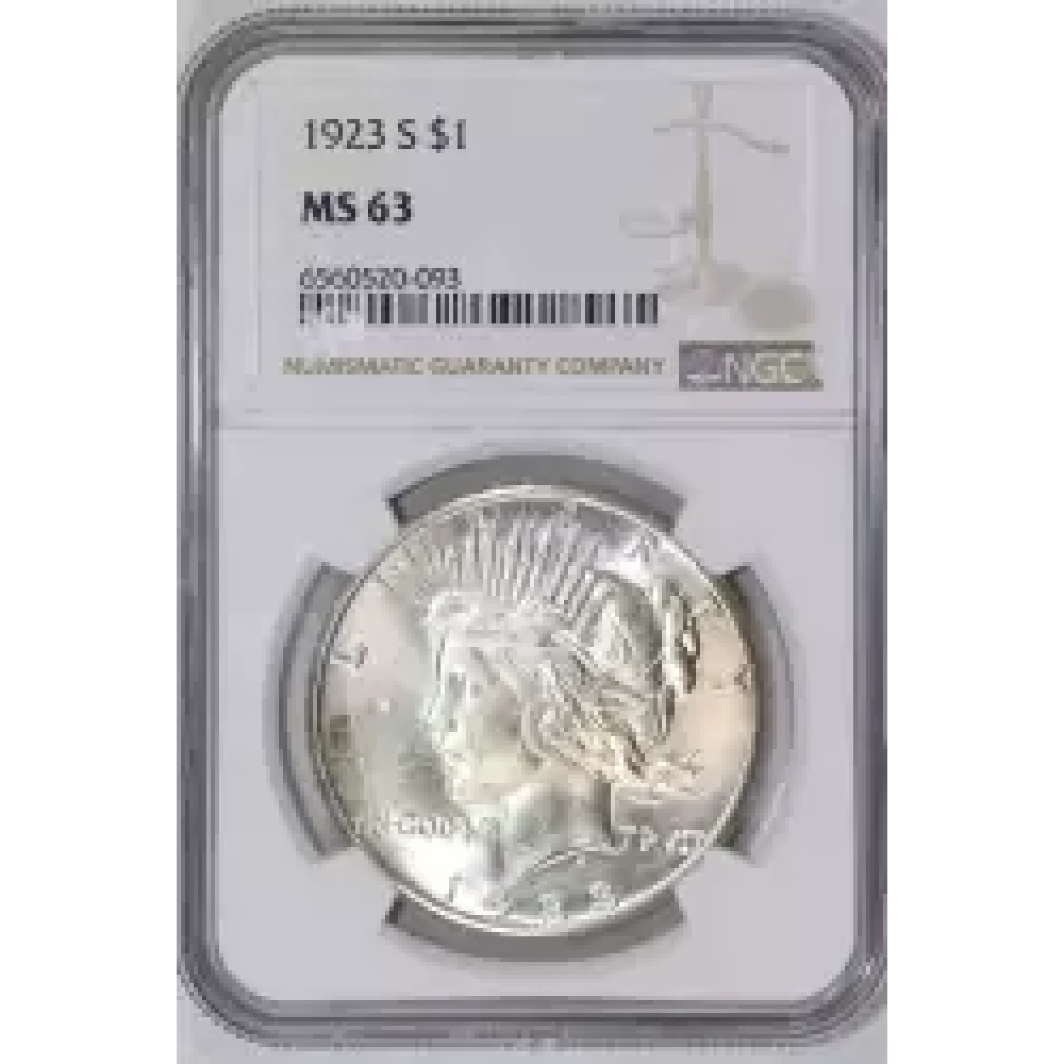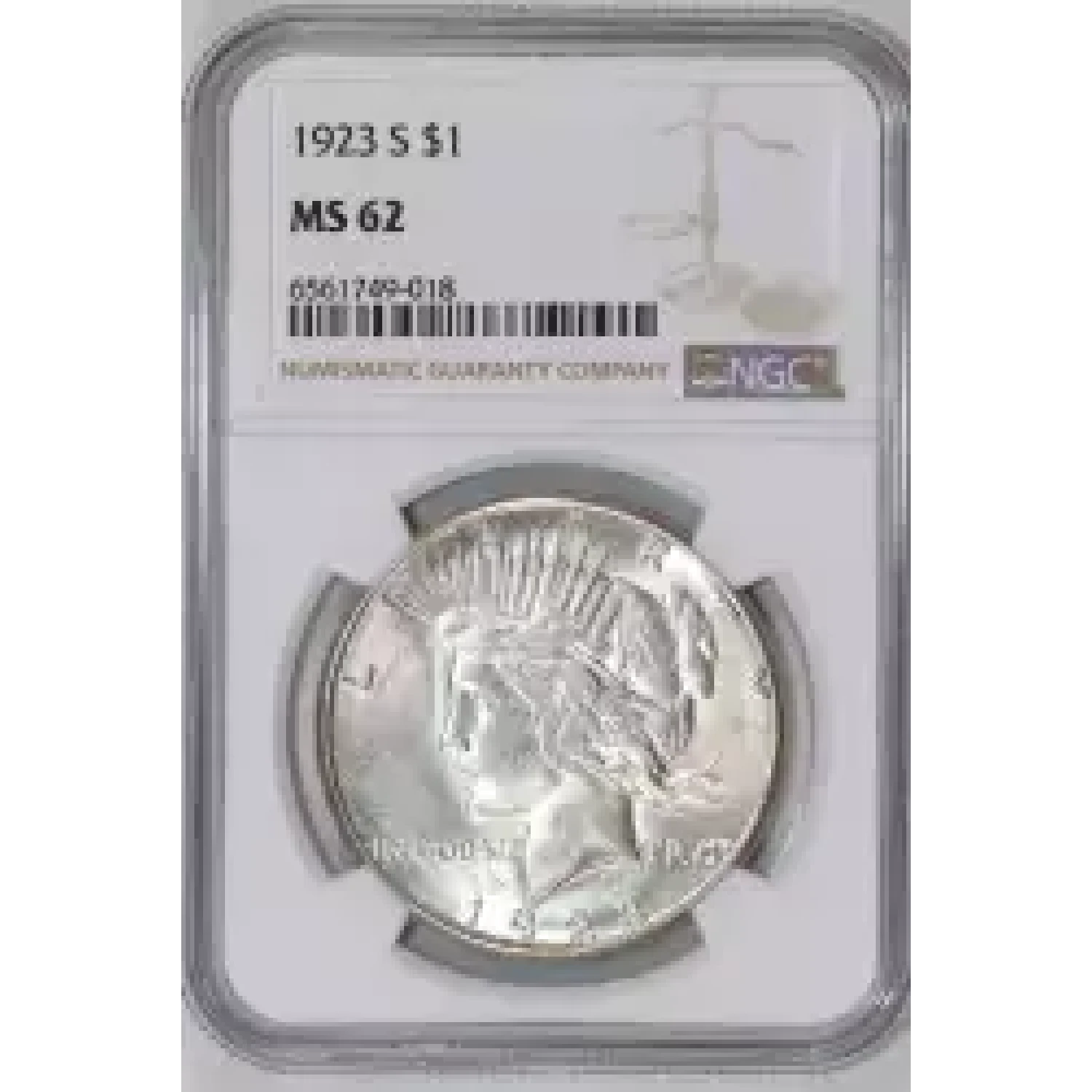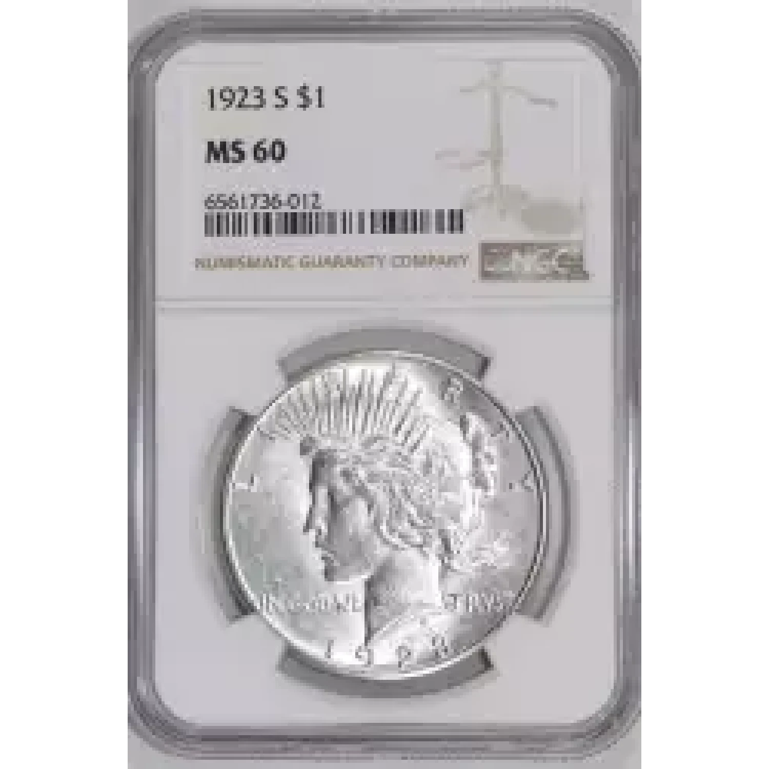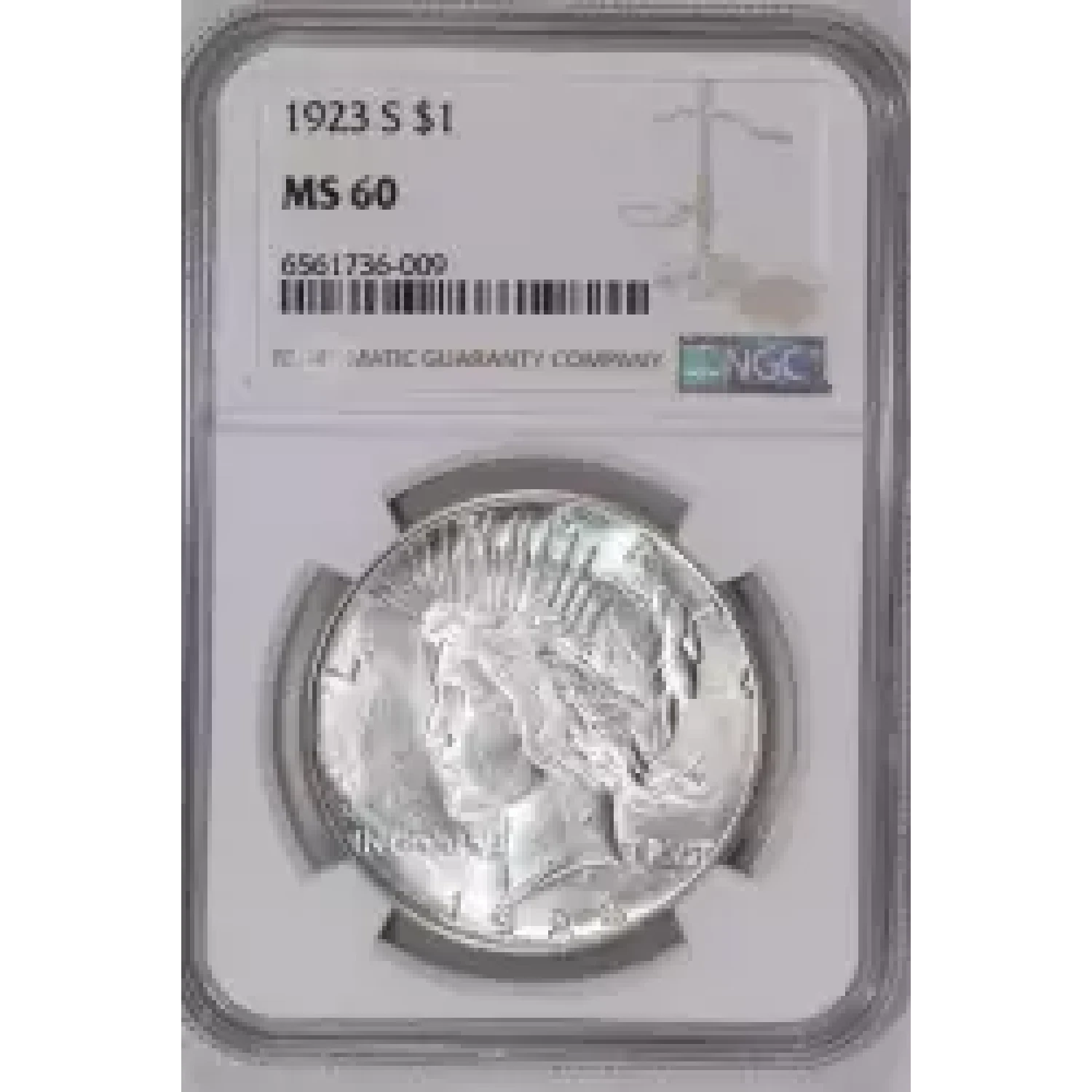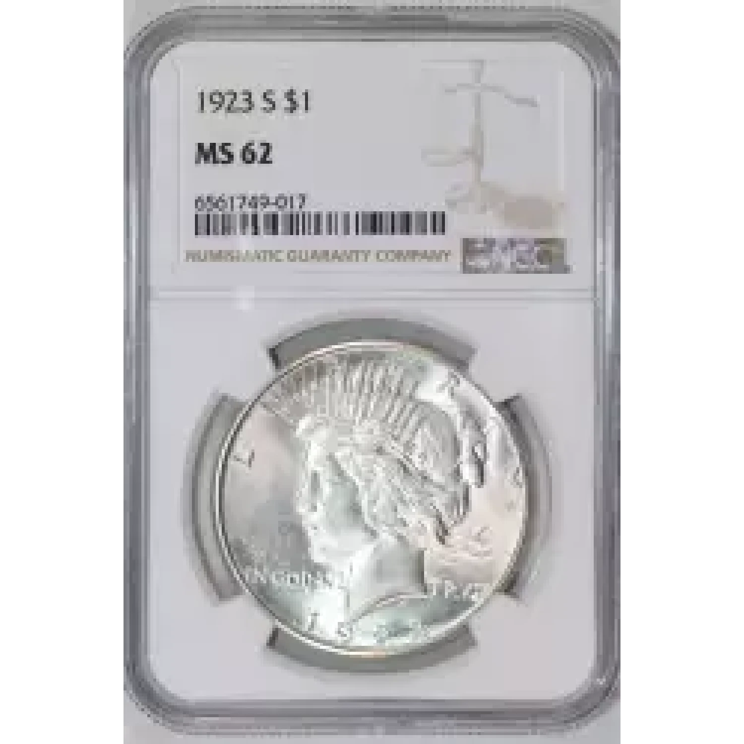 500765 | 1923-S Peace Silver Dollar NGC MS-62 | NGC | MS-62 | Sold: 01/03/2022 | $90 |