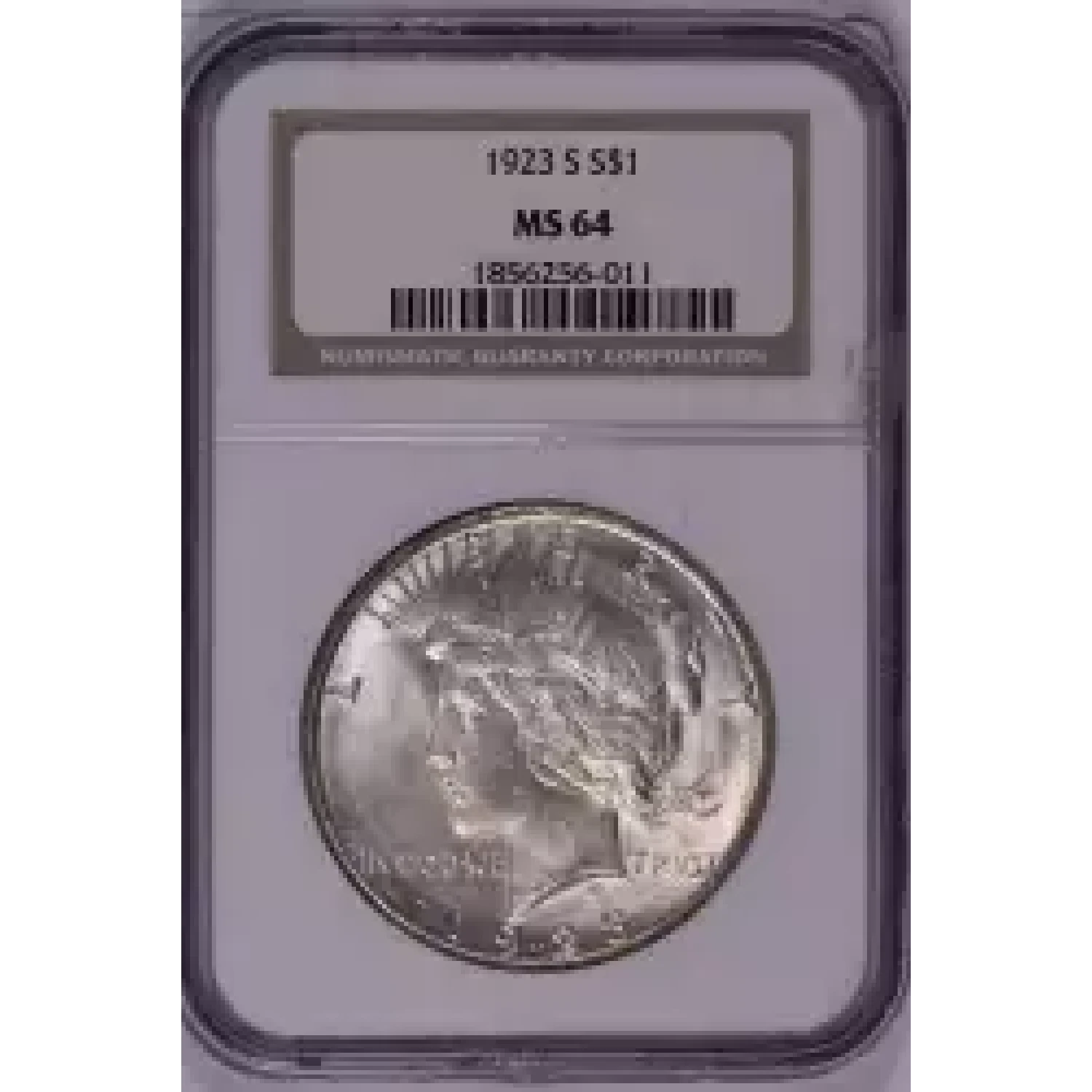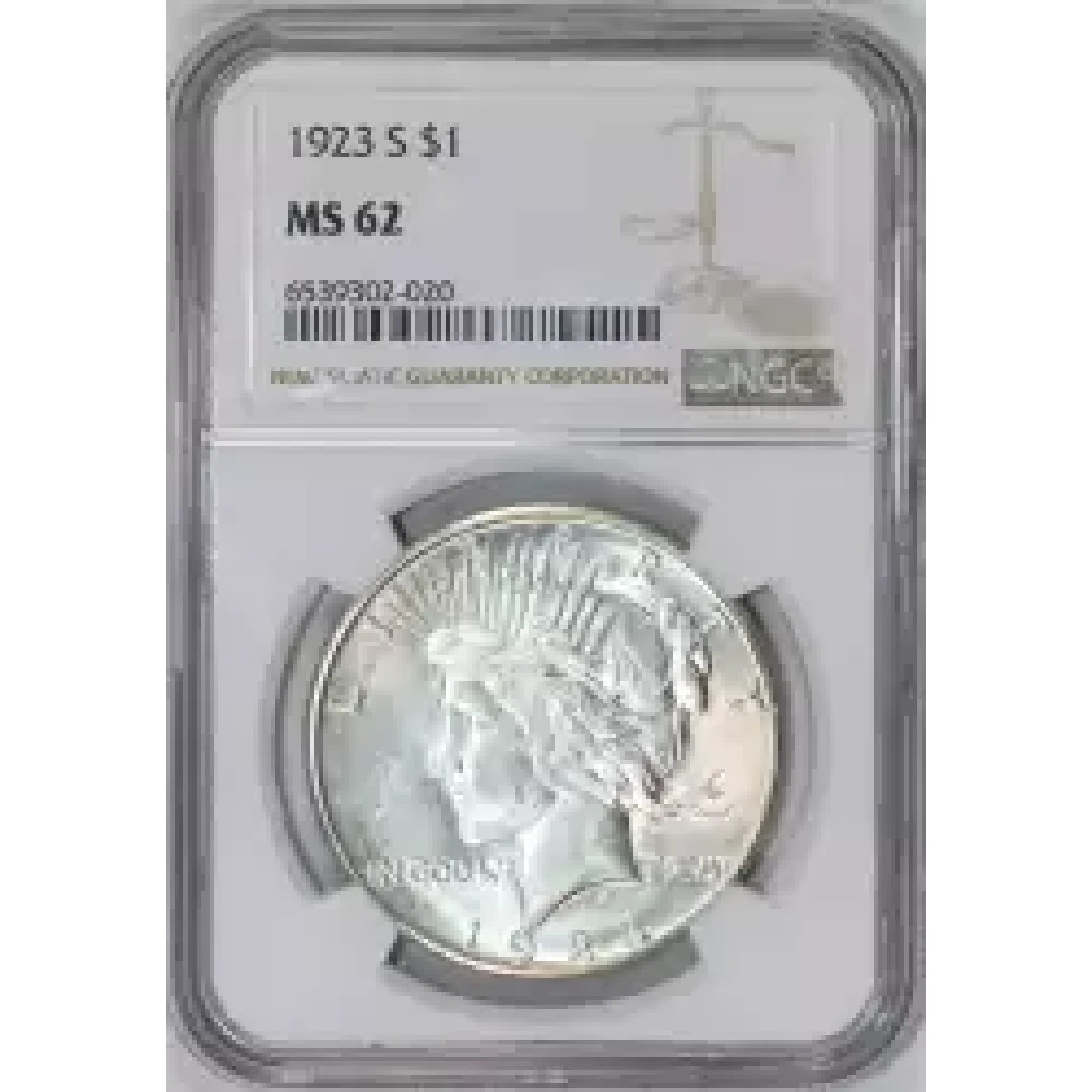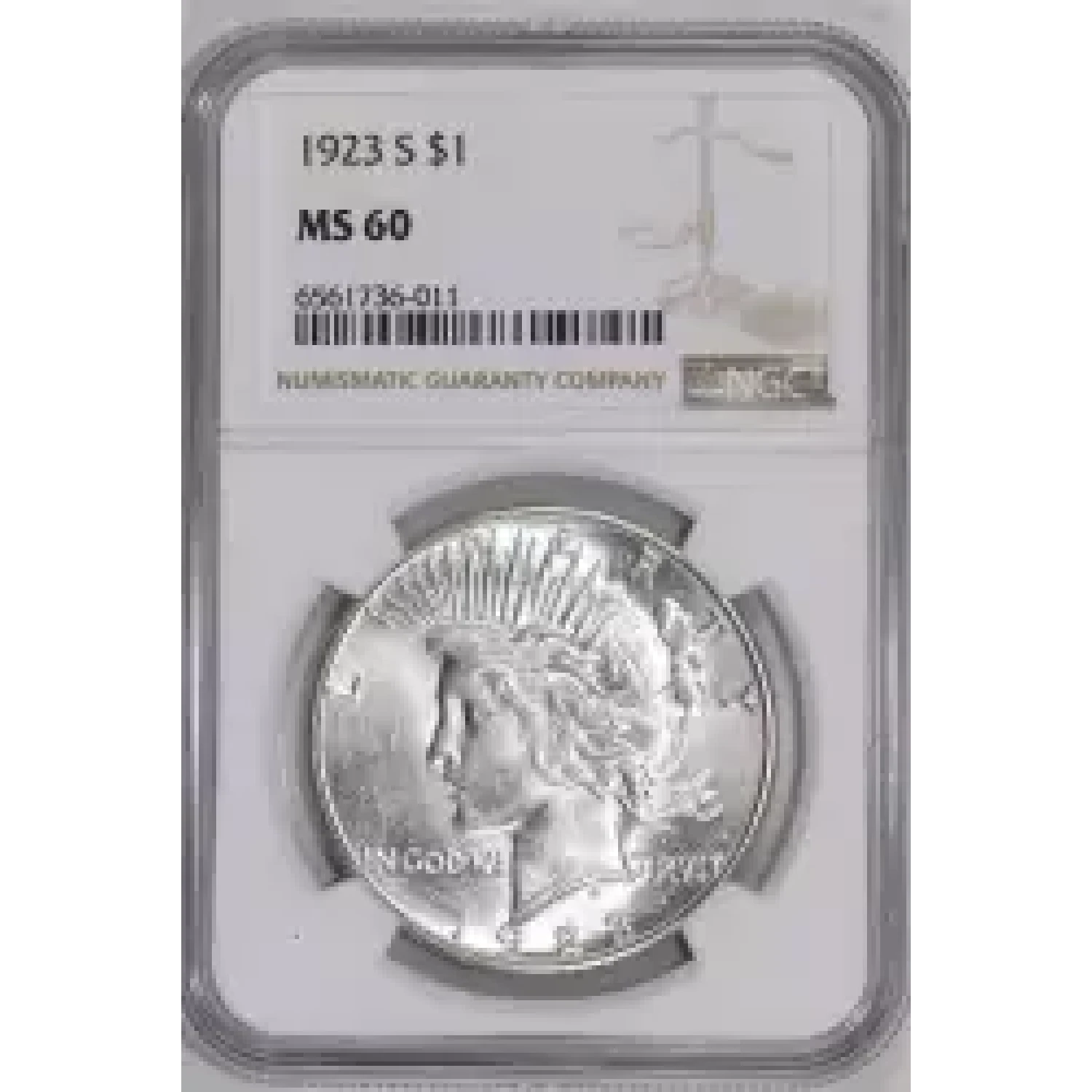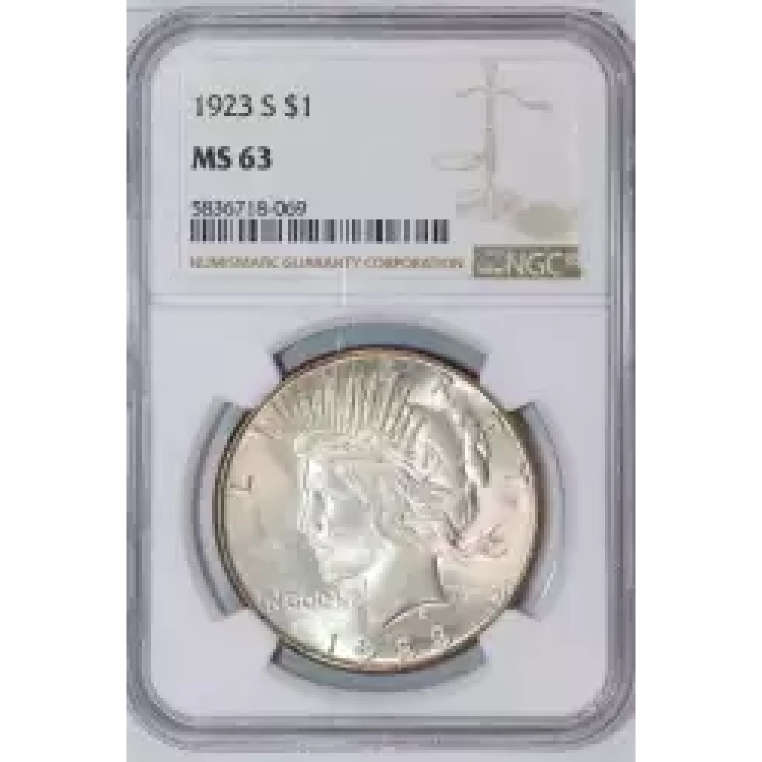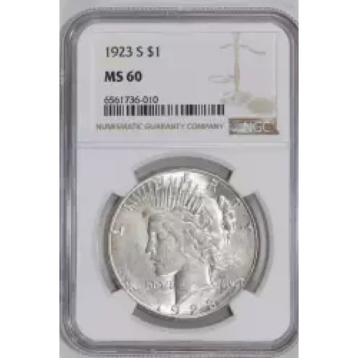 500765 | 1923-S Peace Silver Dollar NGC MS-62 | NGC | MS-62 | Sold: 01/03/2022 | $90 |
