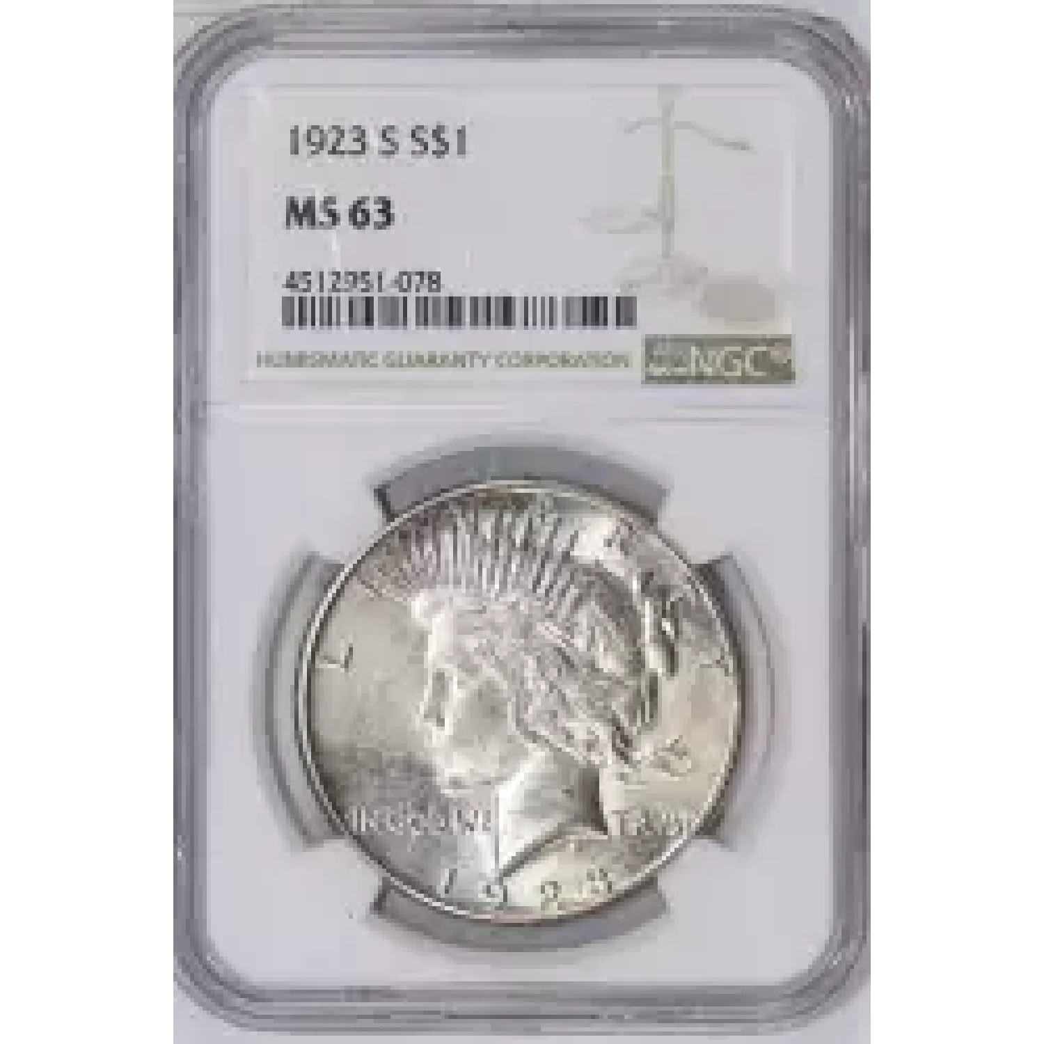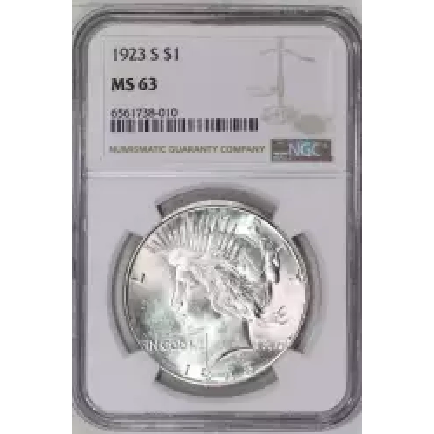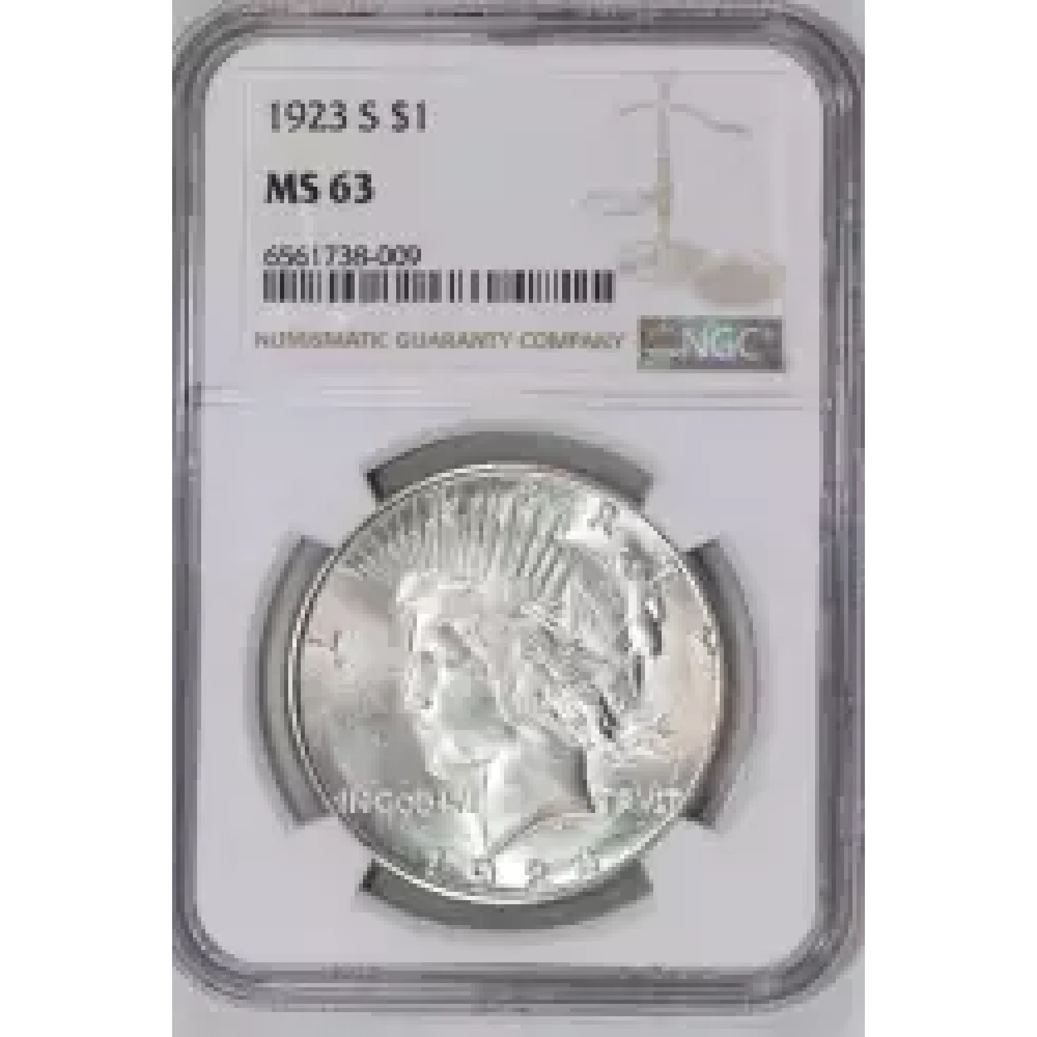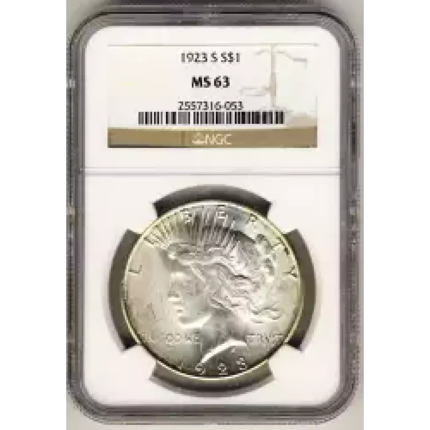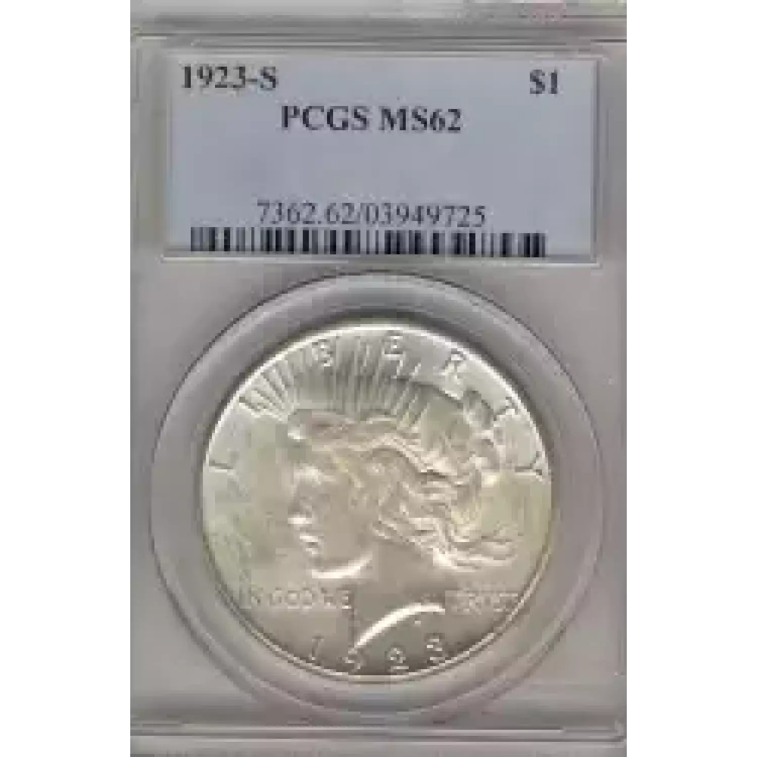500765 | 1923-S Peace Silver Dollar NGC MS-62 | NGC | MS-62 | Sold: 01/03/2022 | $90 |