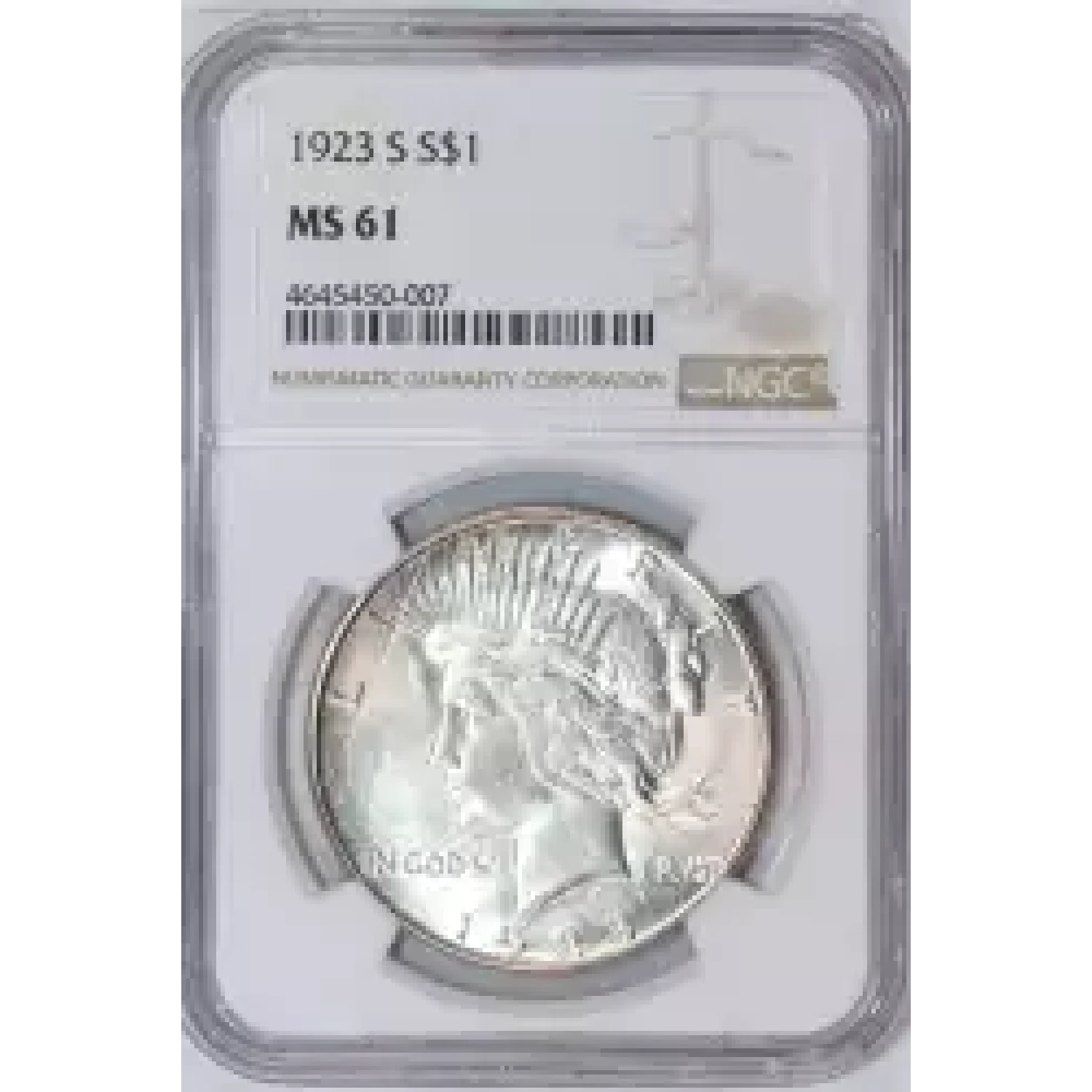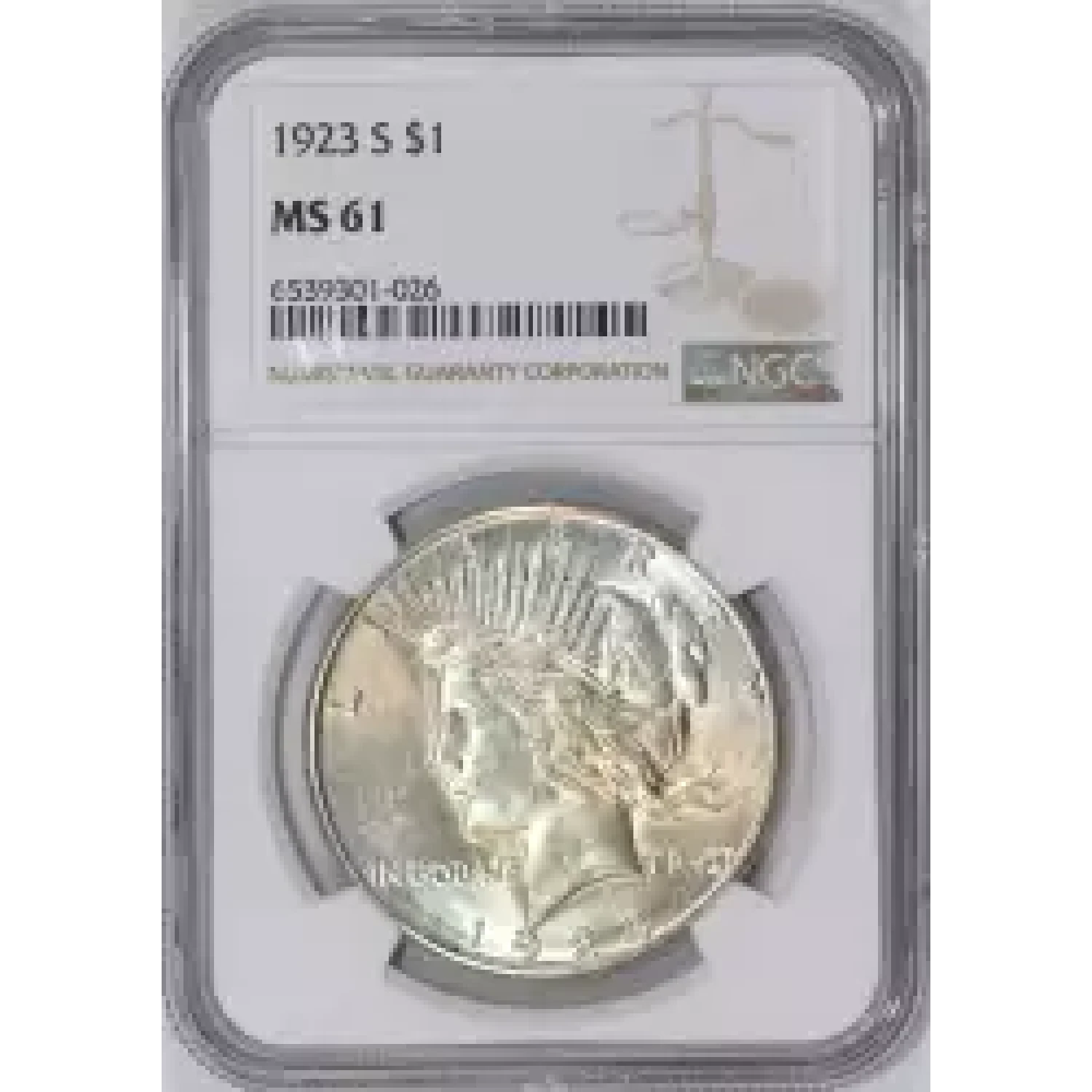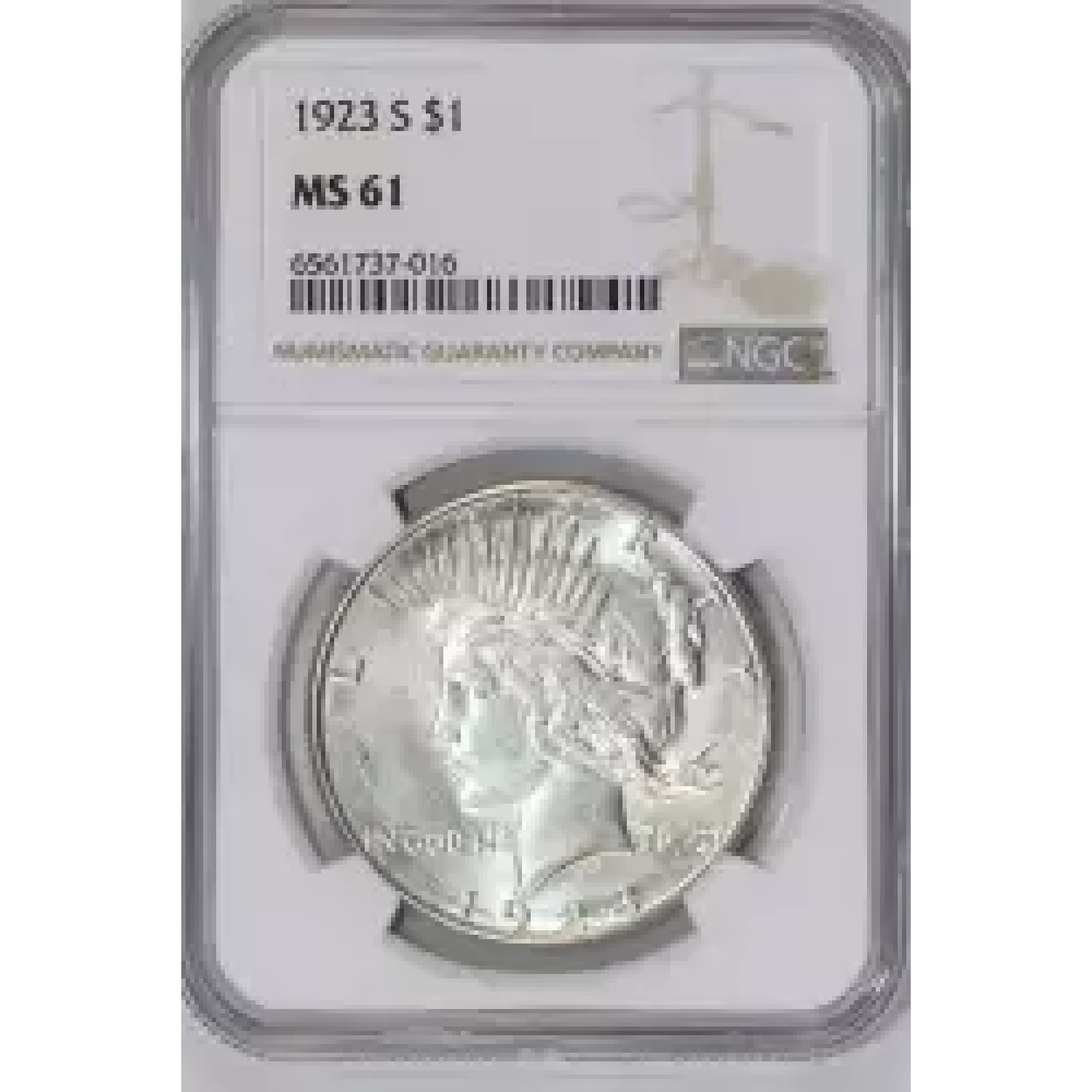 500769 | 1923-S Peace Silver Dollar NGC MS-61 | NGC | MS-61 | Sold: 01/03/2022 | $85 |