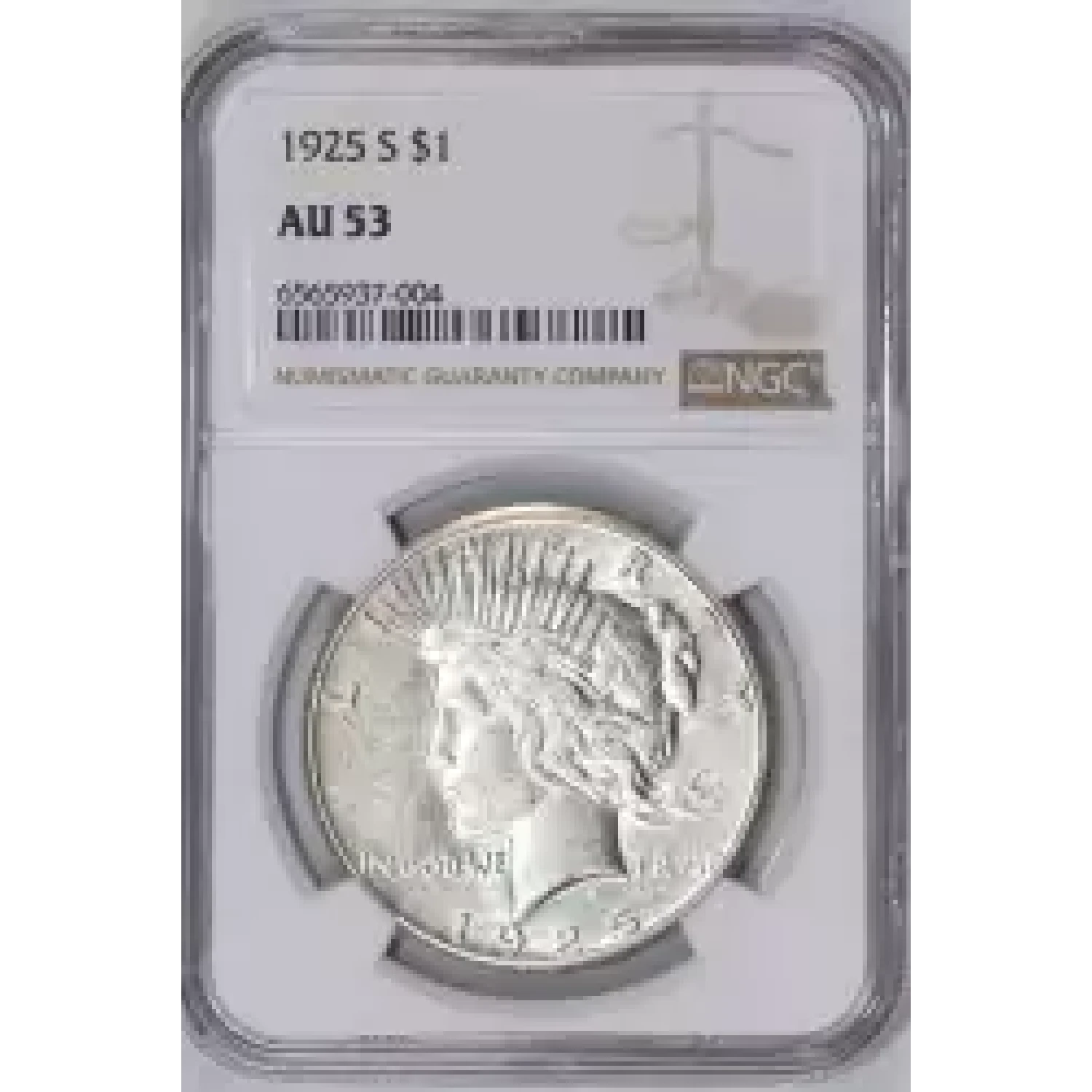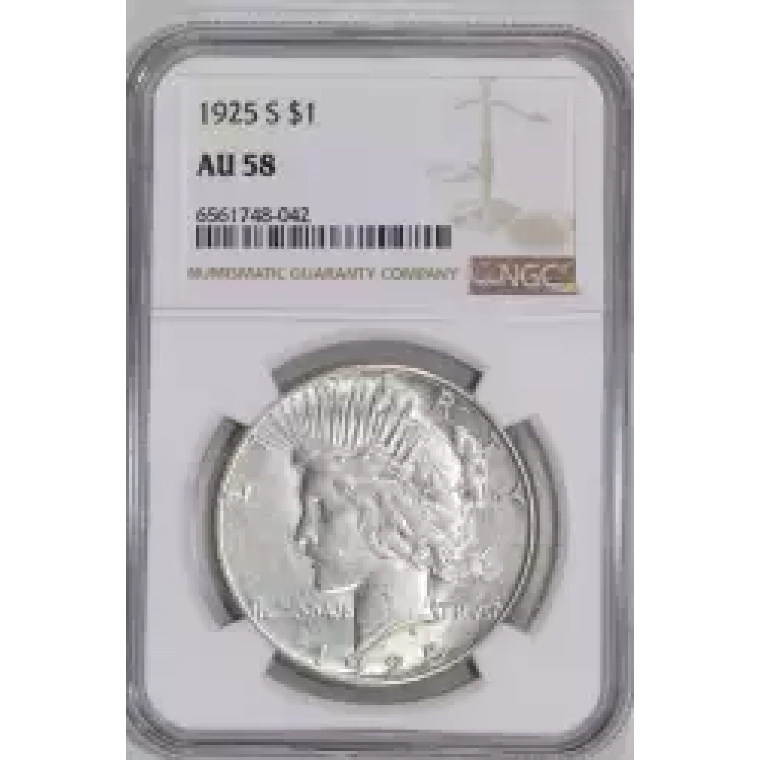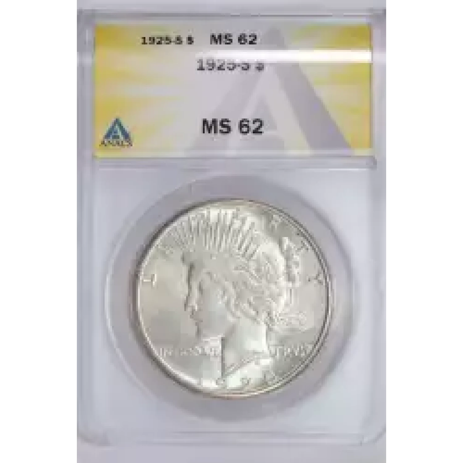 504756 | 1925-AU Details Peace Silver Dollar ANACS AU Details | ANACS | AU Details | Sold: 05/12/2010 | $90 |
