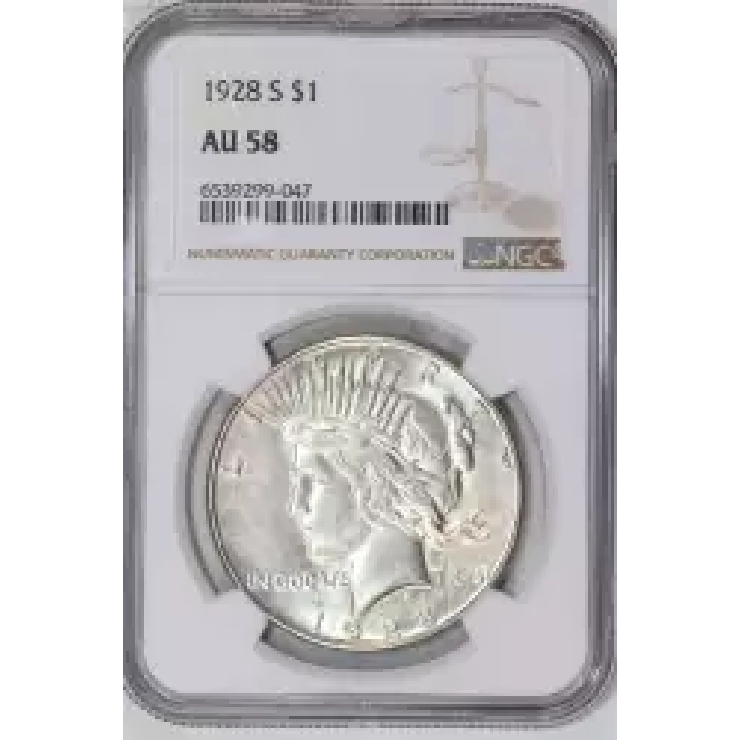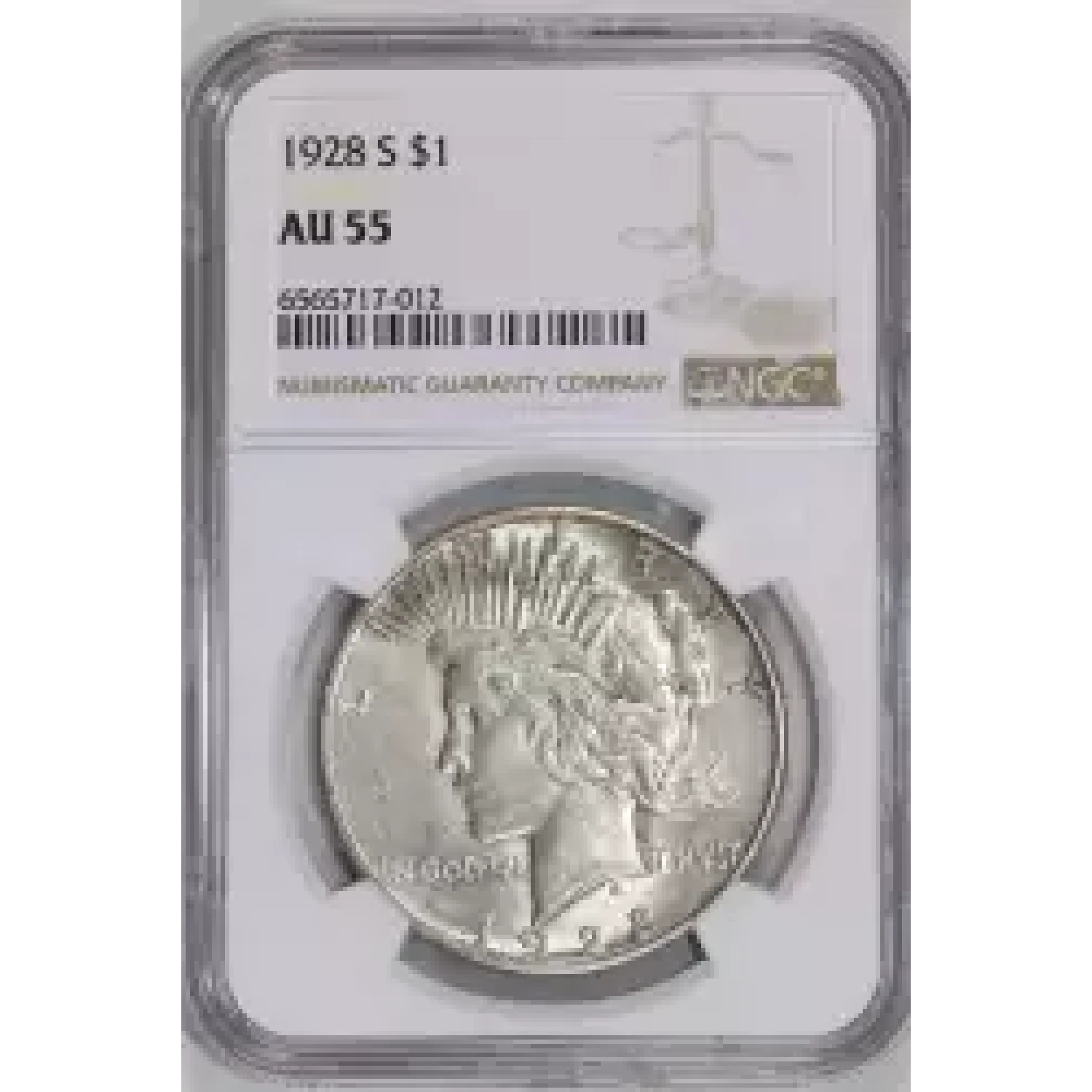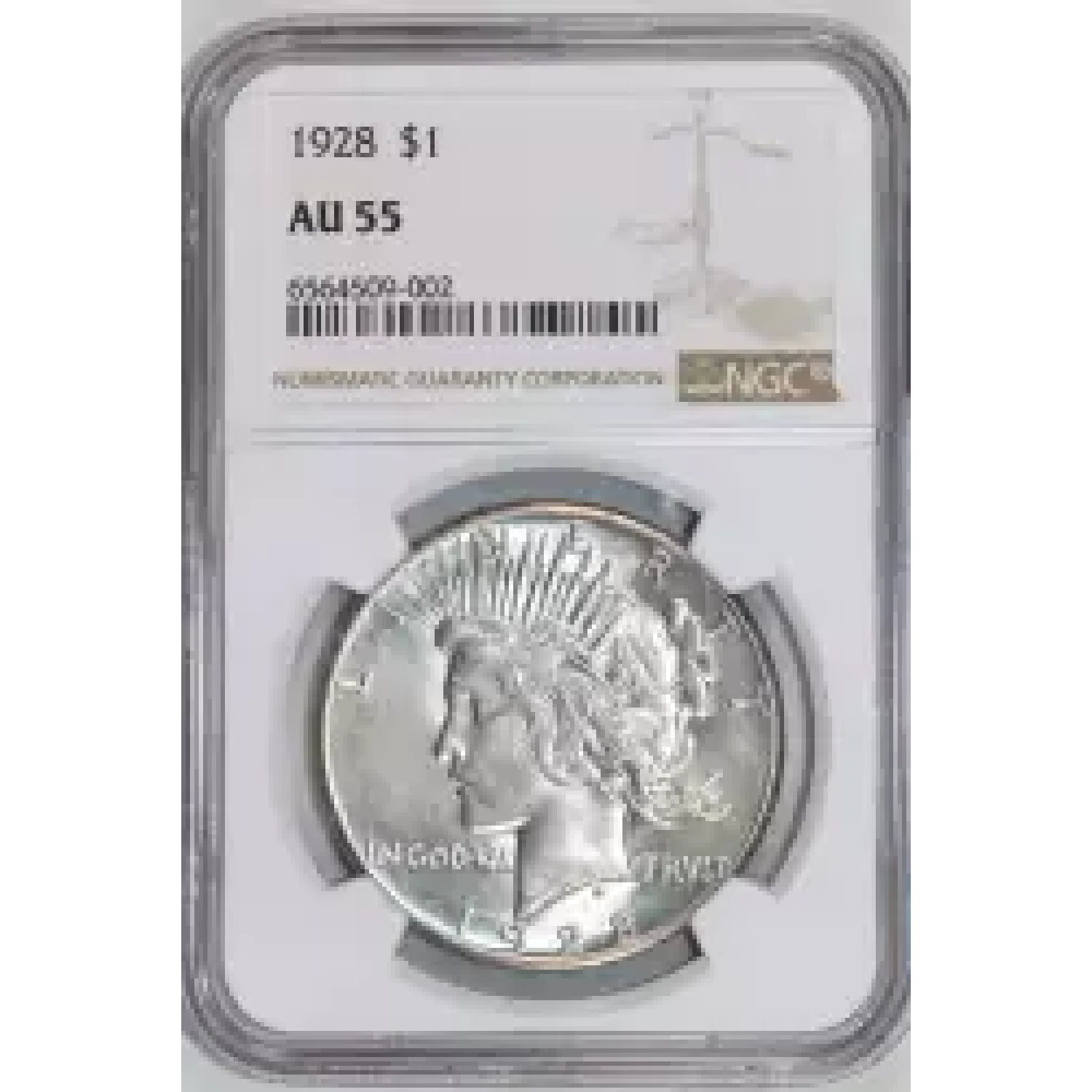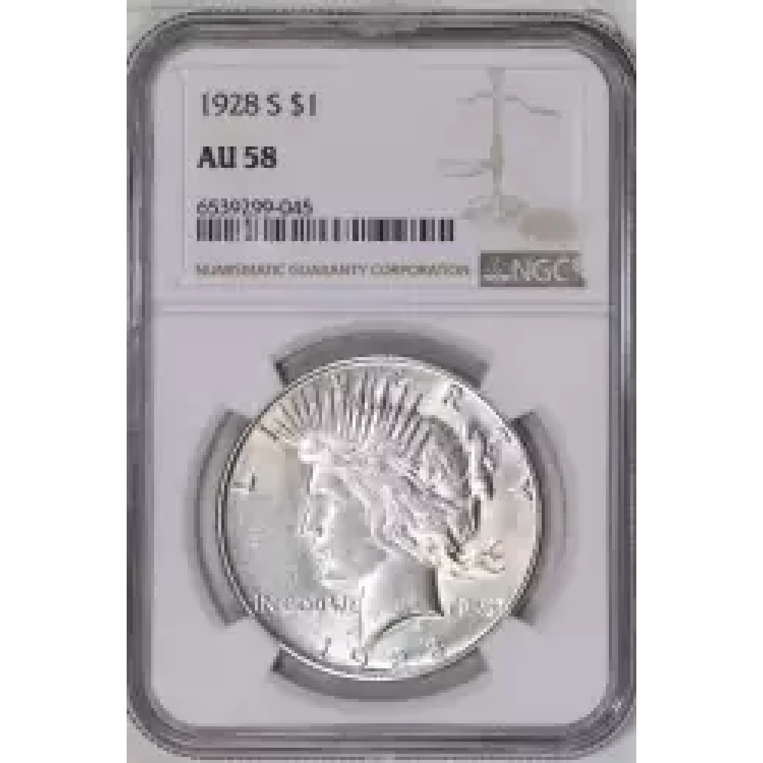 504543 | 1928-AU-55 Peace Silver Dollar NGC AU-55 | NGC | AU-55 | Sold: 17/04/2009 | $100 |