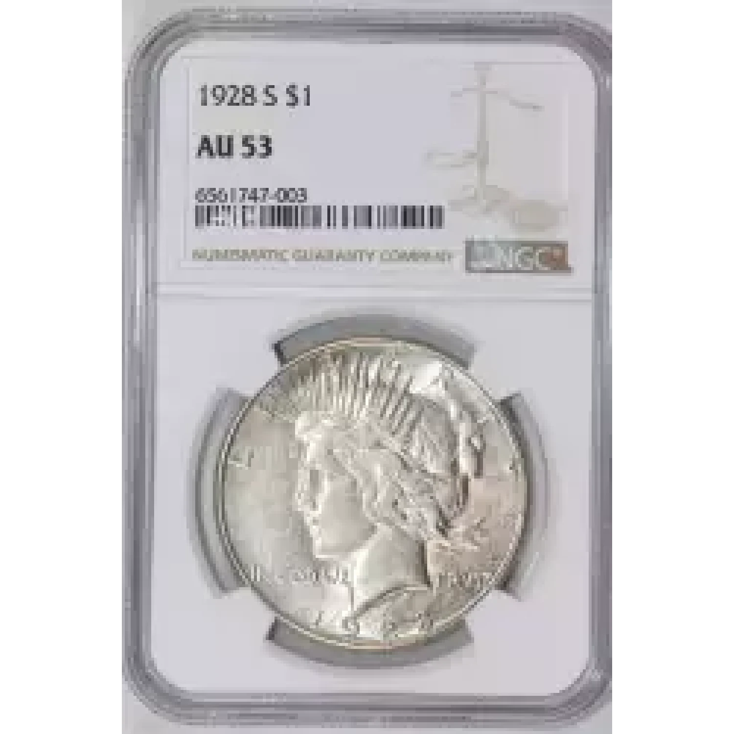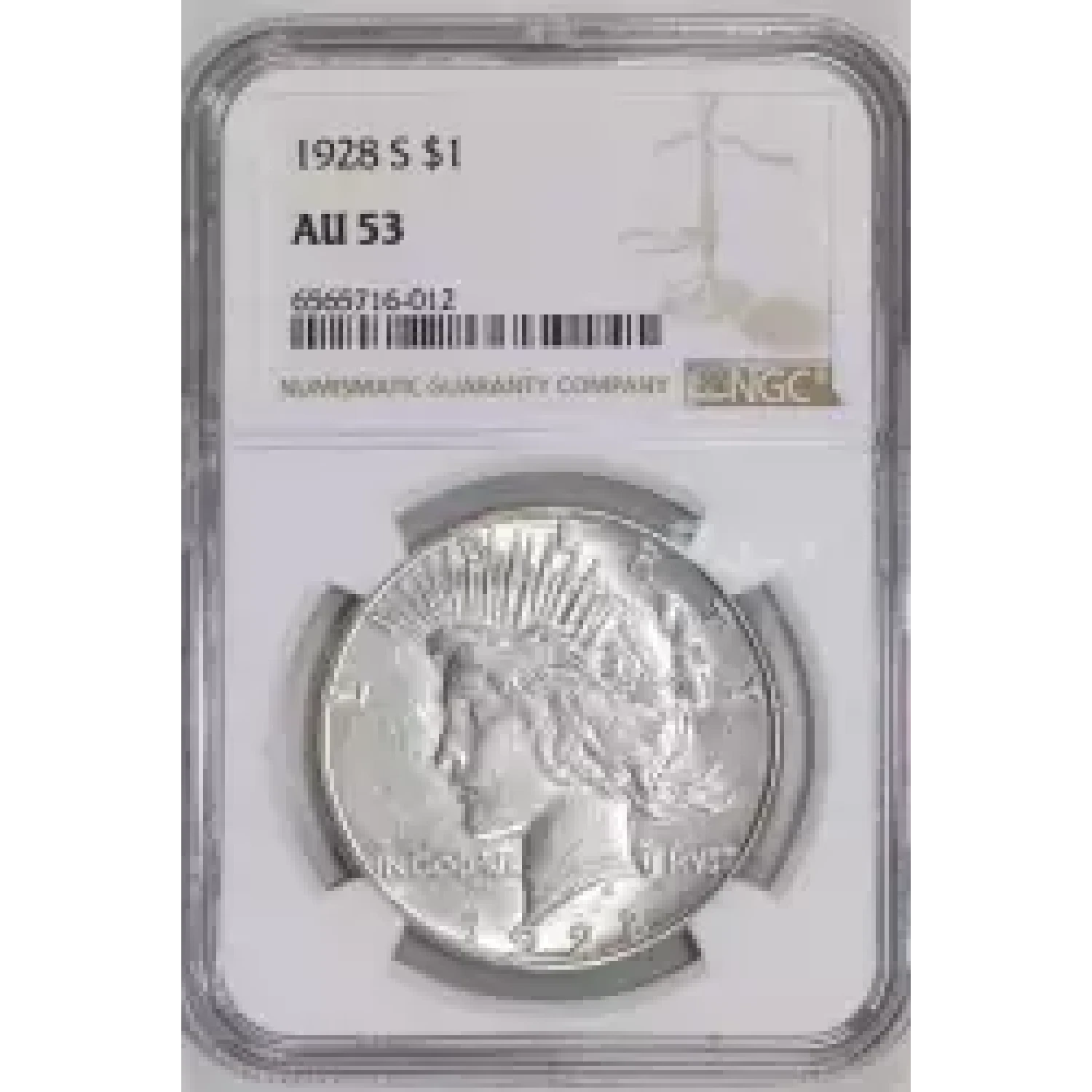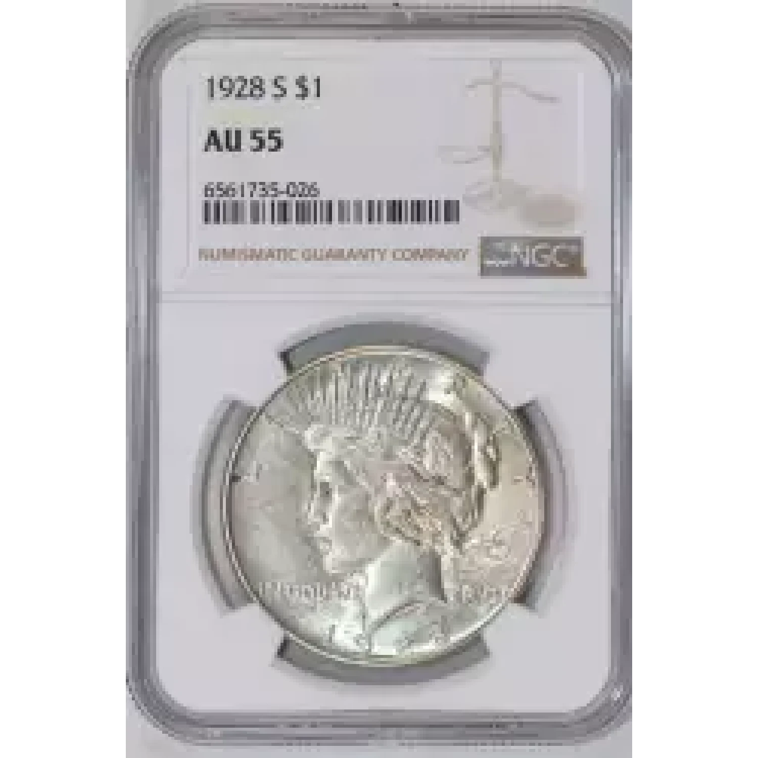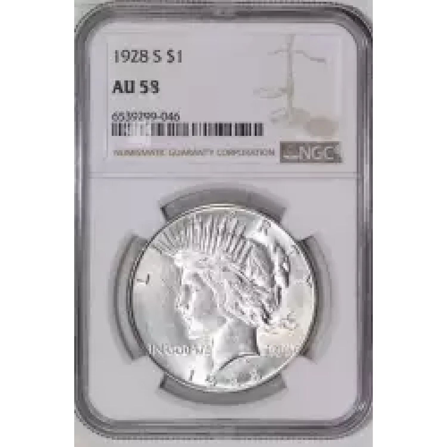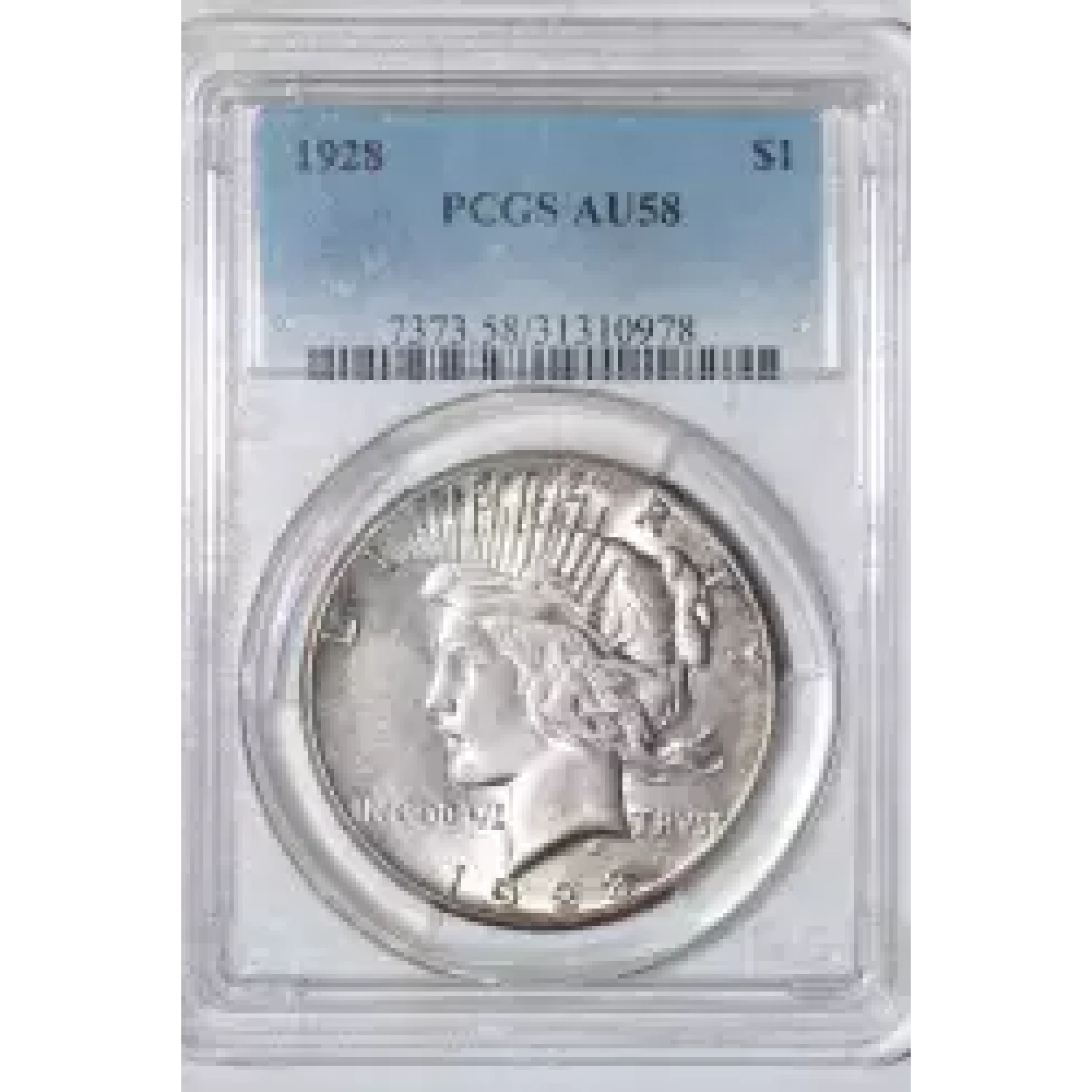 504543 | 1928-AU-55 Peace Silver Dollar NGC AU-55 | NGC | AU-55 | Sold: 17/04/2009 | $100 |
