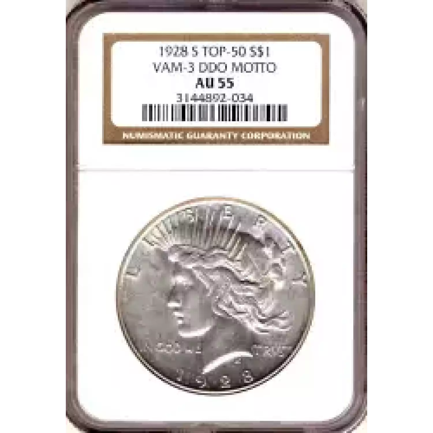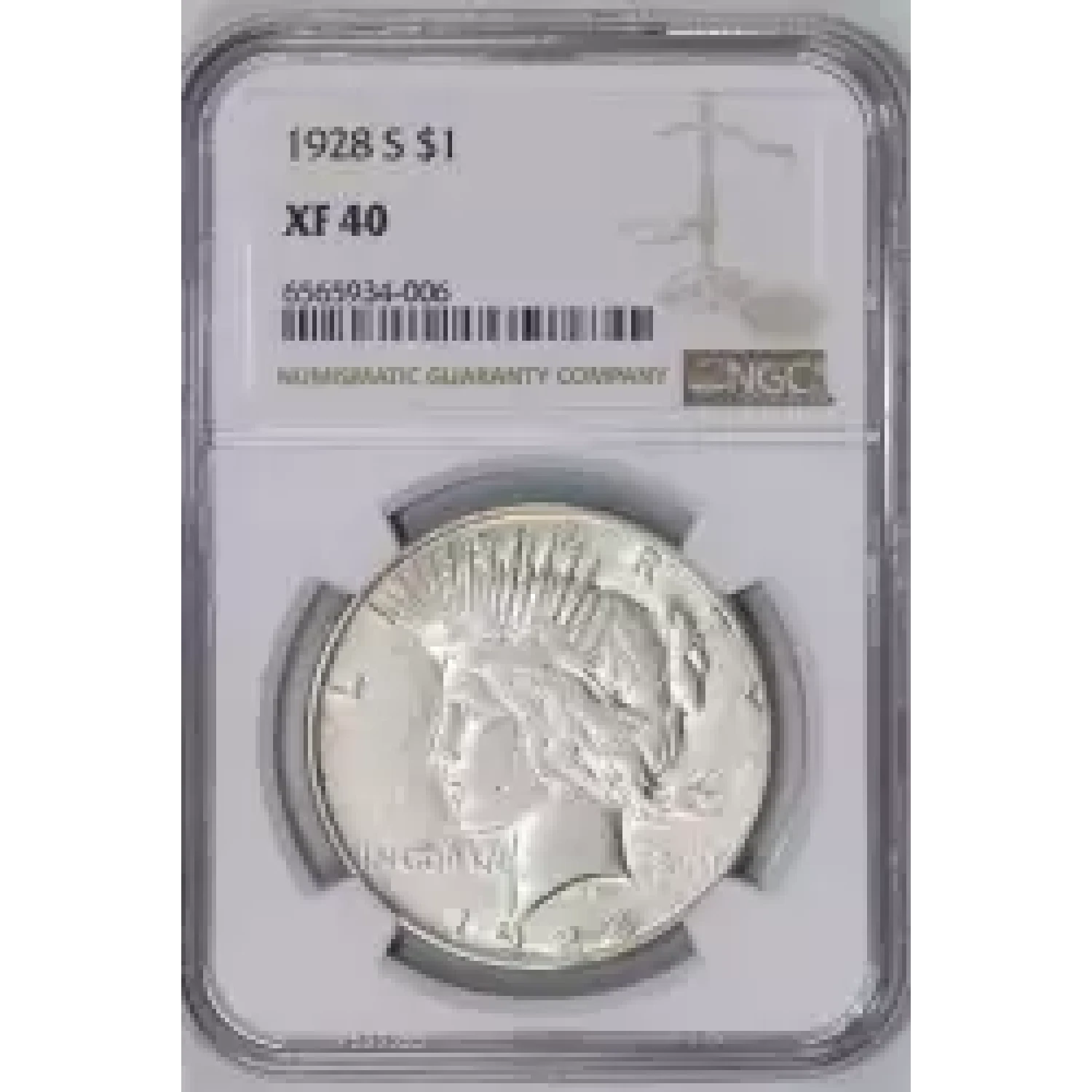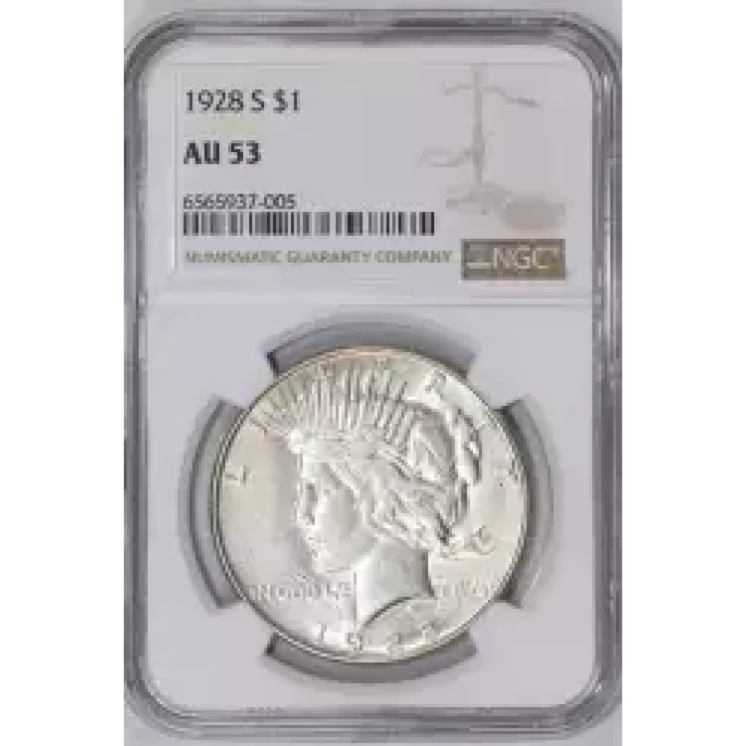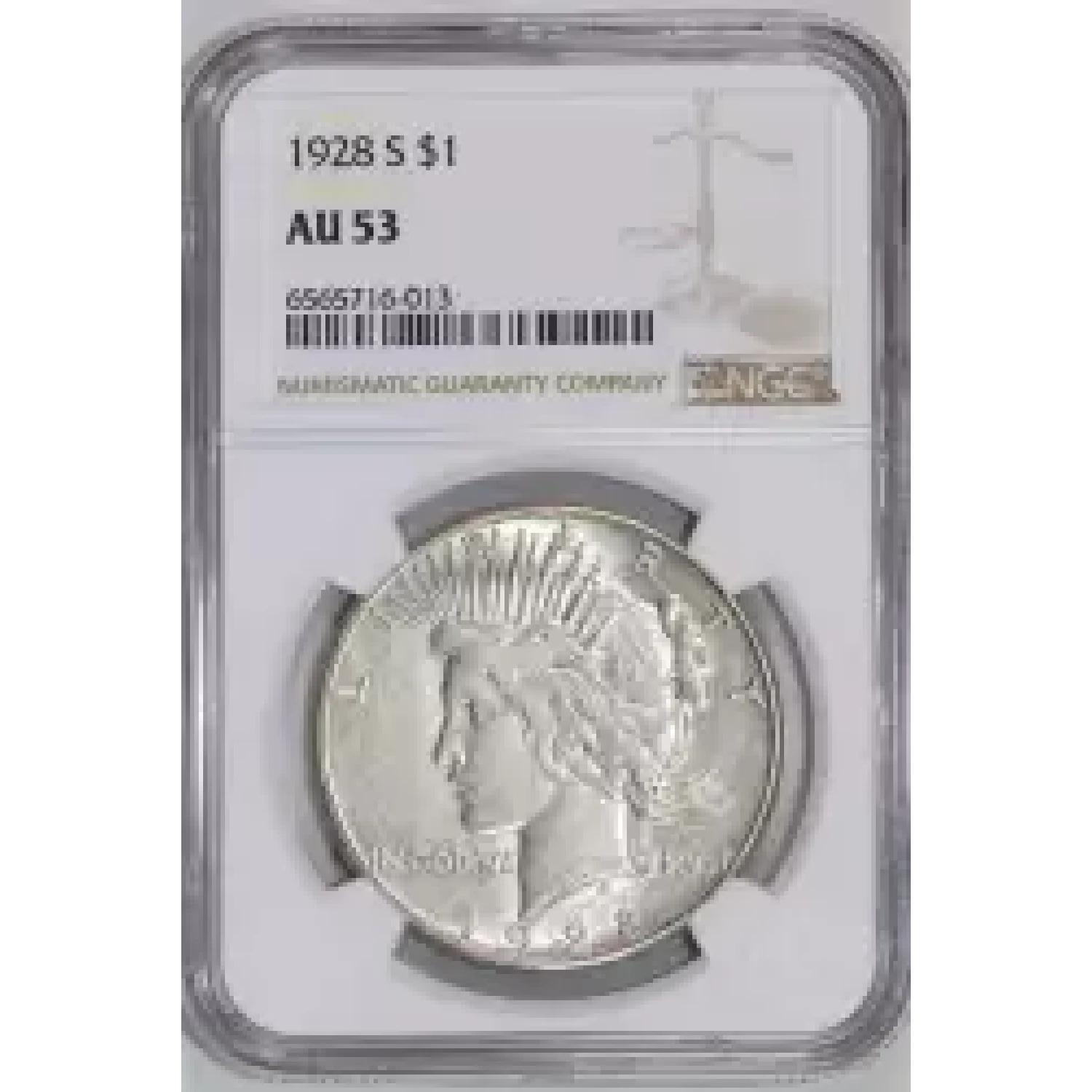 504543 | 1928-AU-55 Peace Silver Dollar NGC AU-55 | NGC | AU-55 | Sold: 17/04/2009 | $100 |