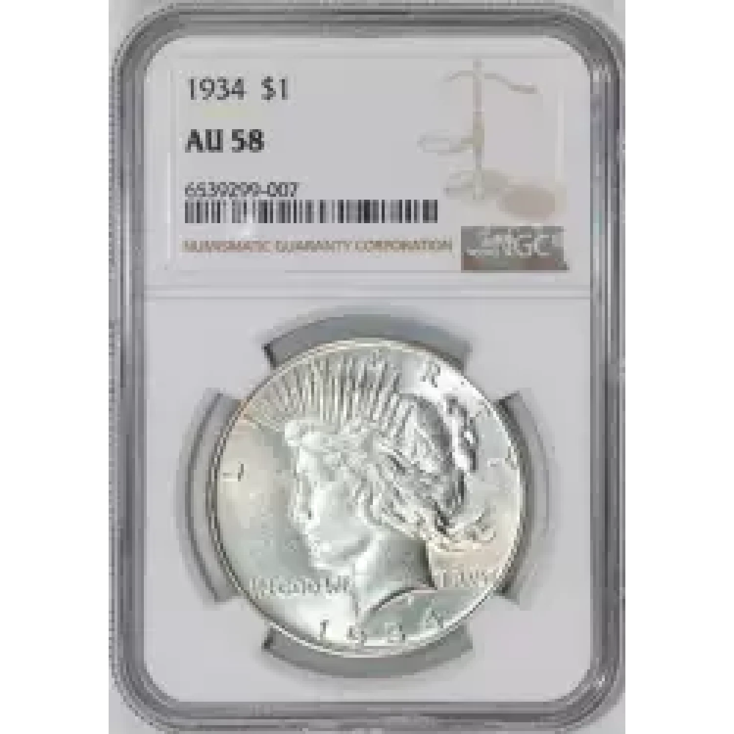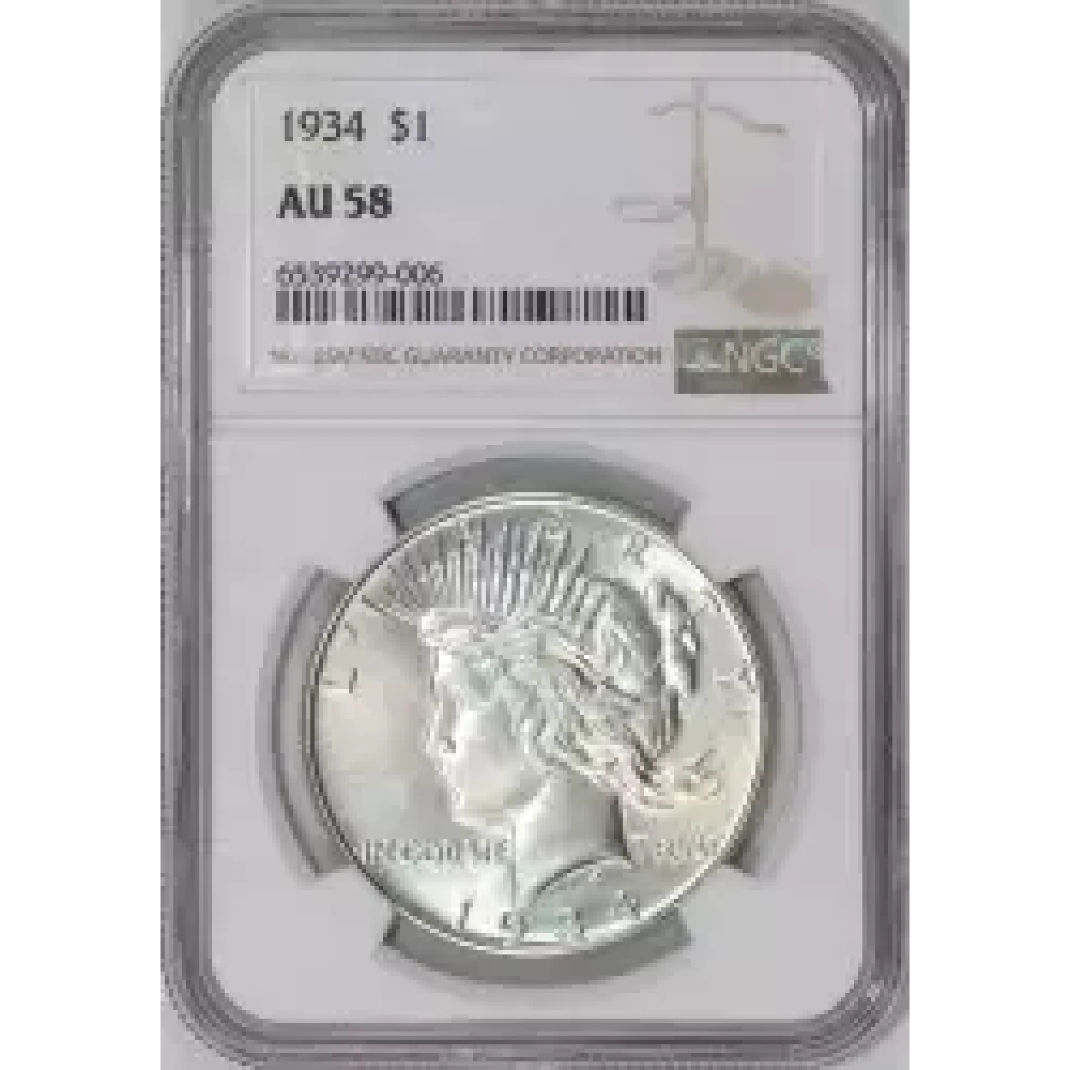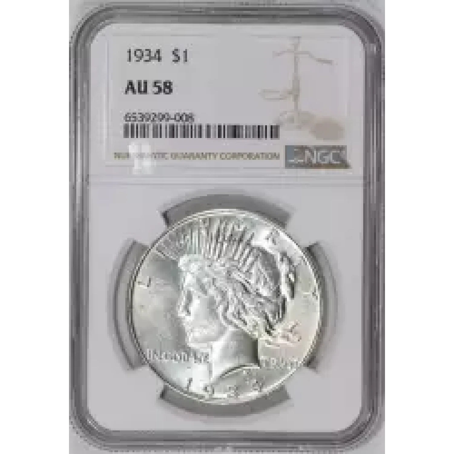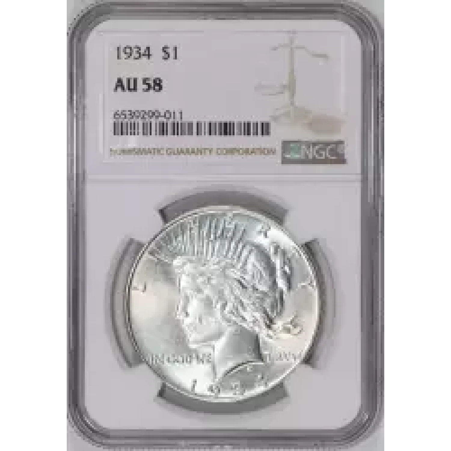 500777 | 1934 Peace Silver Dollar NGC AU-58 | NGC | AU-58 | Sold: 01/03/2022 | $120 |