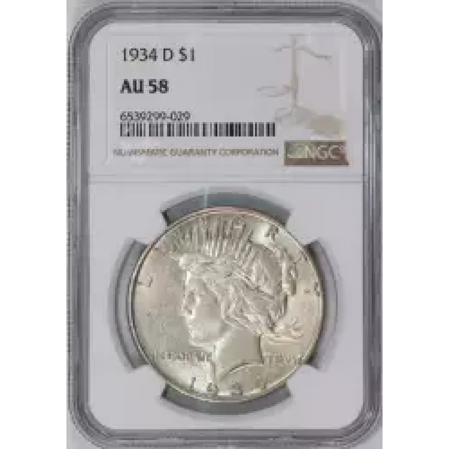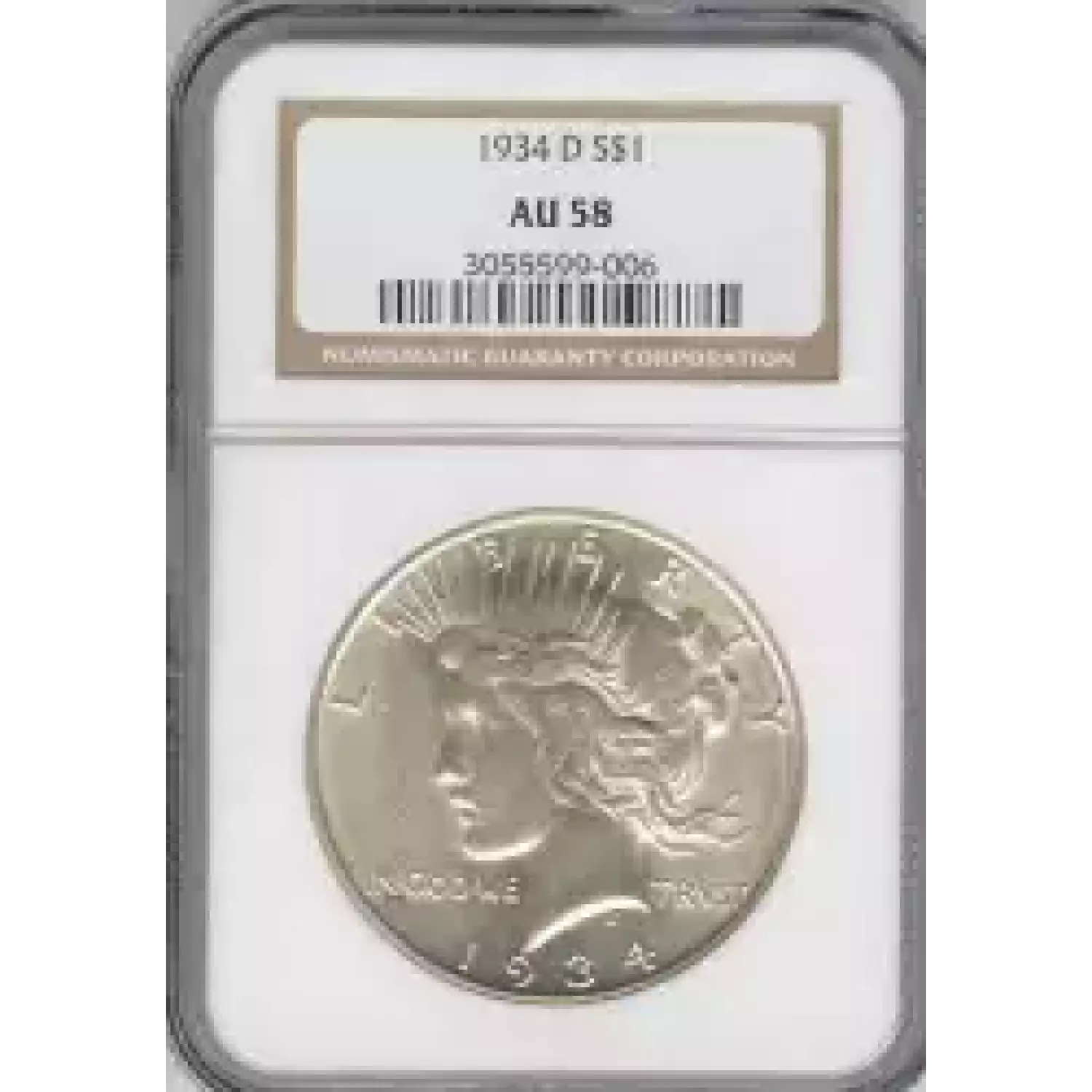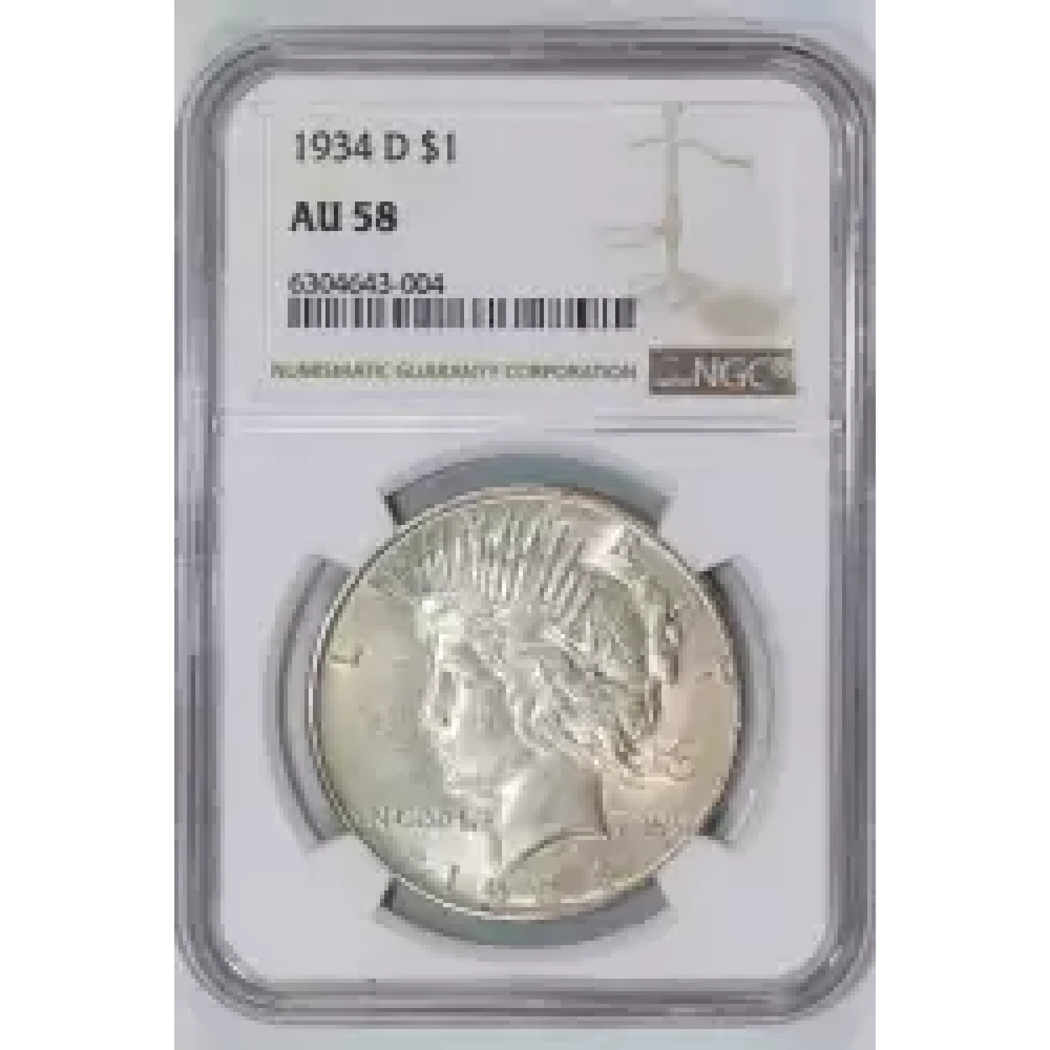 500877 | 1934-D Peace Silver Dollar NGC AU-58 | NGC | AU-58 | Sold: 10/05/2022 | $135 |