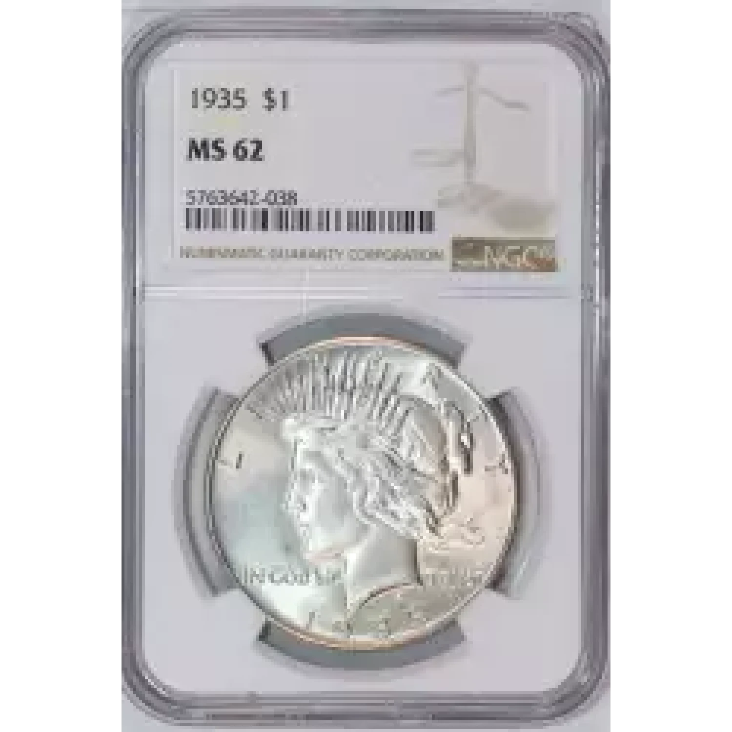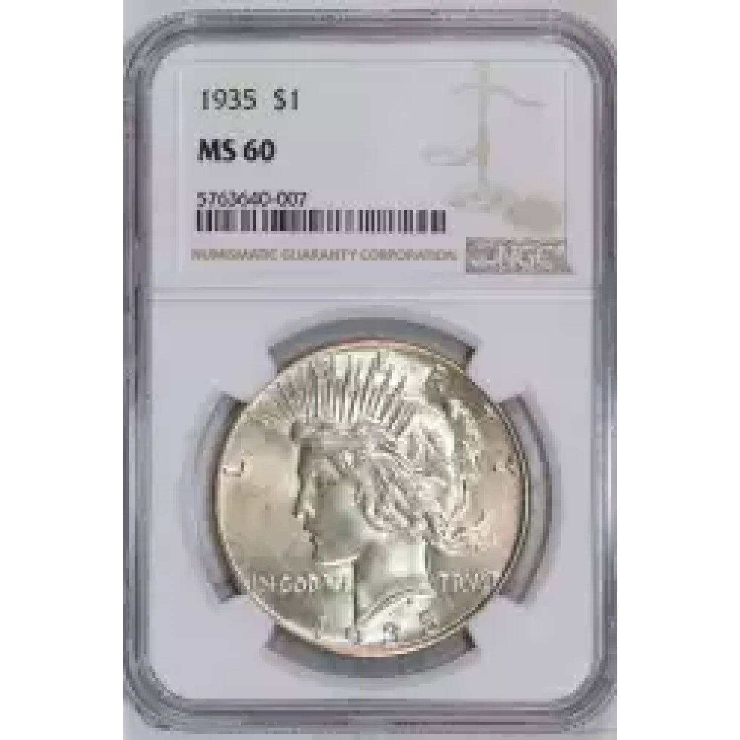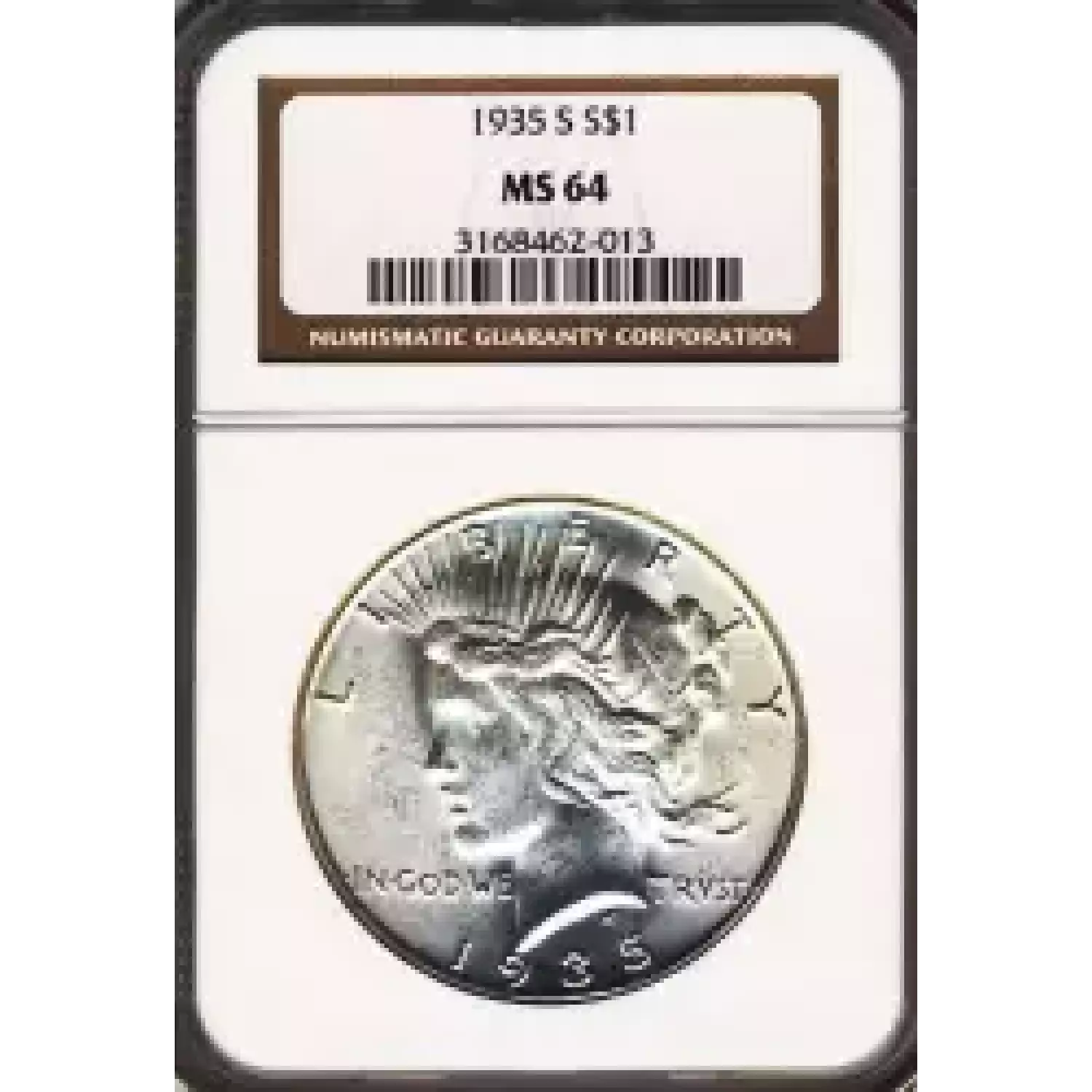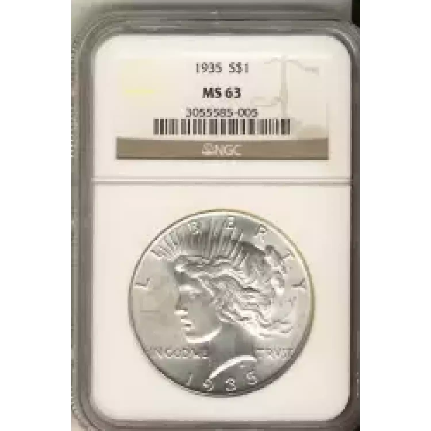 504750 | 1935-MS-64 Peace Silver Dollar PCGS MS-64 | PCGS | MS-64 | Sold: 09/04/2009 | $200 |