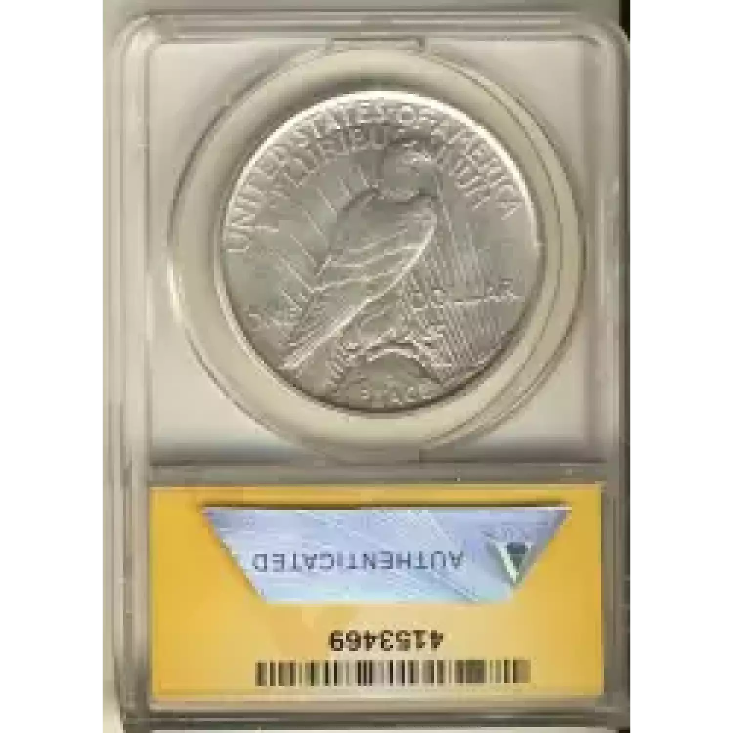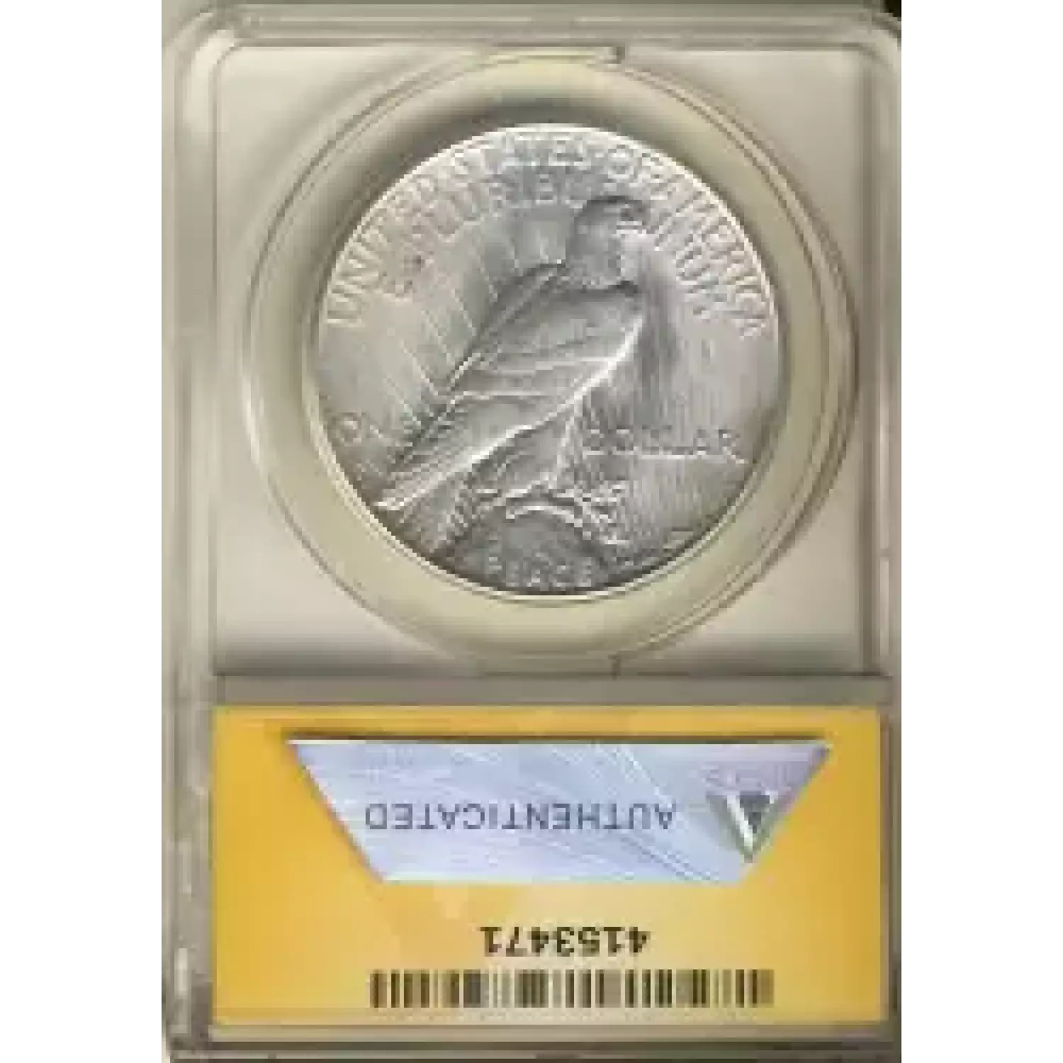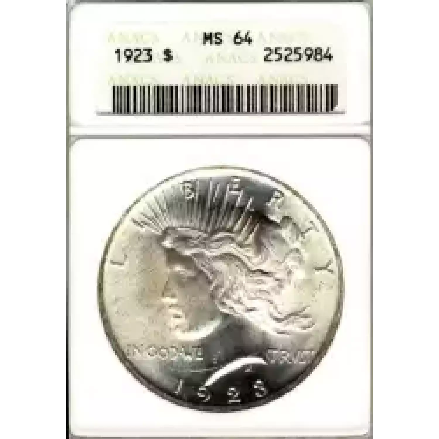 504919 | 1923-AU-55 Peace Silver Dollar ANACS AU-55 | ANACS | AU-55 | Sold: 10/09/2010 | $45 |