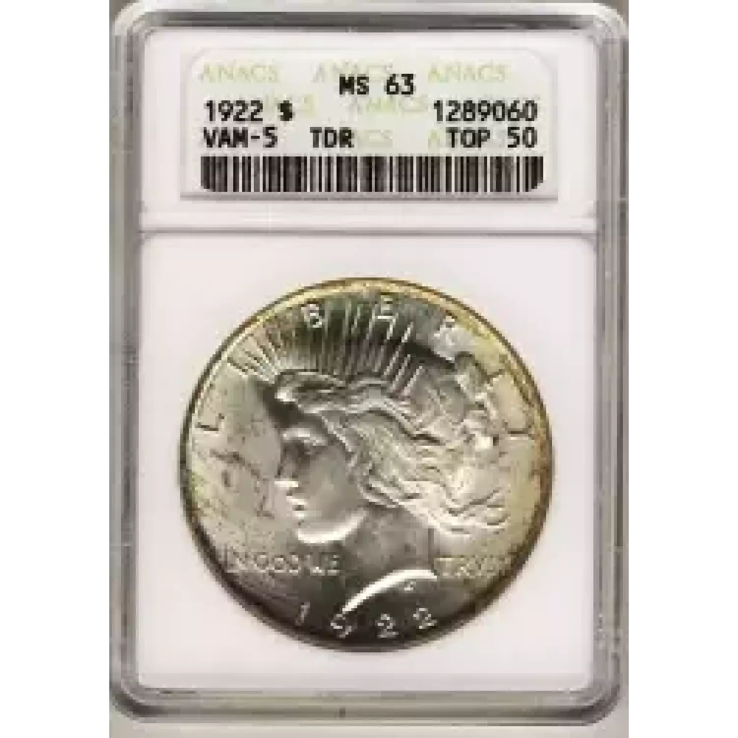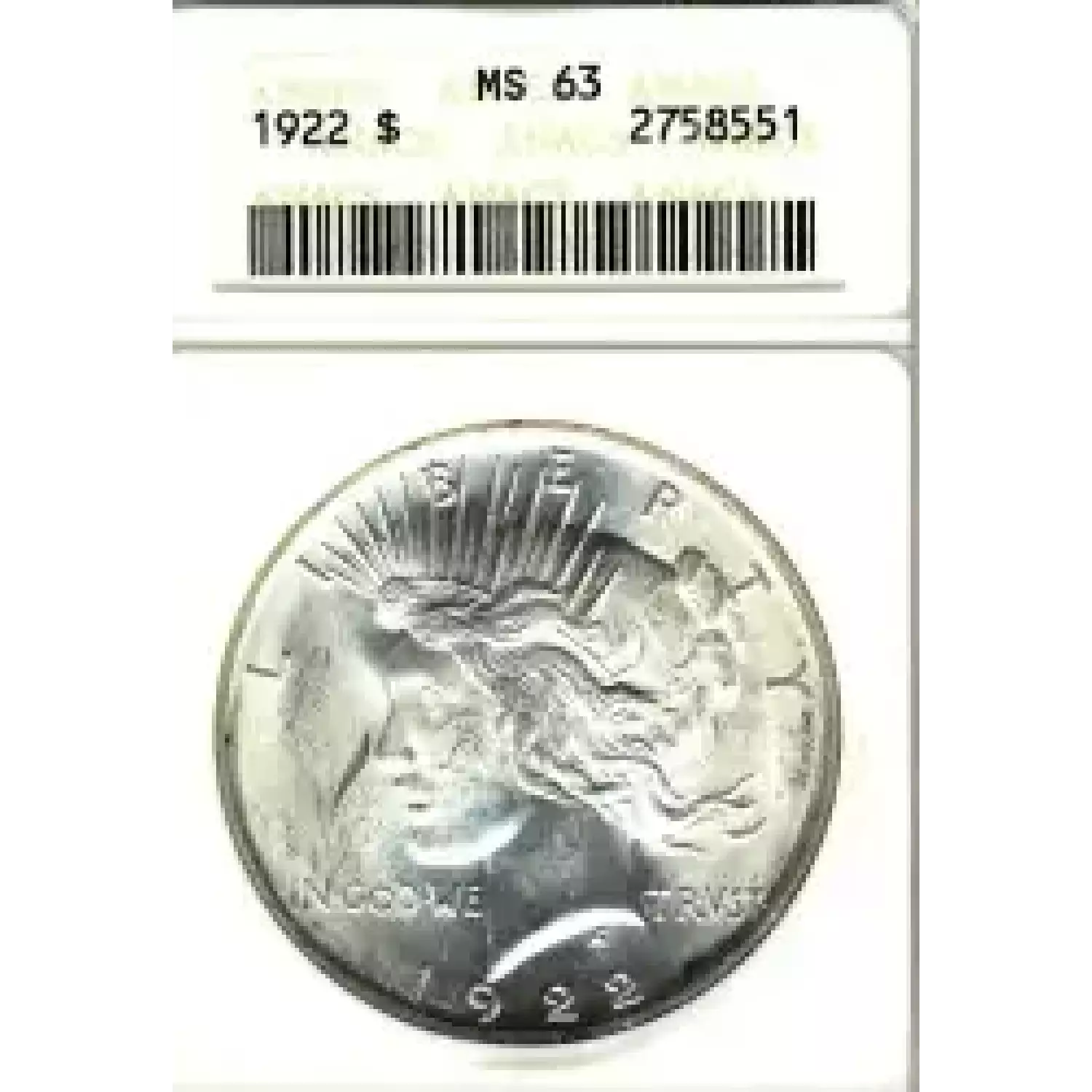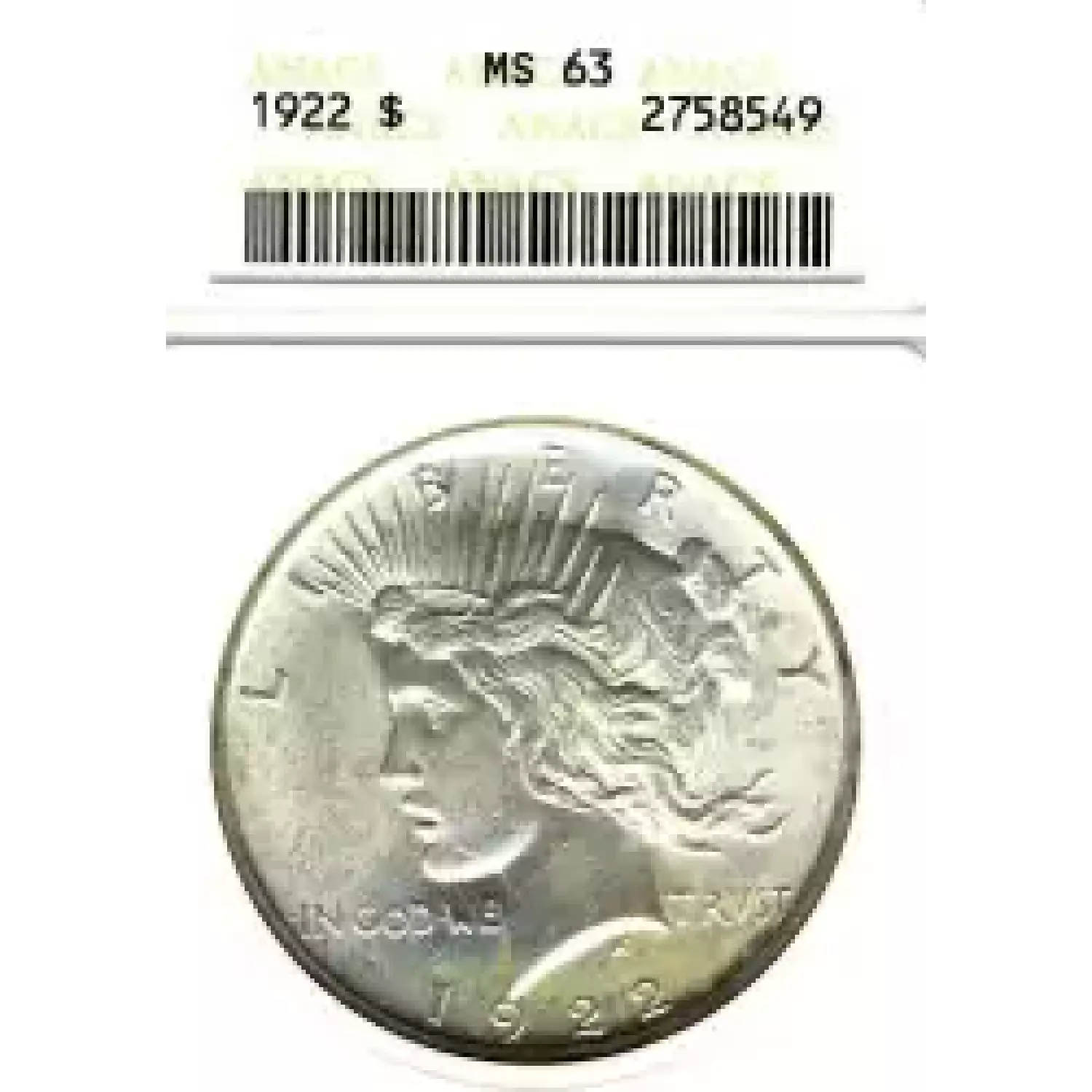 505203 | 1922-MS-63 Peace Silver Dollar ANACS MS-63 | ANACS | MS-63 | Sold: 10/06/2013 | $110 |