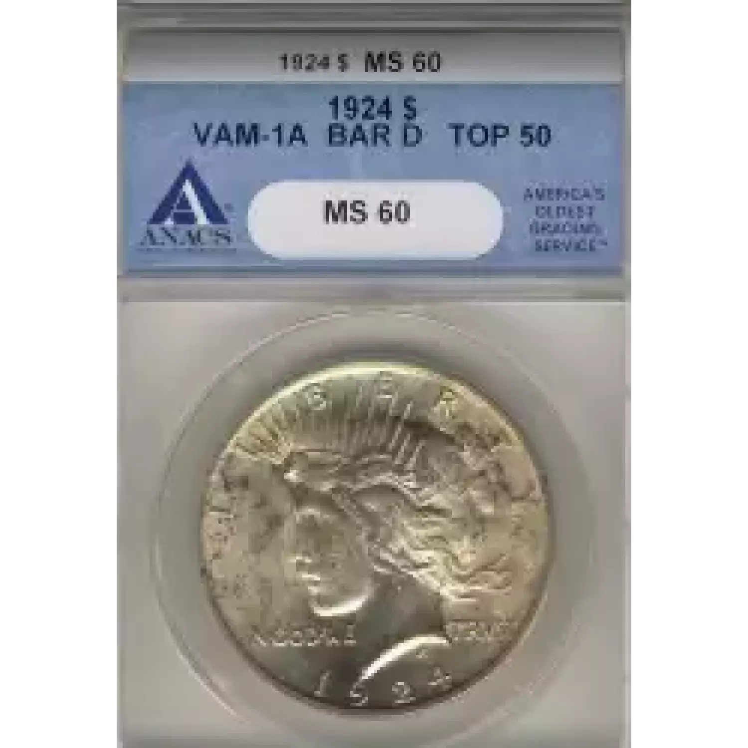 504412 | 1924-MS-60 Peace Silver Dollar ANACS MS-60 | ANACS | MS-60 | Sold: 04/01/2009 | $150 |