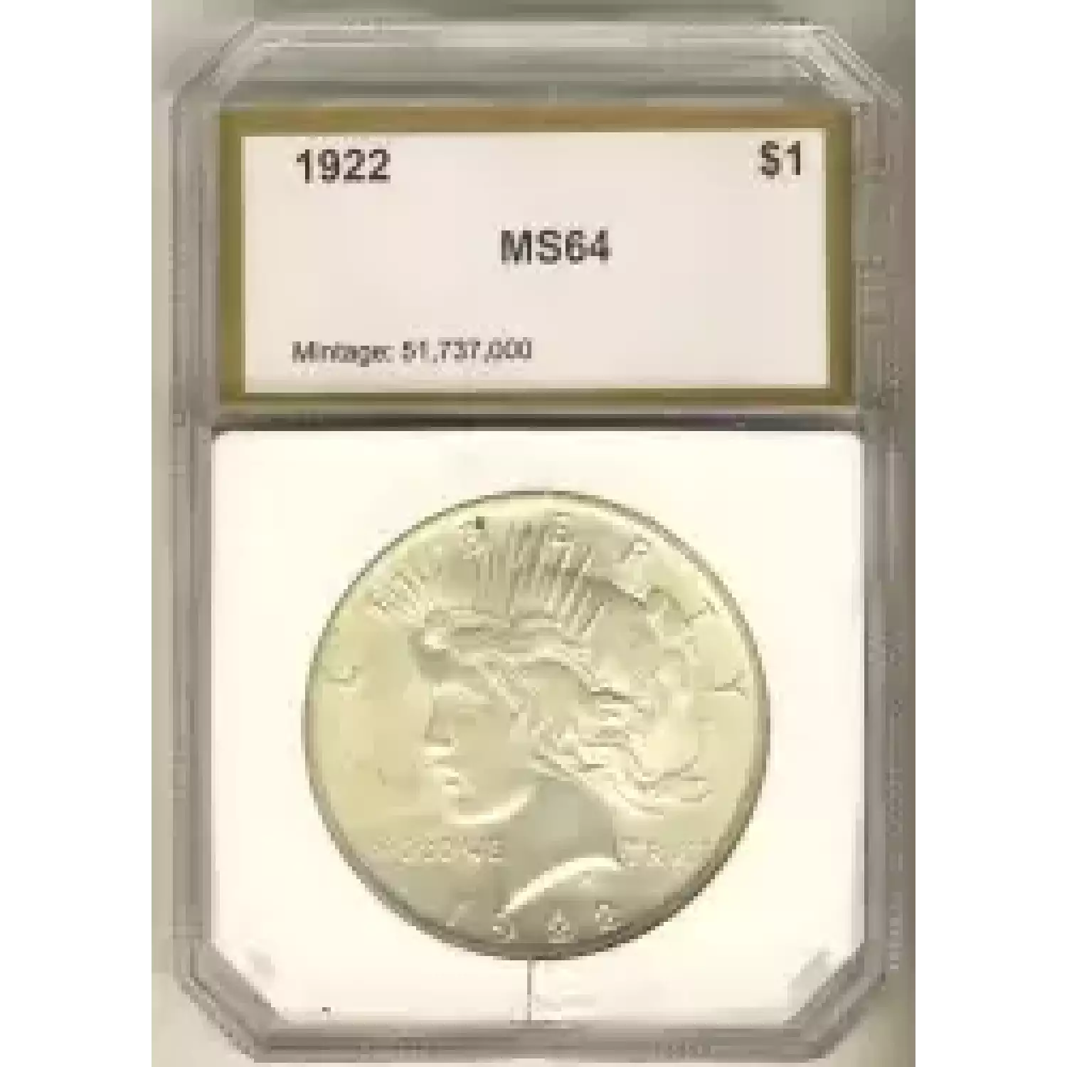 504872 | 1922-MS-61 Peace Silver Dollar PCGS MS-61 | PCGS | MS-61 | Sold: 04/07/2009 | $75 |
