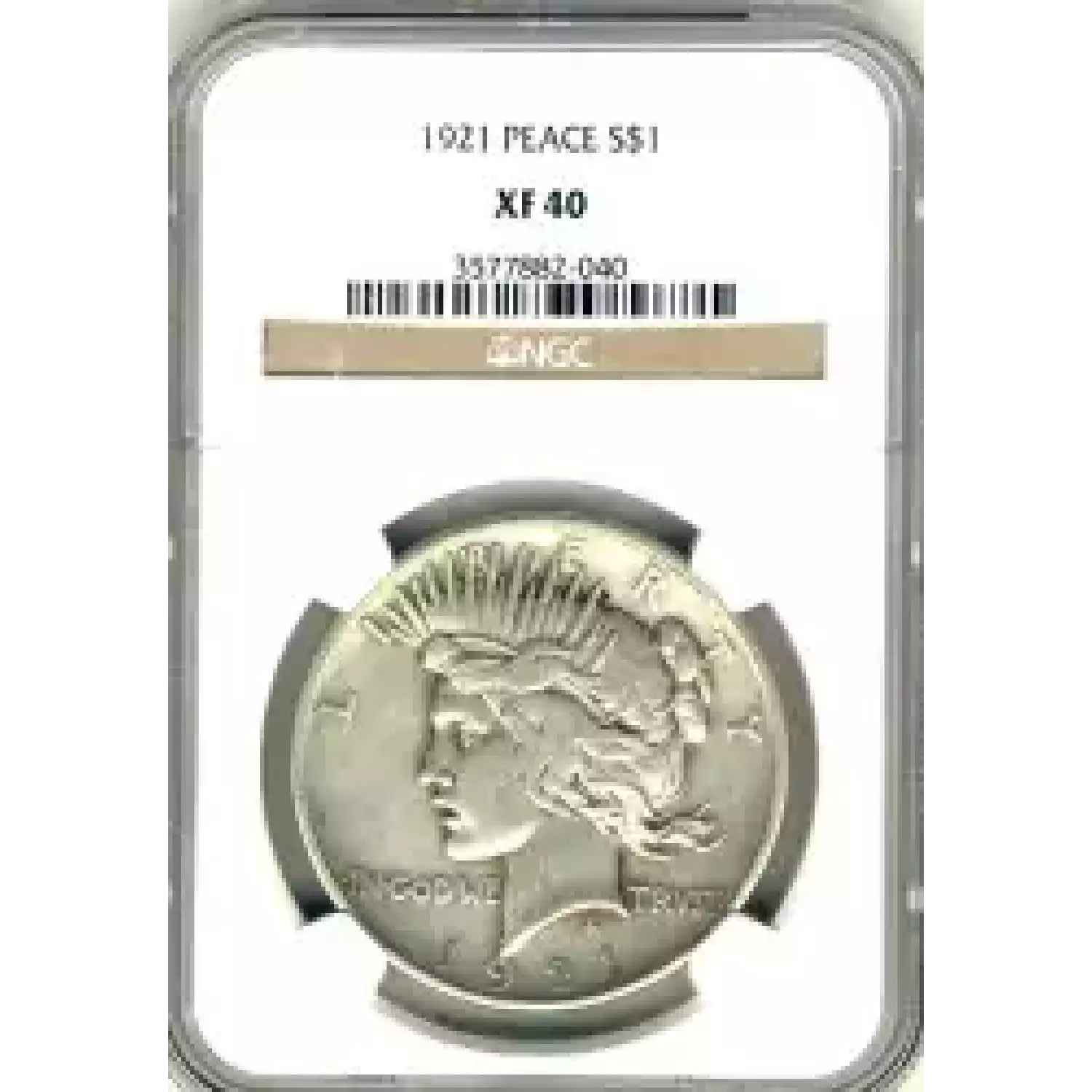 506145 | 1921-XF-40 Peace Silver Dollar NGC XF-40 | NGC | XF-40 | Sold: 19/08/2012 | $120.50 |
