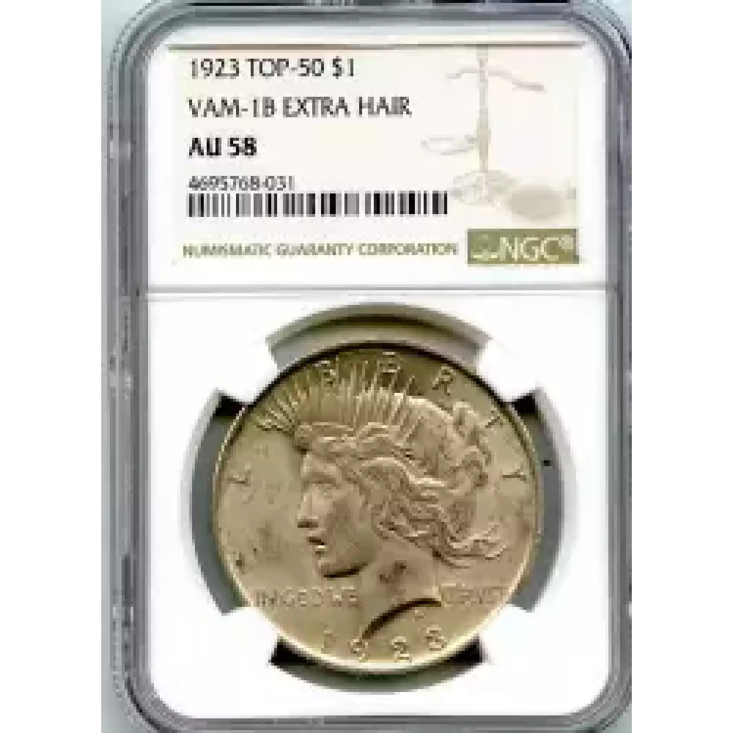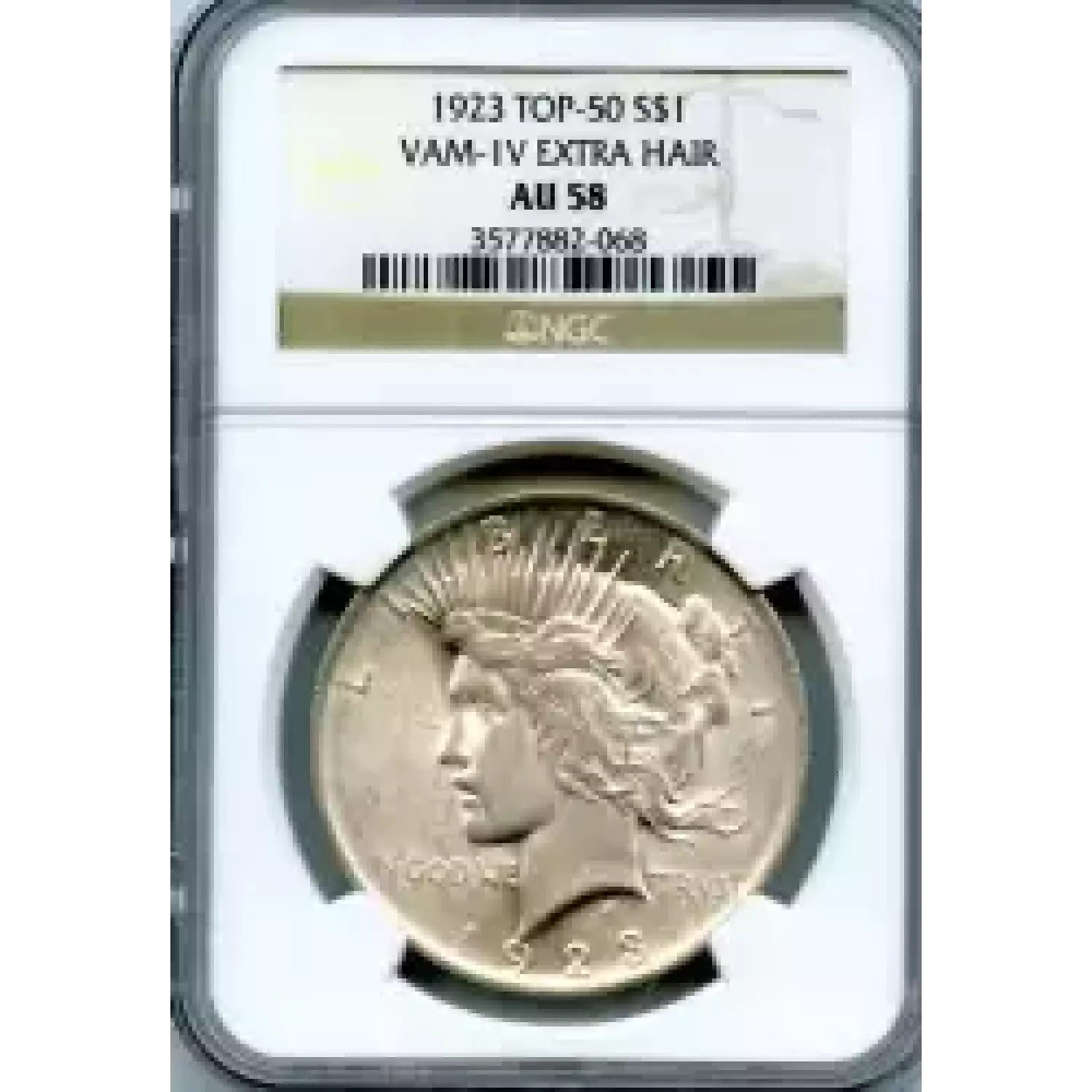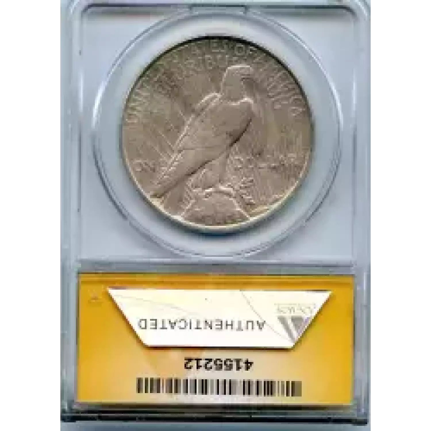 506172 | 1923-AU-58 Peace Silver Dollar NGC AU-58 | NGC | AU-58 | Sold: 08/03/2015 | $75 |
