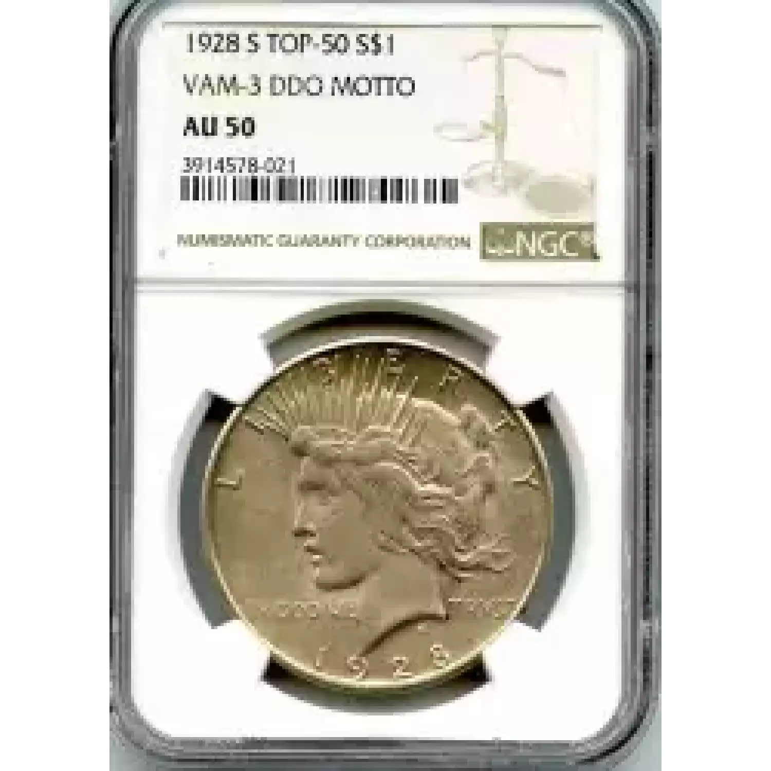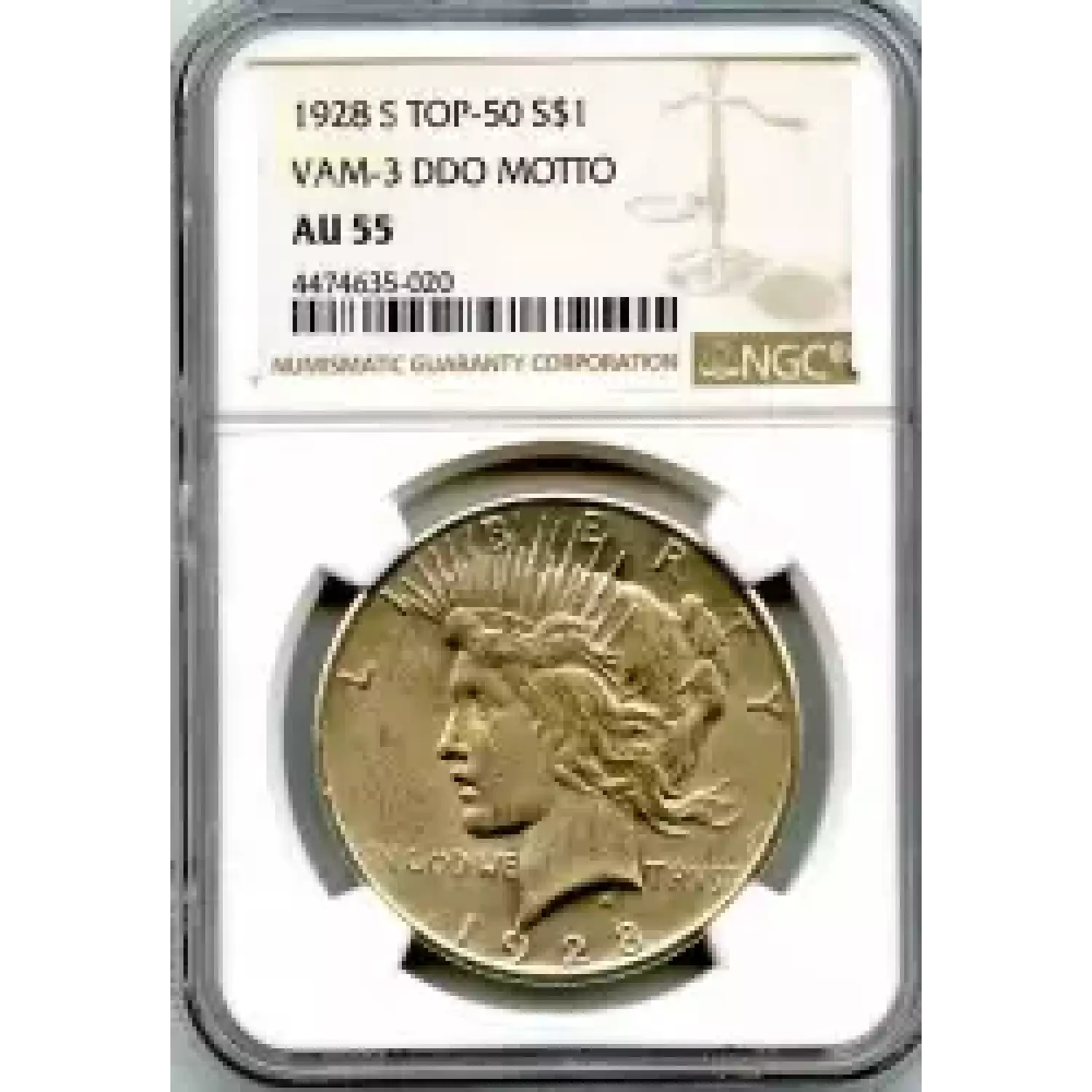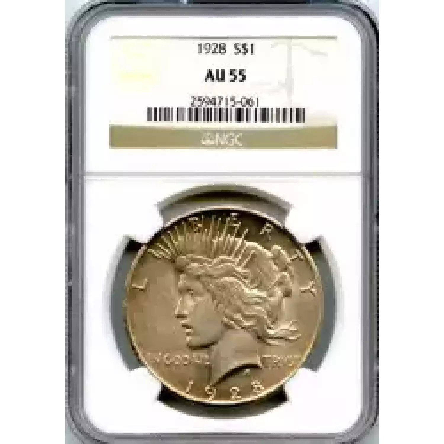 512629 | 1928-AU-55 Peace Silver Dollar NGC AU-55 | NGC | AU-55 | Sold: 03/09/2019 | $225 |